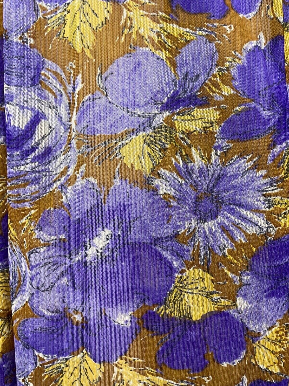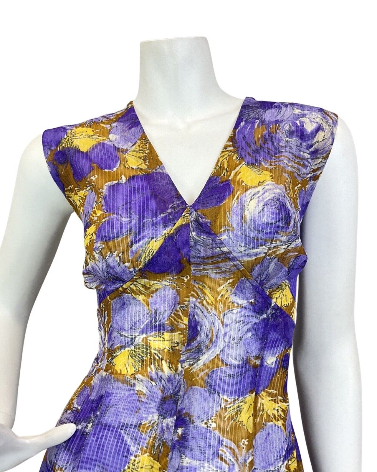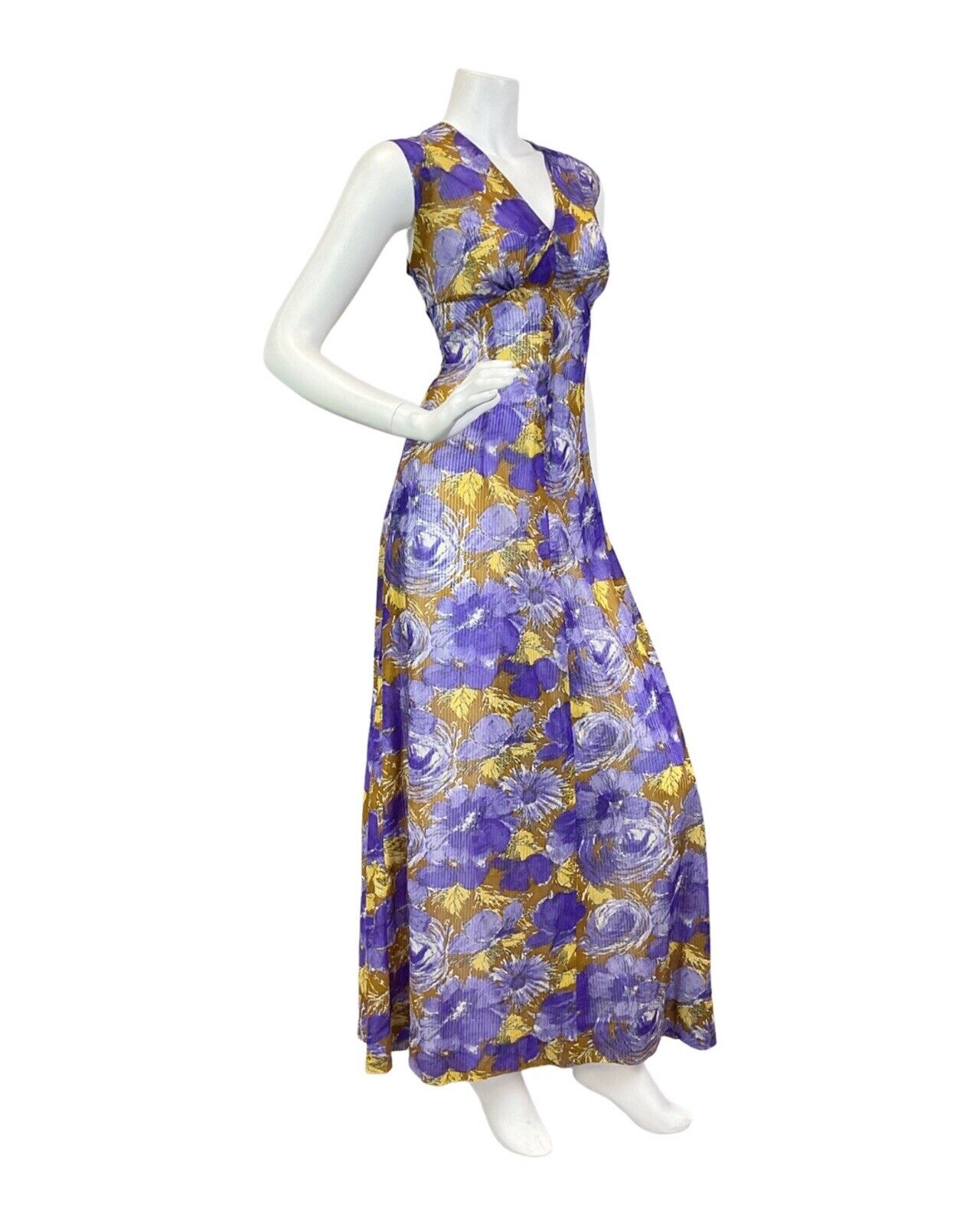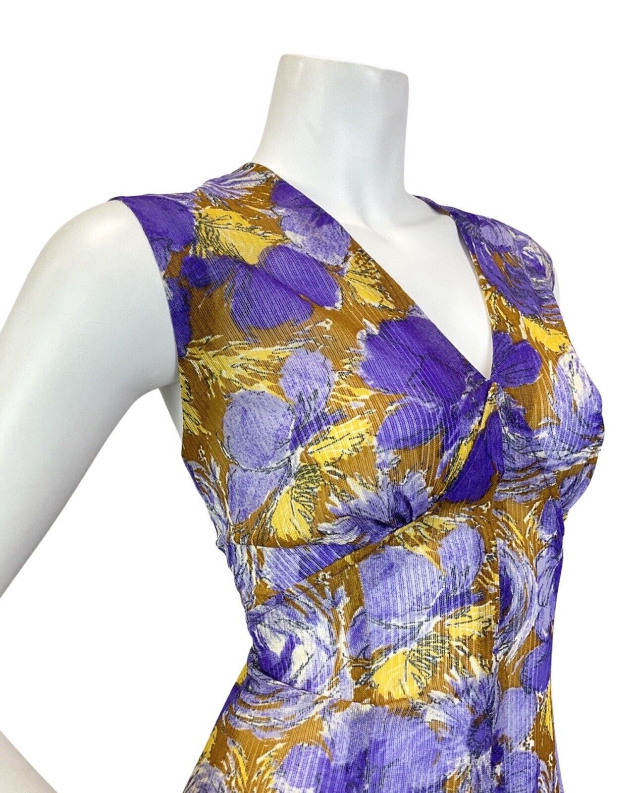VINTAGE 60s 70s PURPLE YELLOW BROWN PSYCHEDELIC FLORAL SLEEVELESS MAXI DRESS 14
