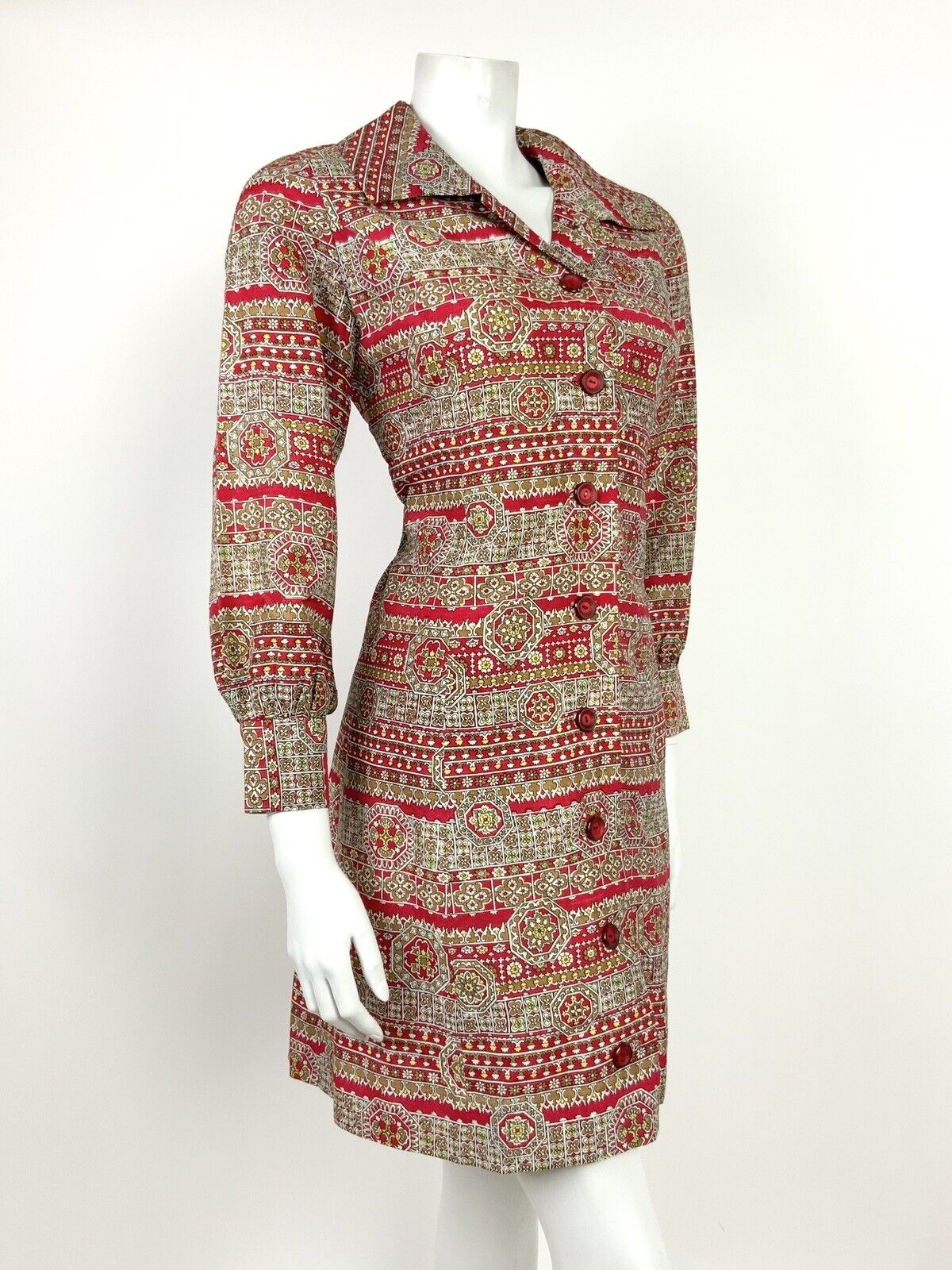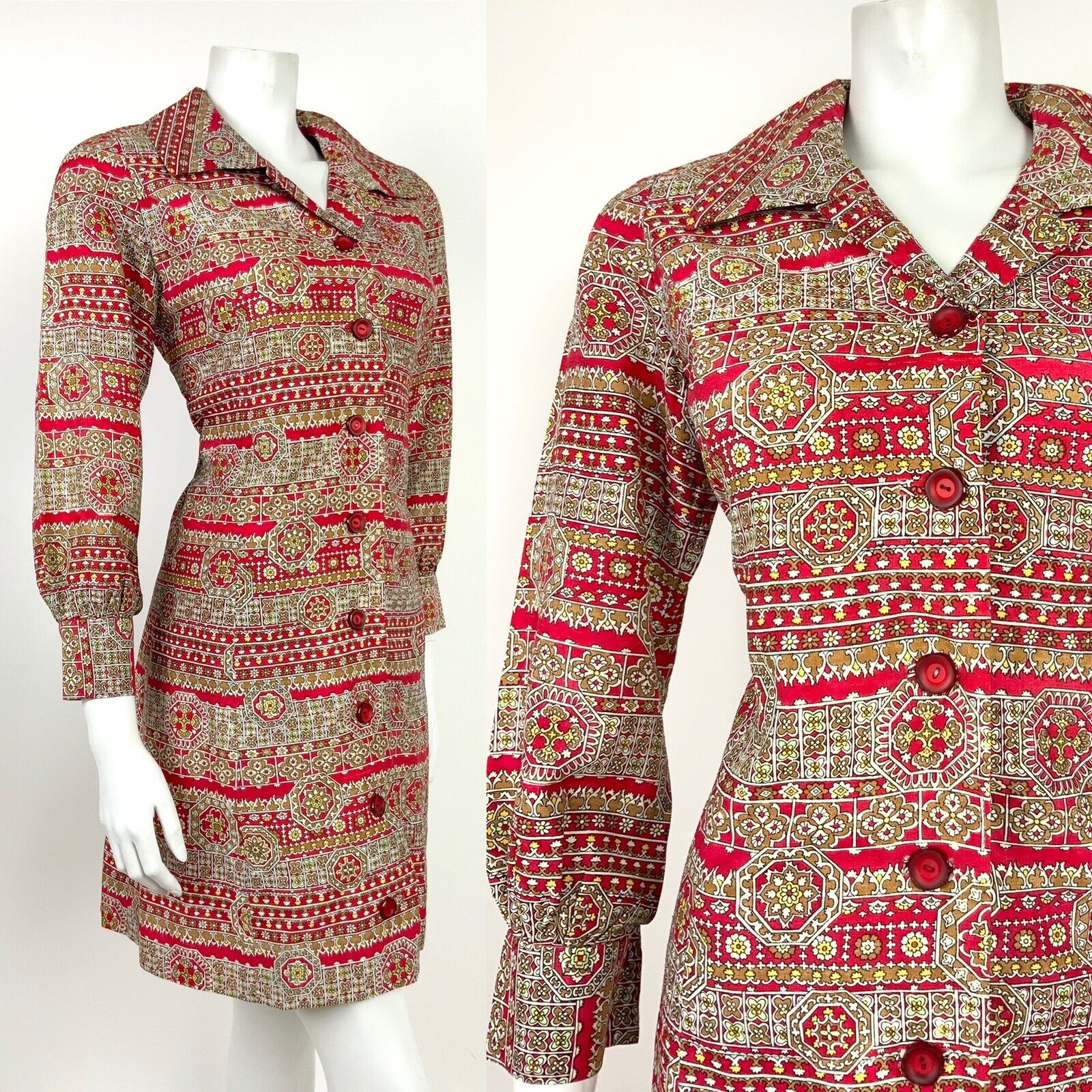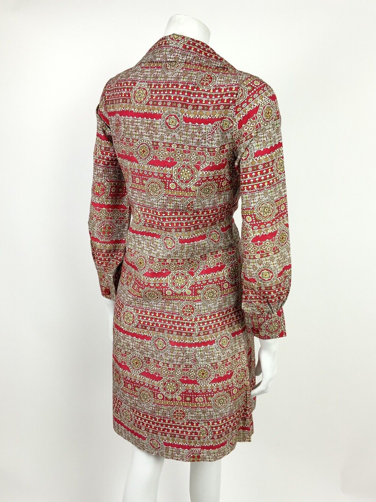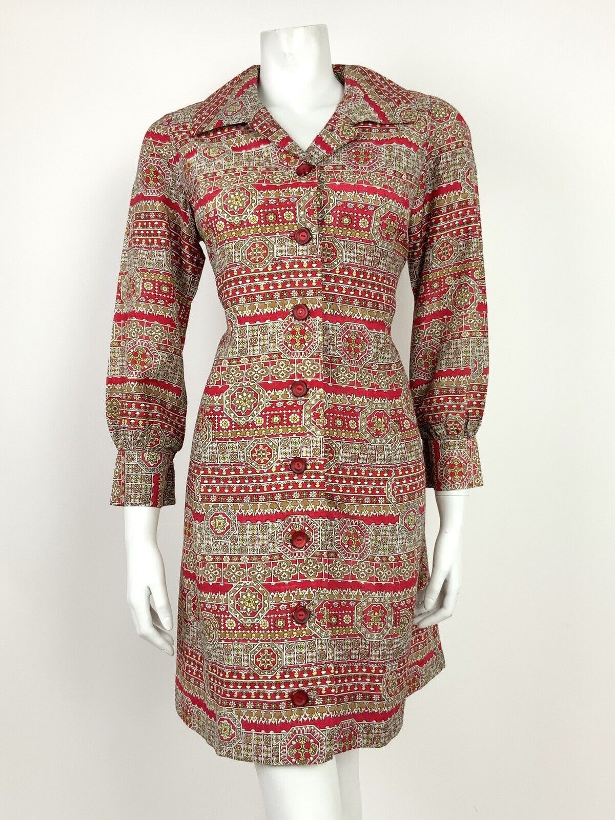 VINTAGE 60s 70s RED BEIGE YELLOW WHITE FLORAL GEOMETRIC SHIRT DRESS 12
