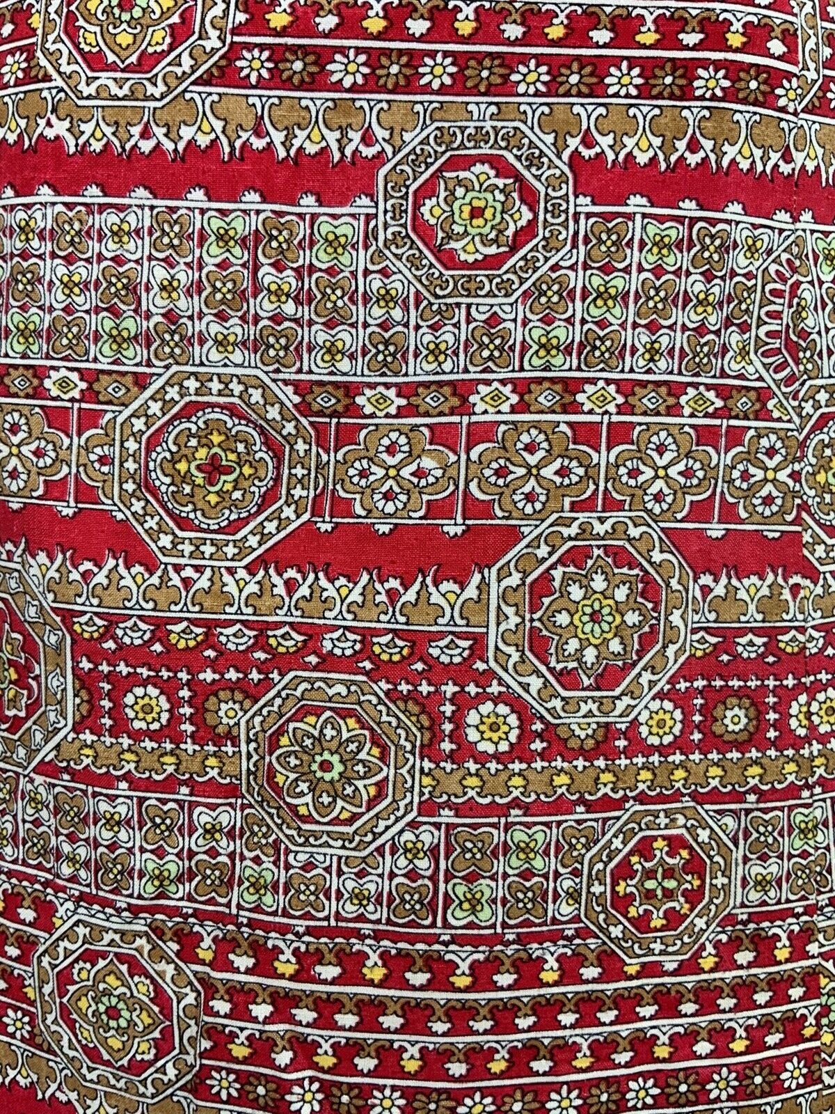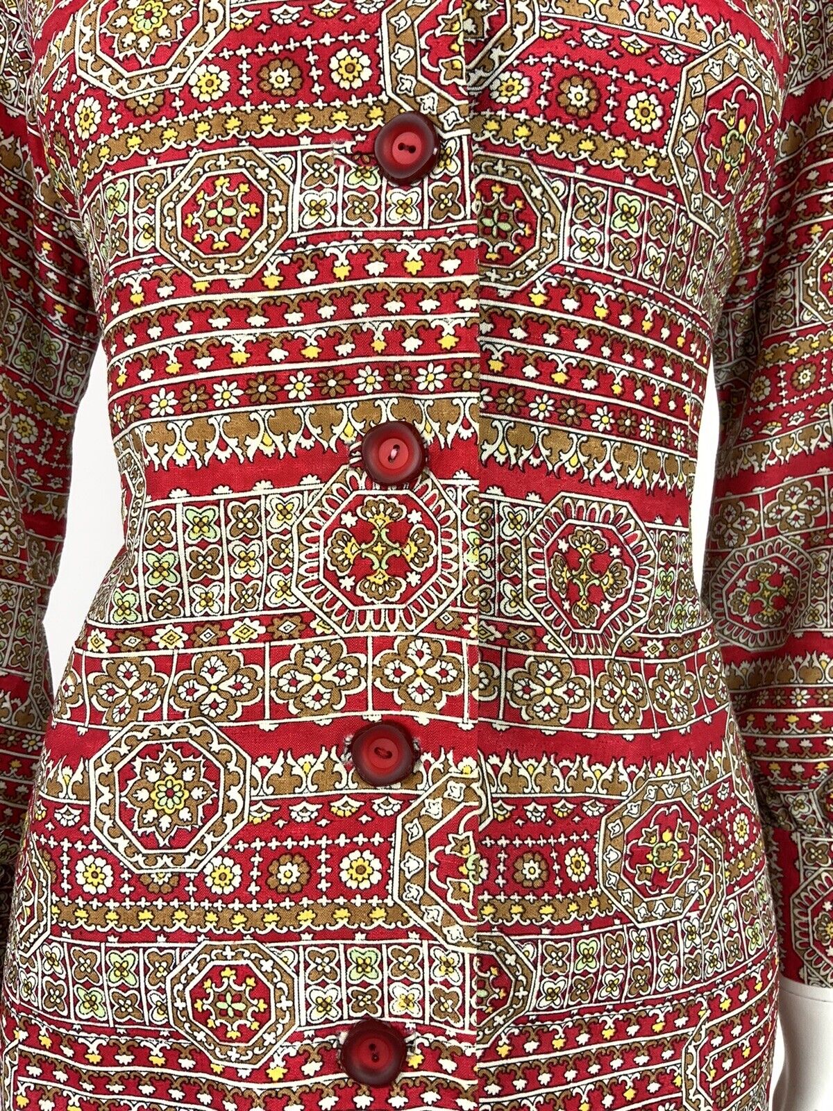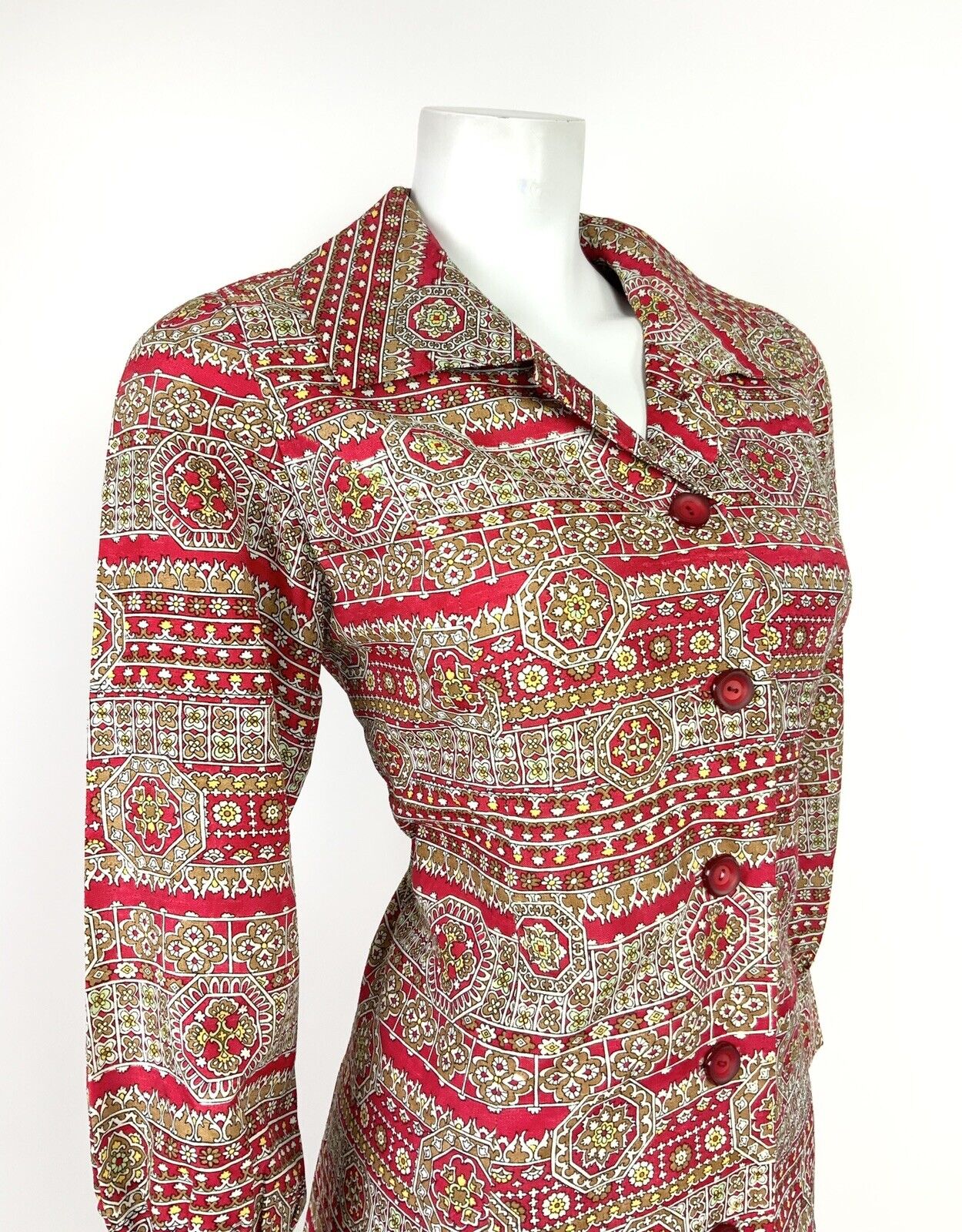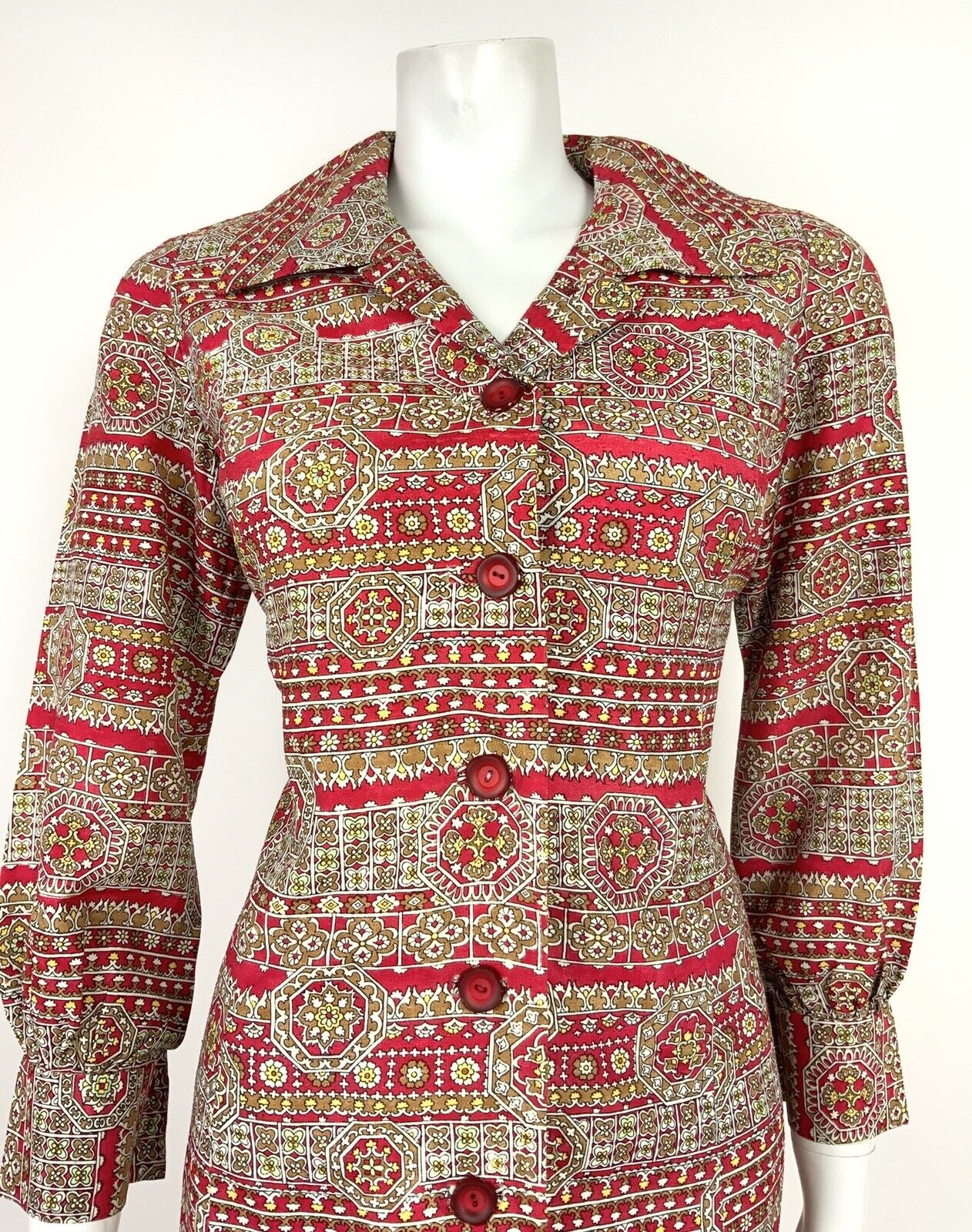 VINTAGE 60s 70s RED BEIGE YELLOW WHITE FLORAL GEOMETRIC SHIRT DRESS 12