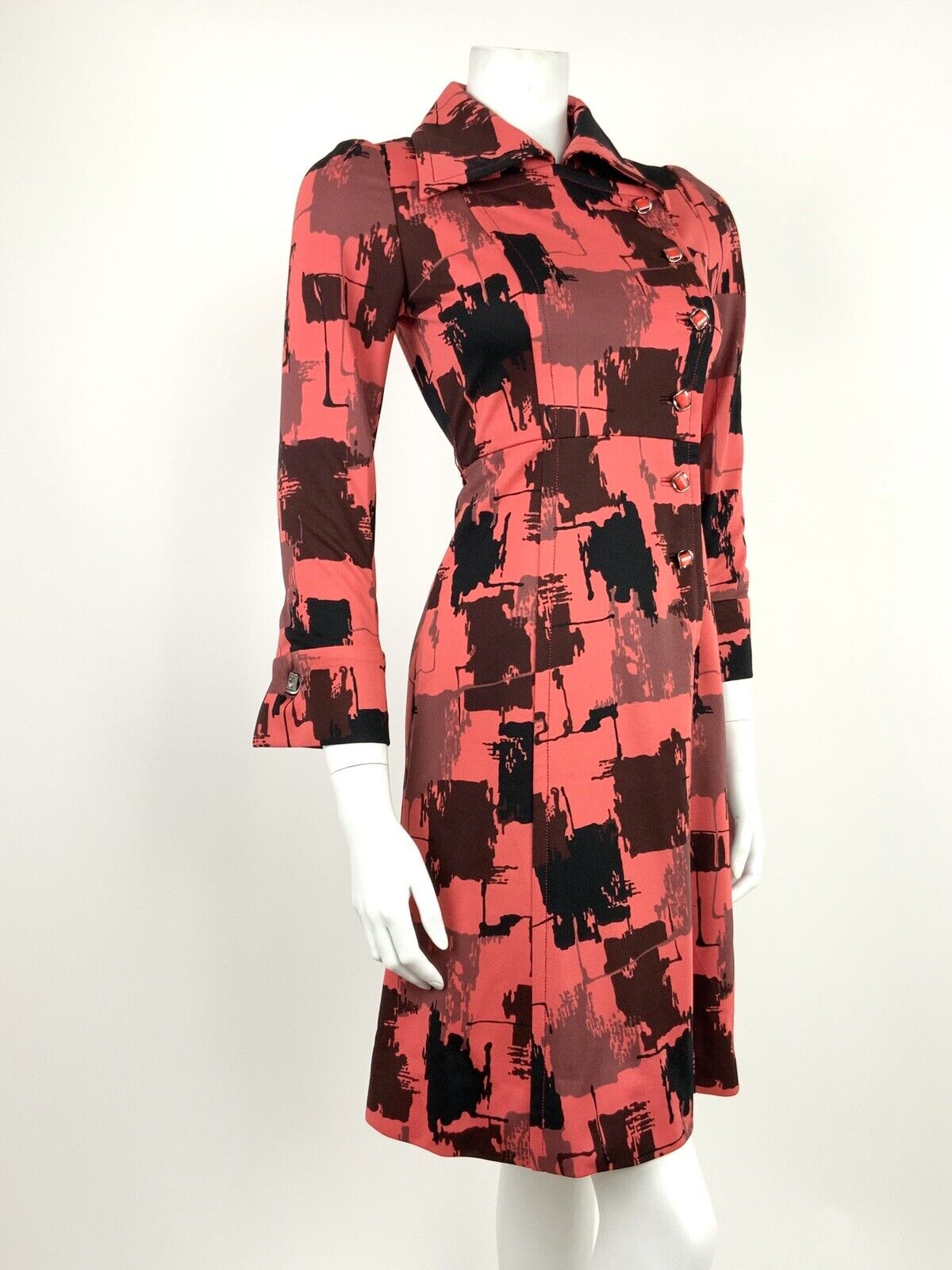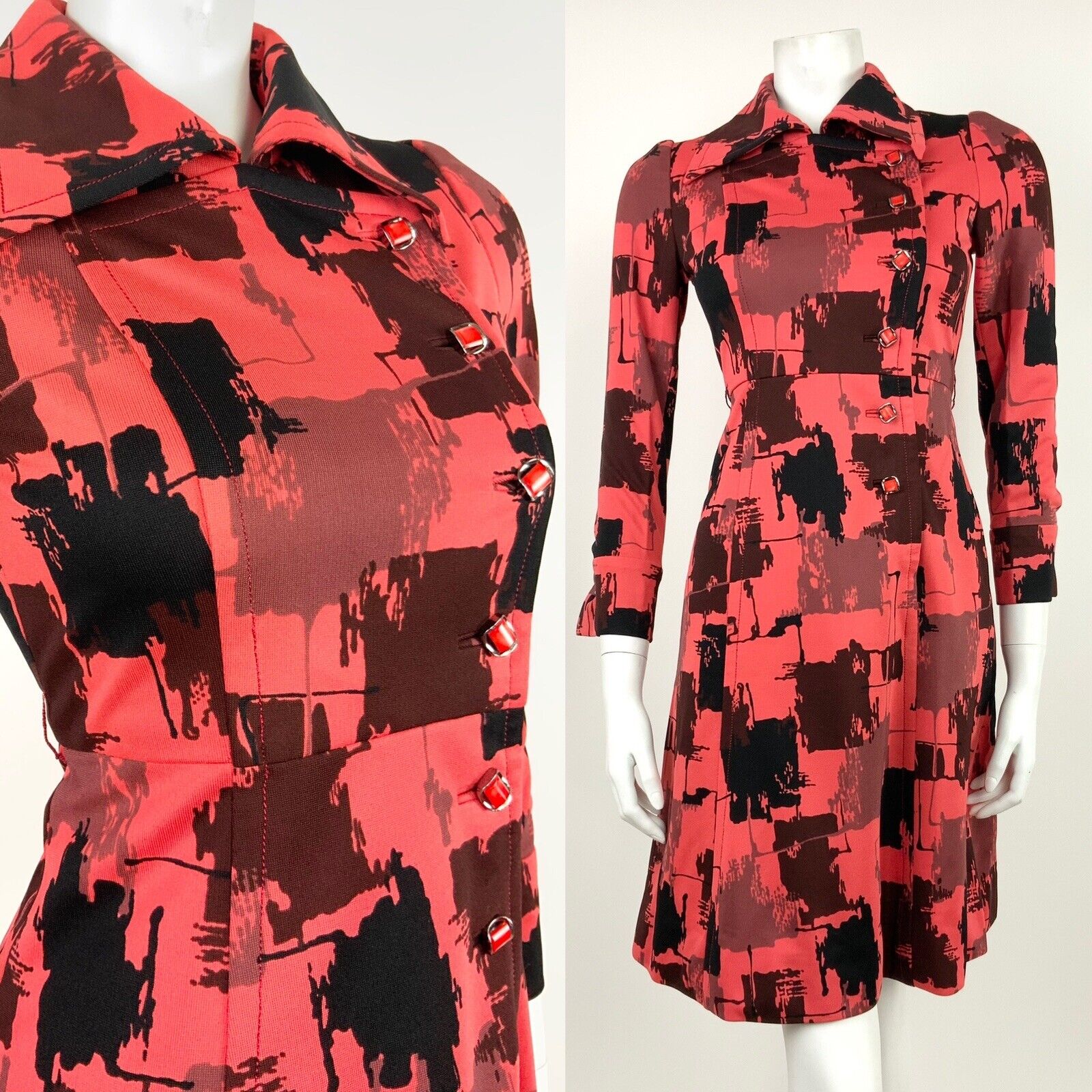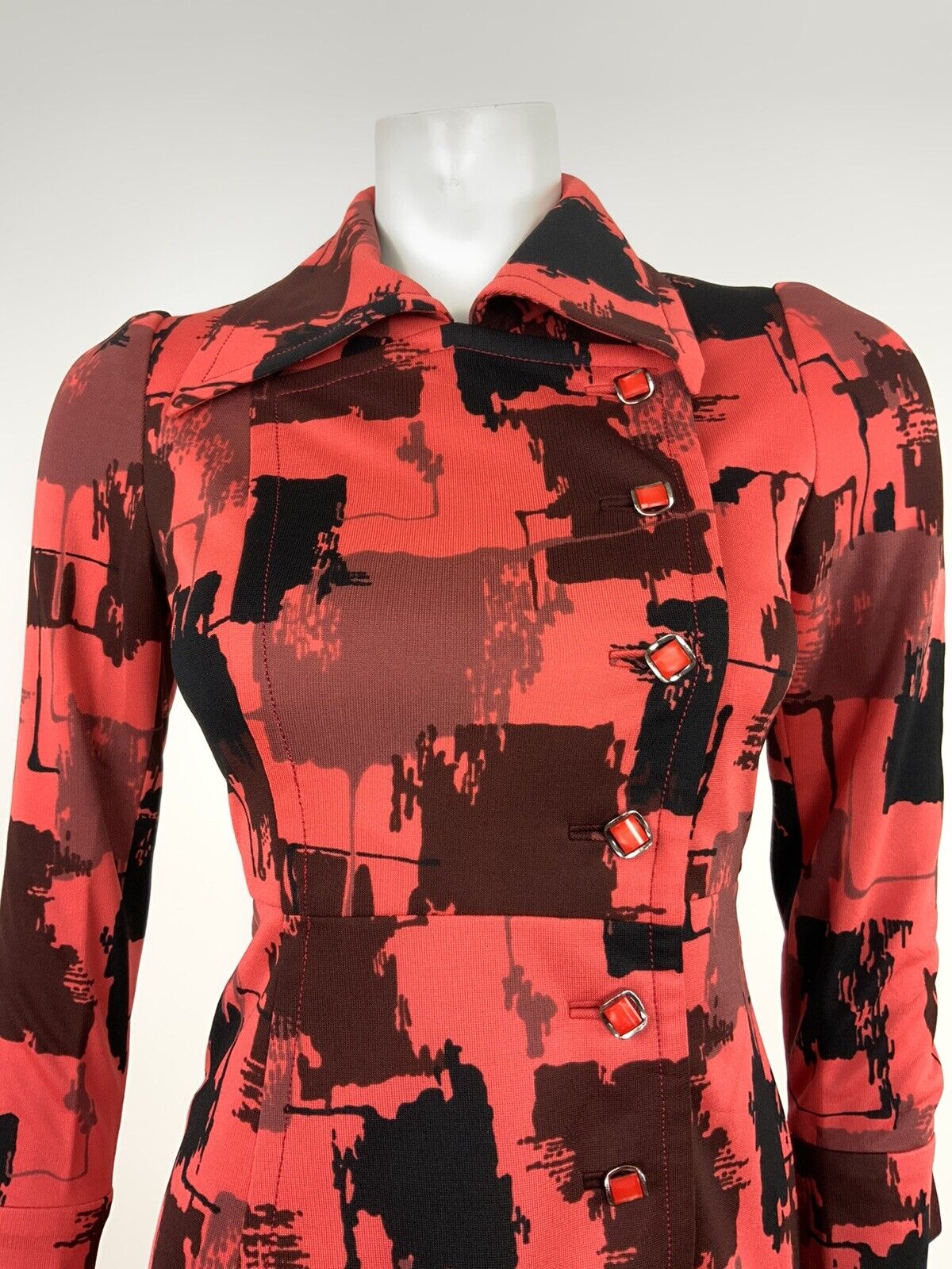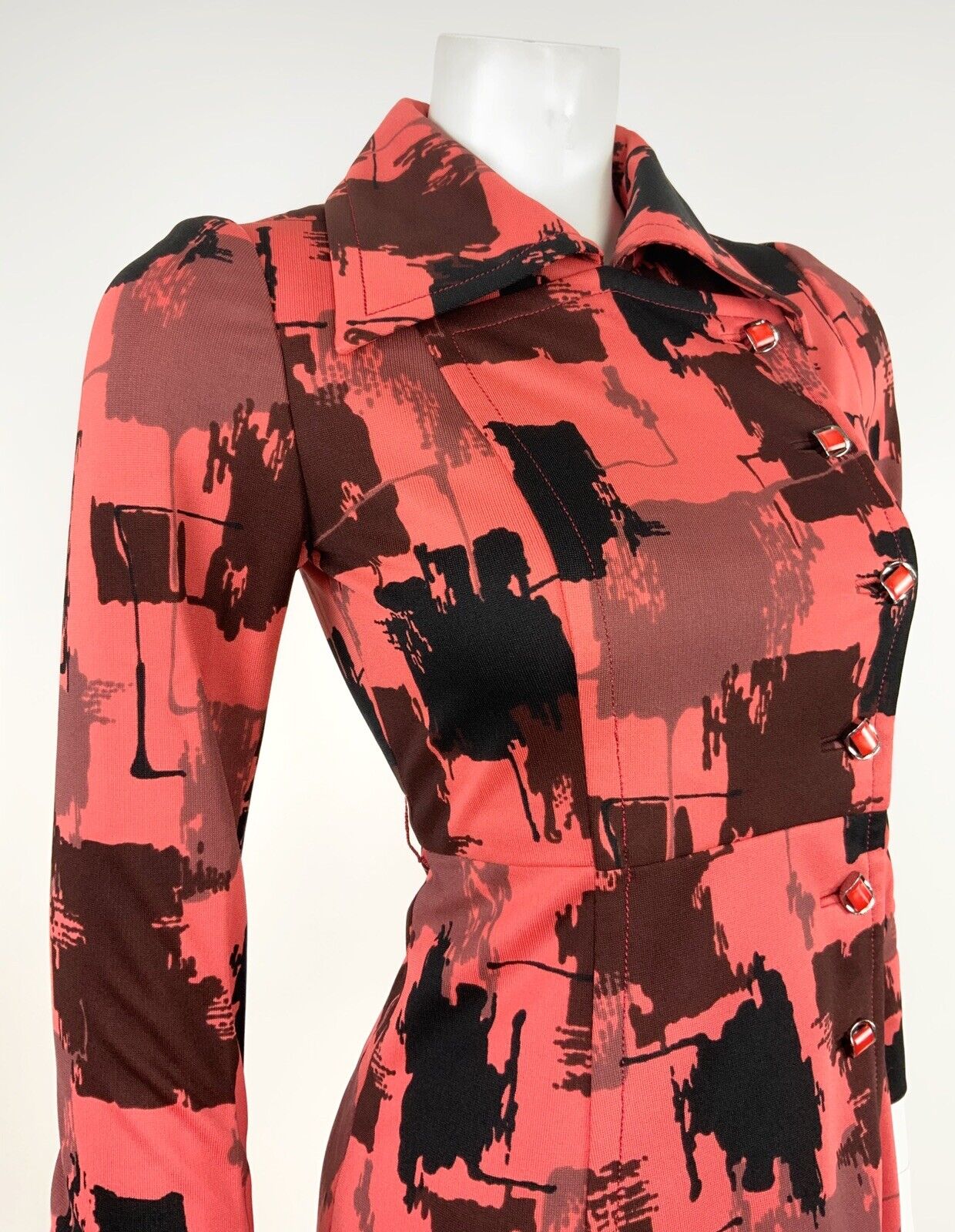 VINTAGE 60s 70s RED BLACK BROWN ABSTRACT SQUARE WING COLLAR ASYMMETRIC DRESS 8