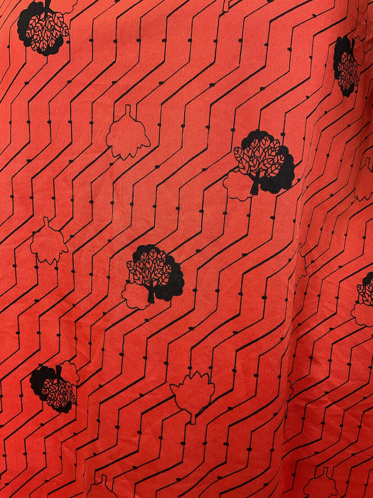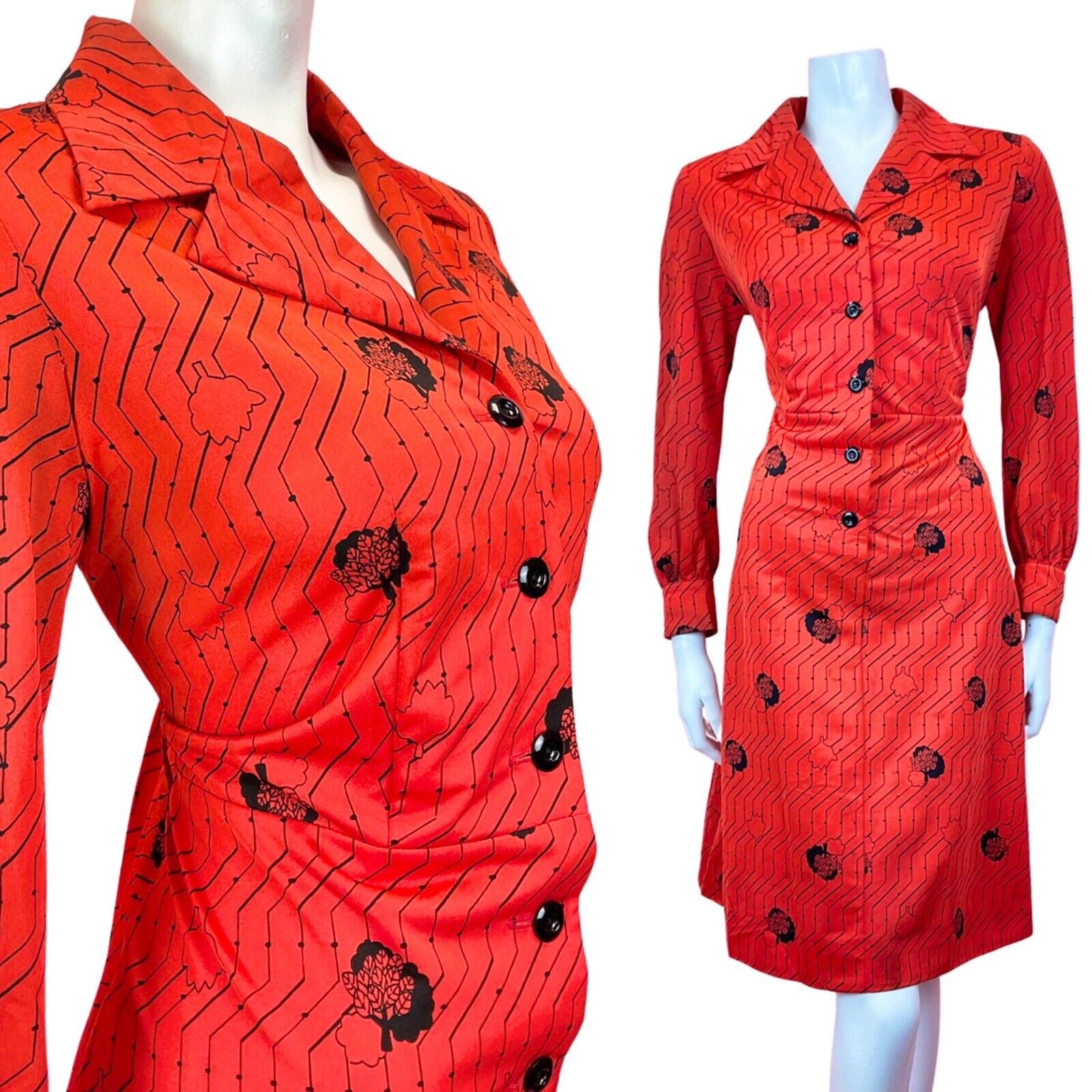VINTAGE 60s 70s RED BLACK ZIG-ZAG TREE LEAFY MOD DAGGER SHIRT DRESS 14 16