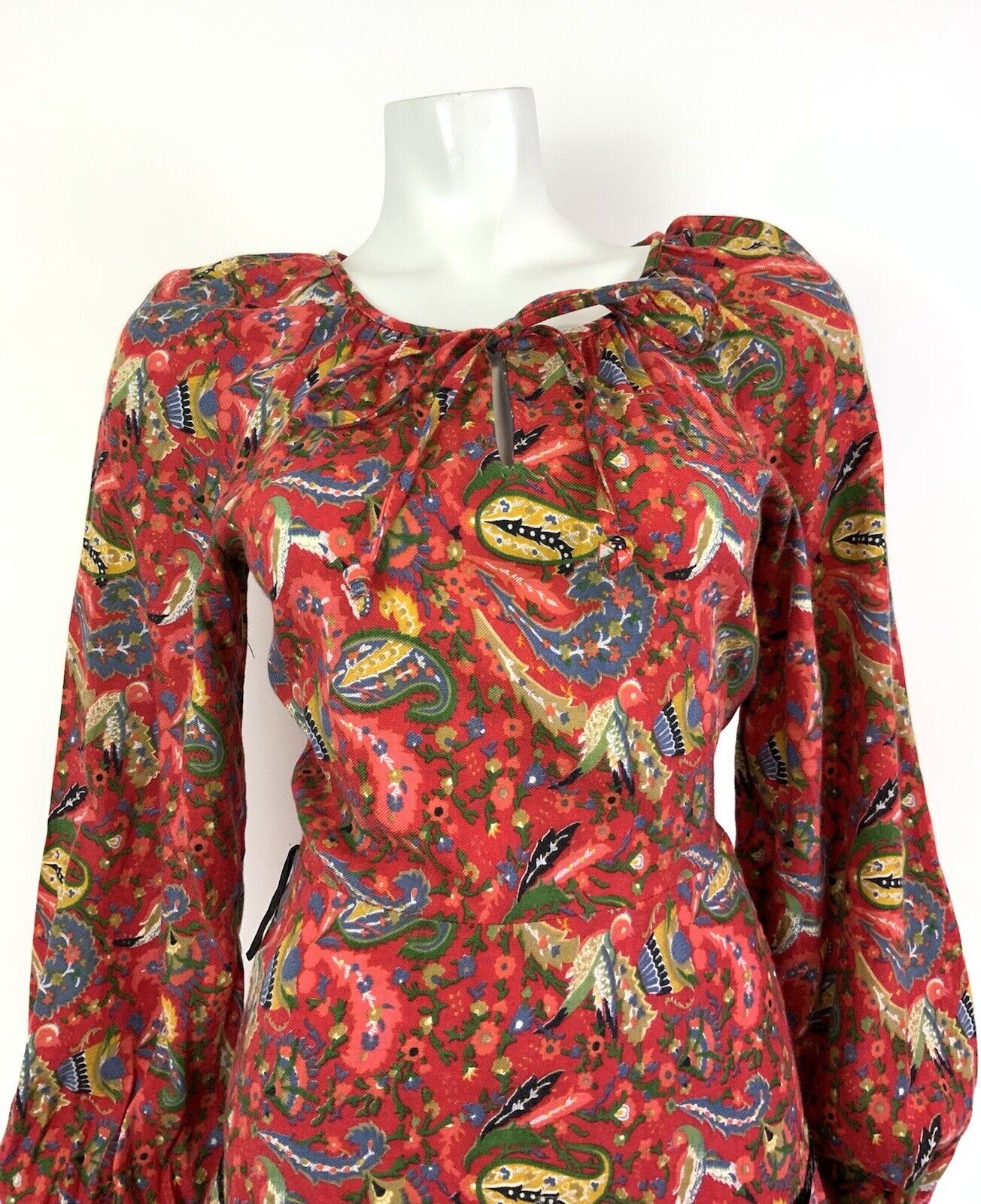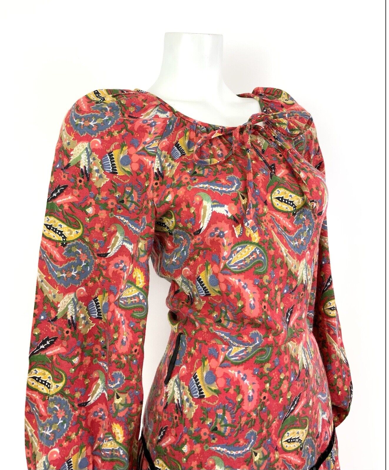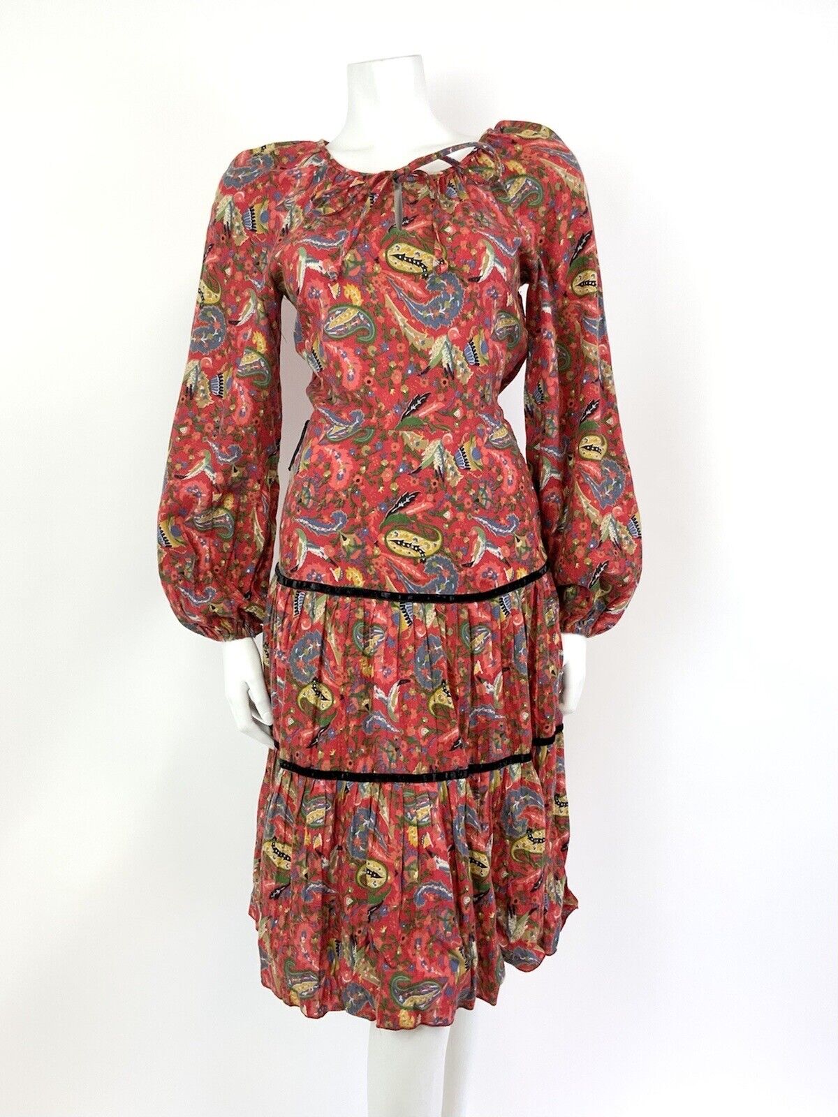 VINTAGE 60s 70s RED BLUE GREEN BLACK PAISLEY FLORAL FOLK BOHO TIERED DRESS 6 8