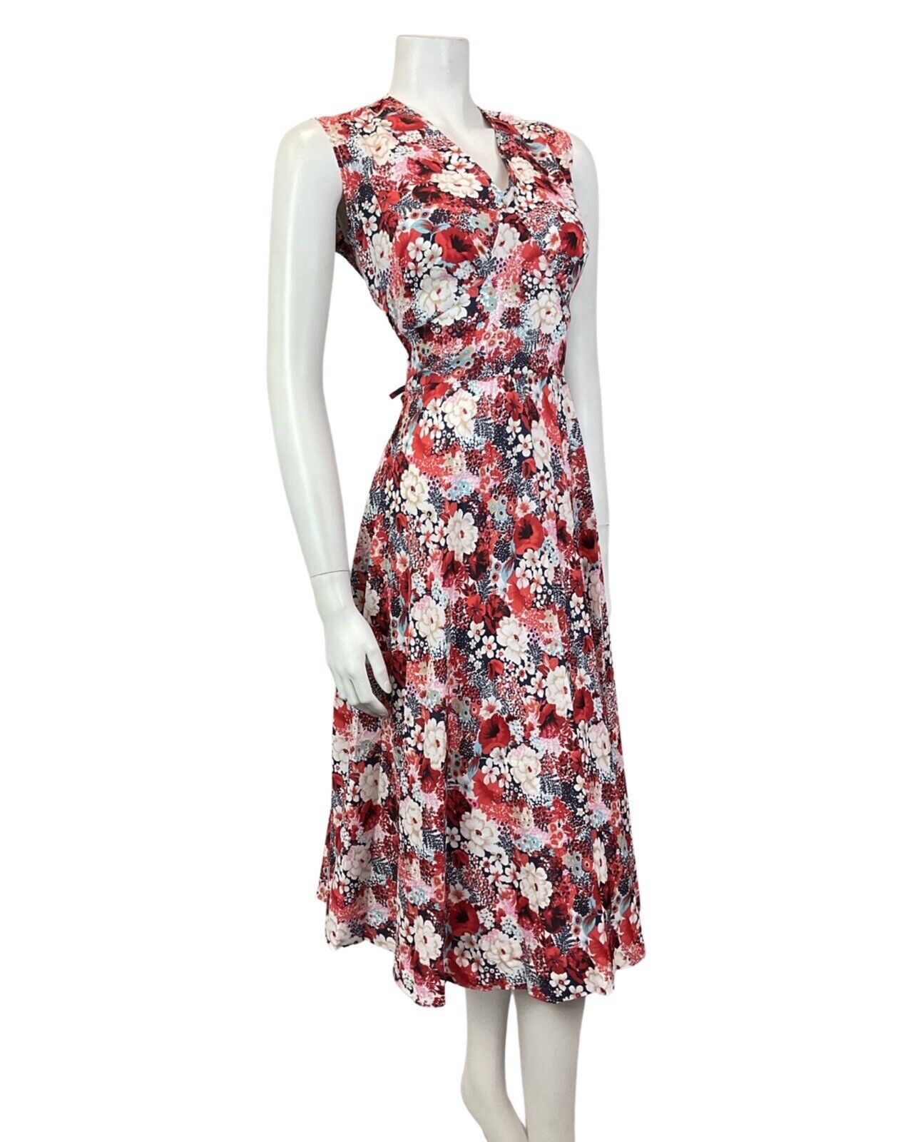 VINTAGE 60s 70s RED BLUE WHITE FLORAL DITSY SLEEVELESS SUMMER SWING DRESS 14