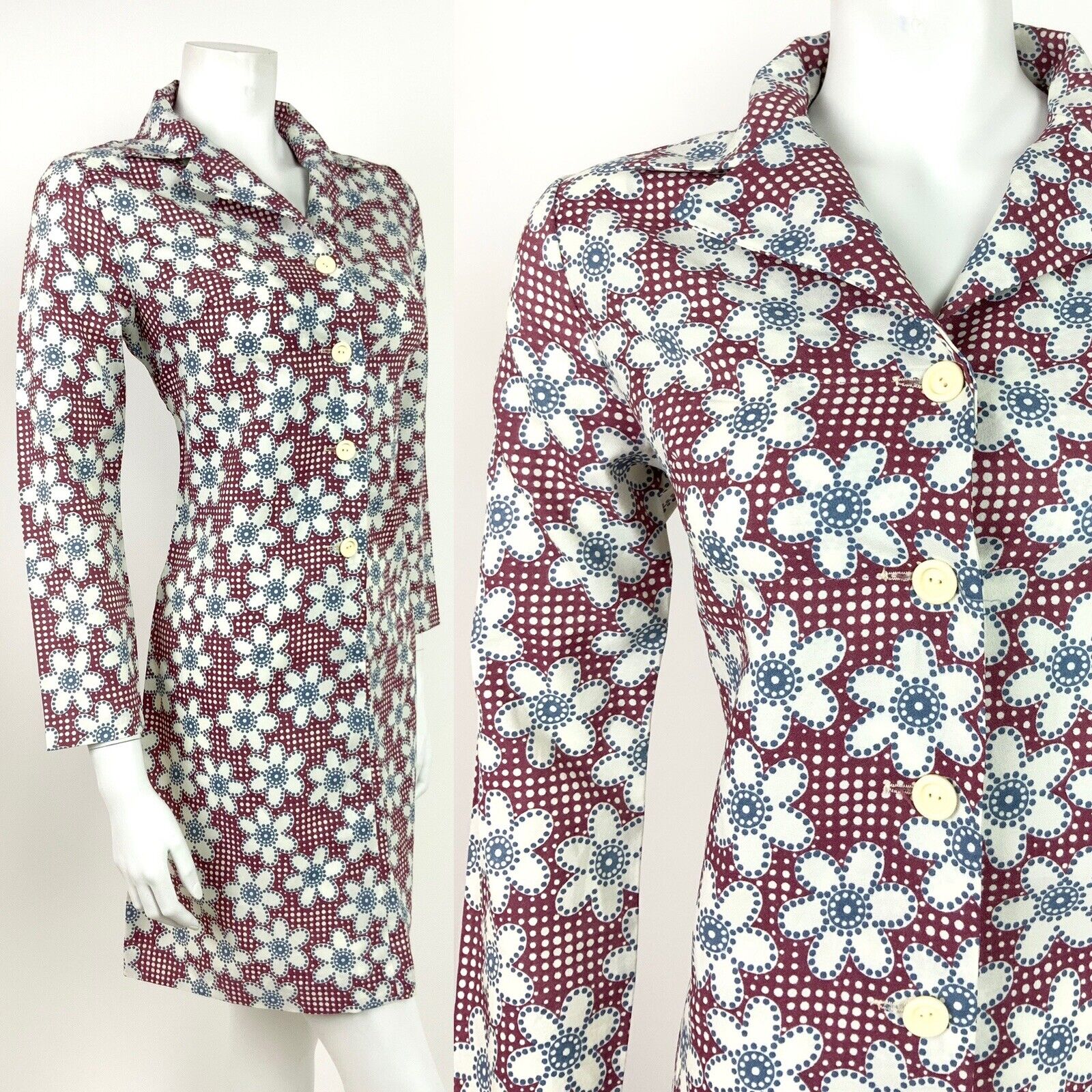 VINTAGE 60s 70s RED BLUE WHITE POLKA DOT FLORAL DAISY MOD SHIRT DRESS 8 10