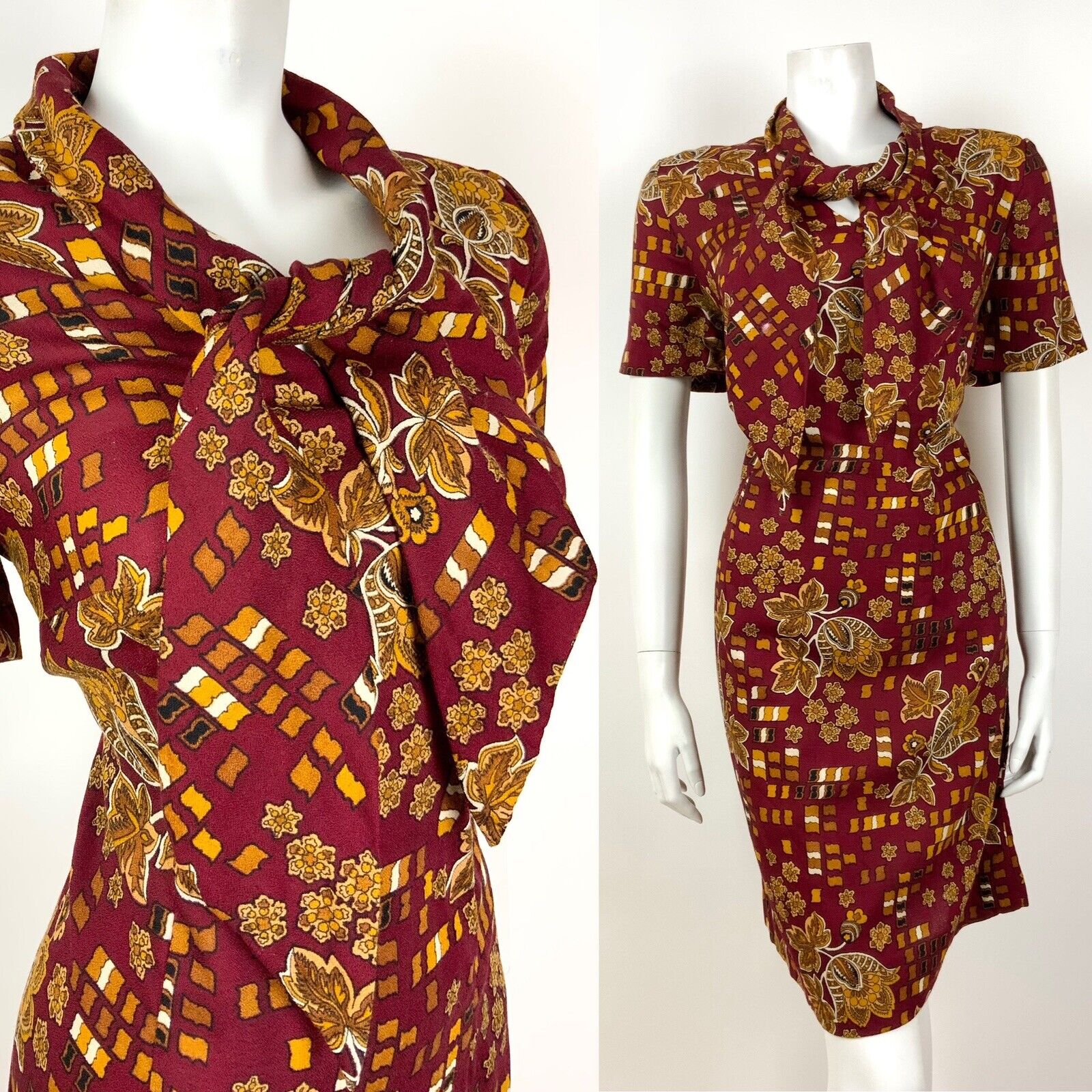 VINTAGE 60s 70s RED BROWN GOLD BLACK FLORAL PAISLEY SQUARE SHIFT DRESS 14 16