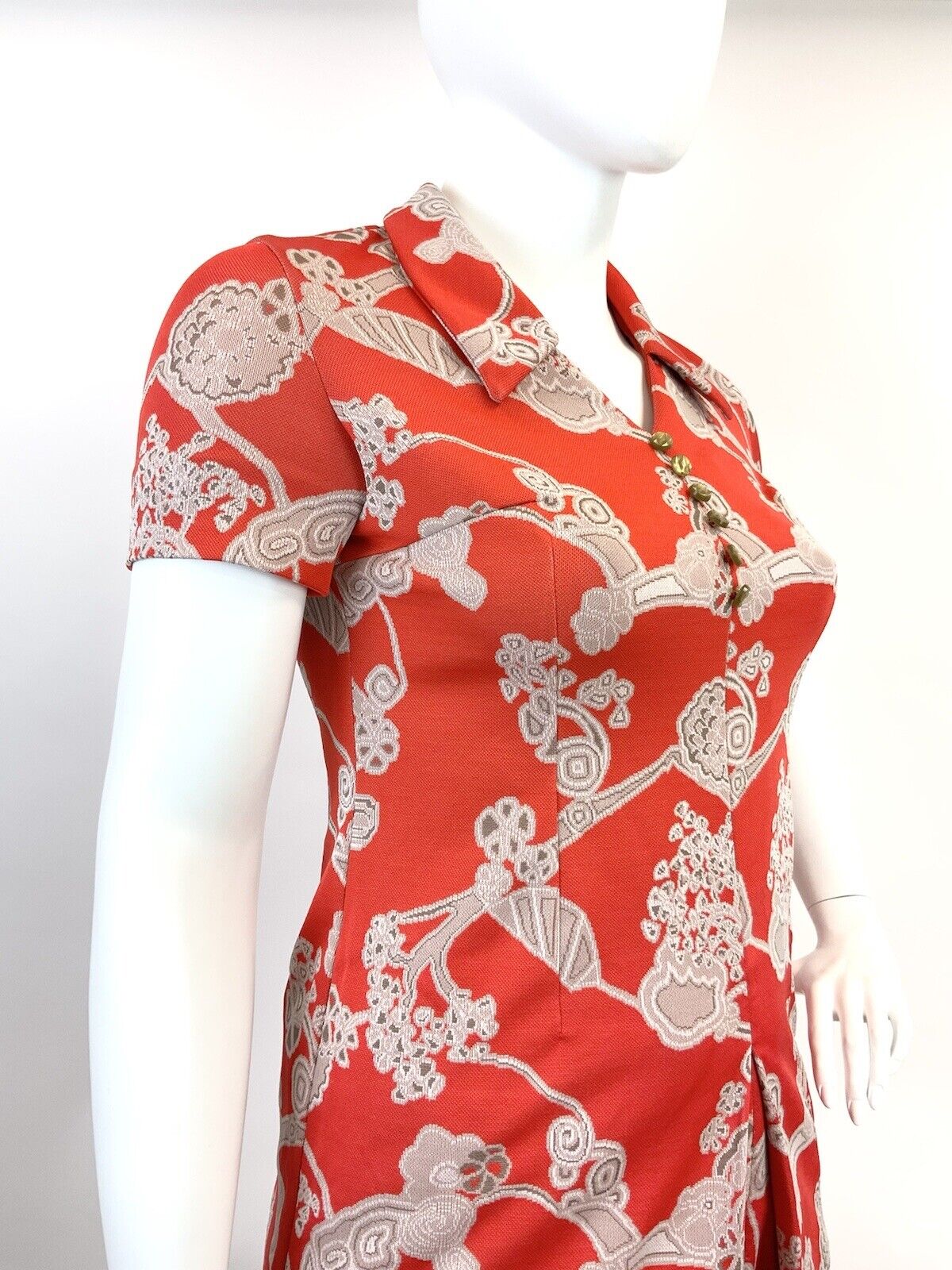 VINTAGE 60s 70s RED CREAM BROWN FLORAL ABSTRACT DAGGER COLLAR SHIRT DRESS 16
