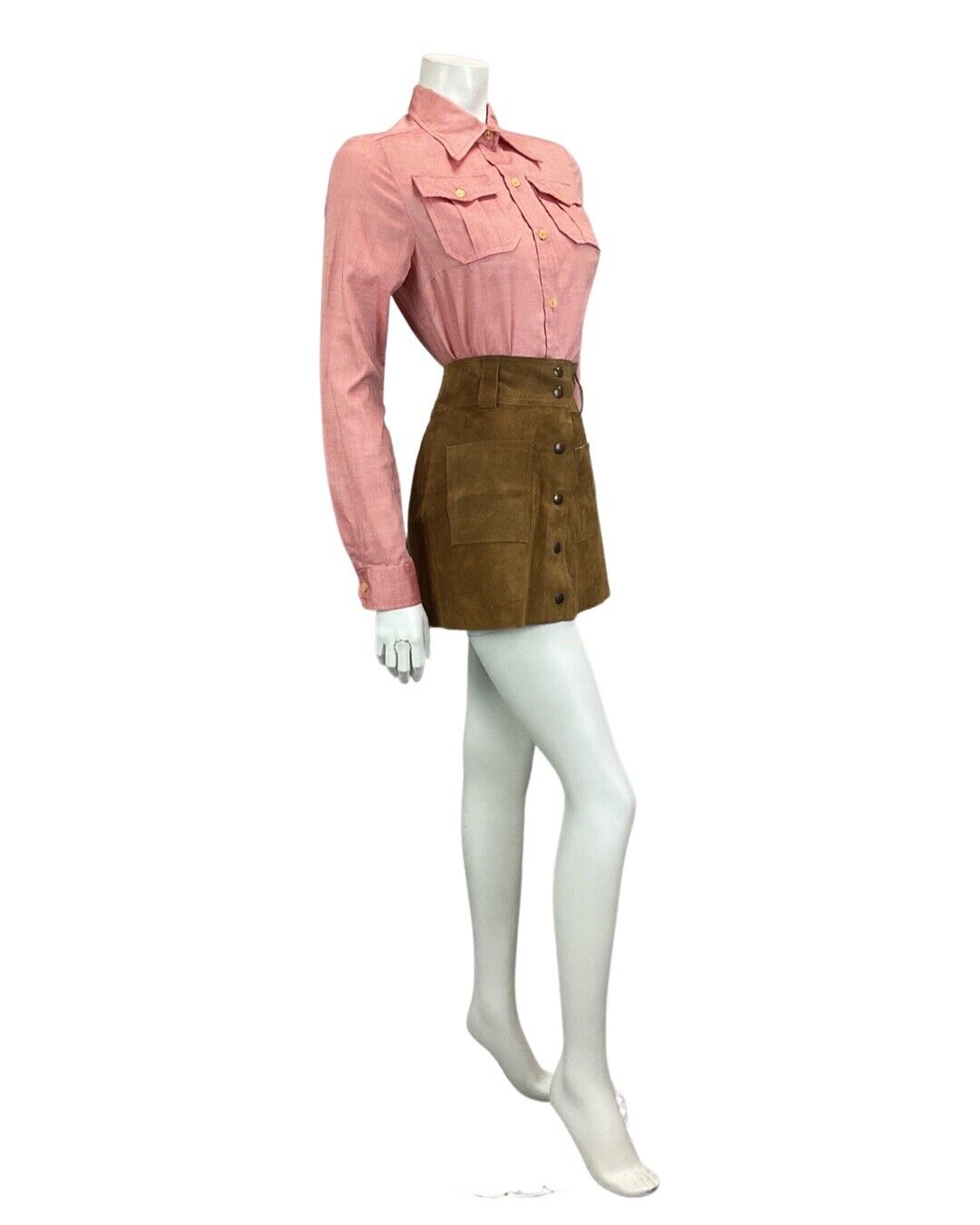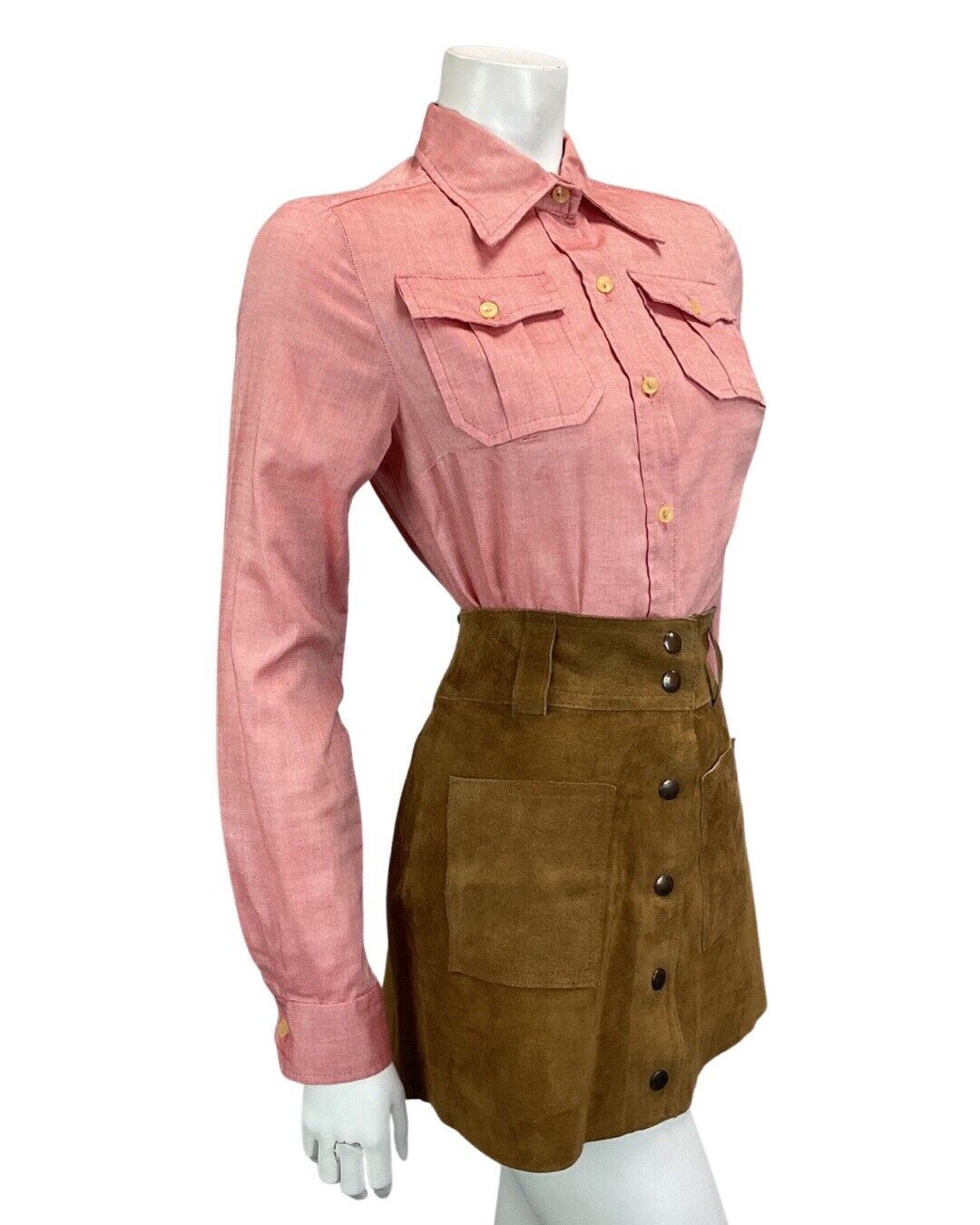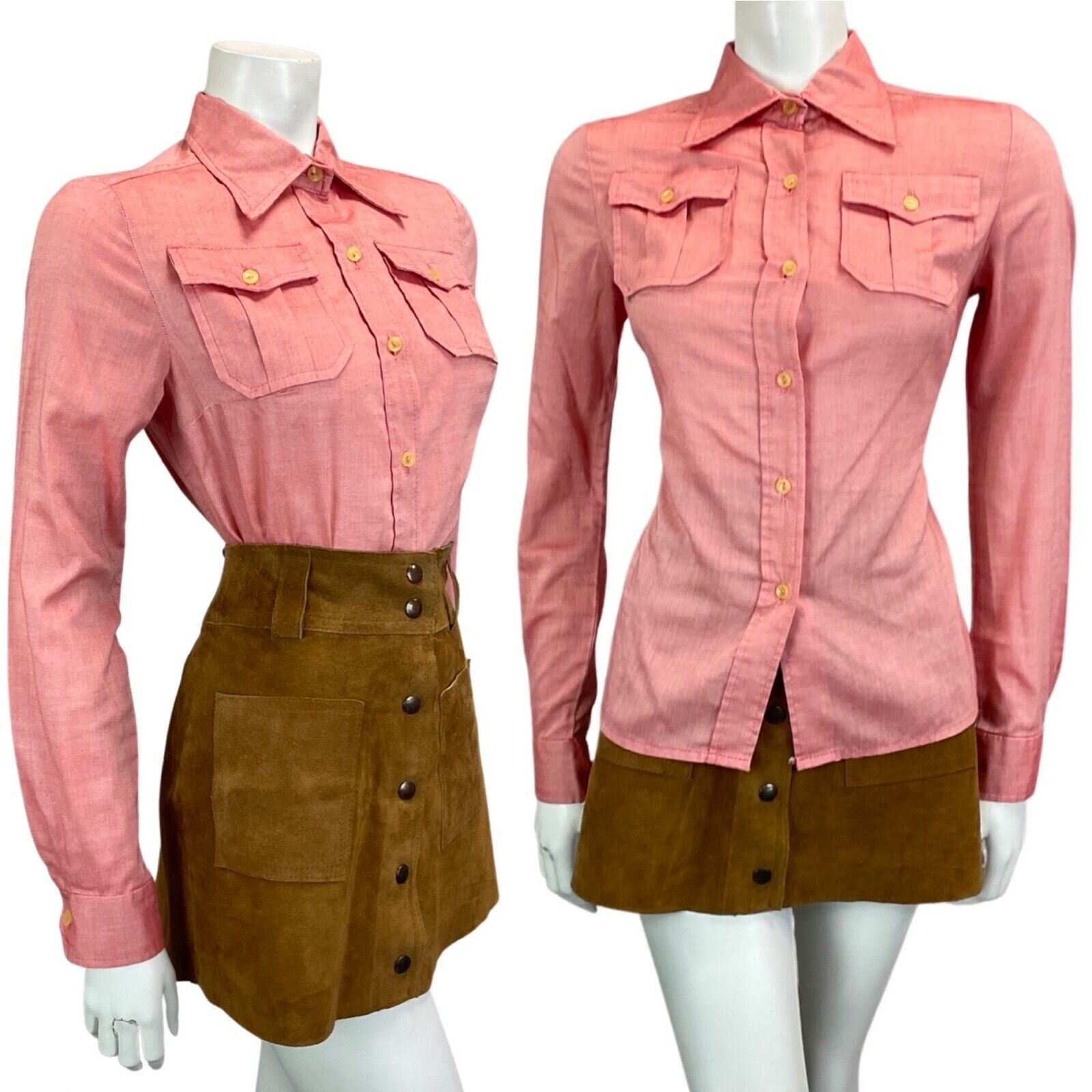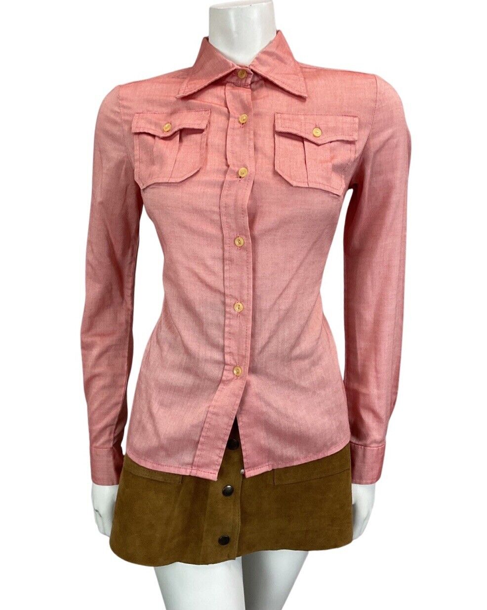 Featuring a short dagger collar, with a western style, and long sleeves with matching buttons on the cuffs. It has two breast pockets and fastens all the way down with small round buttons.