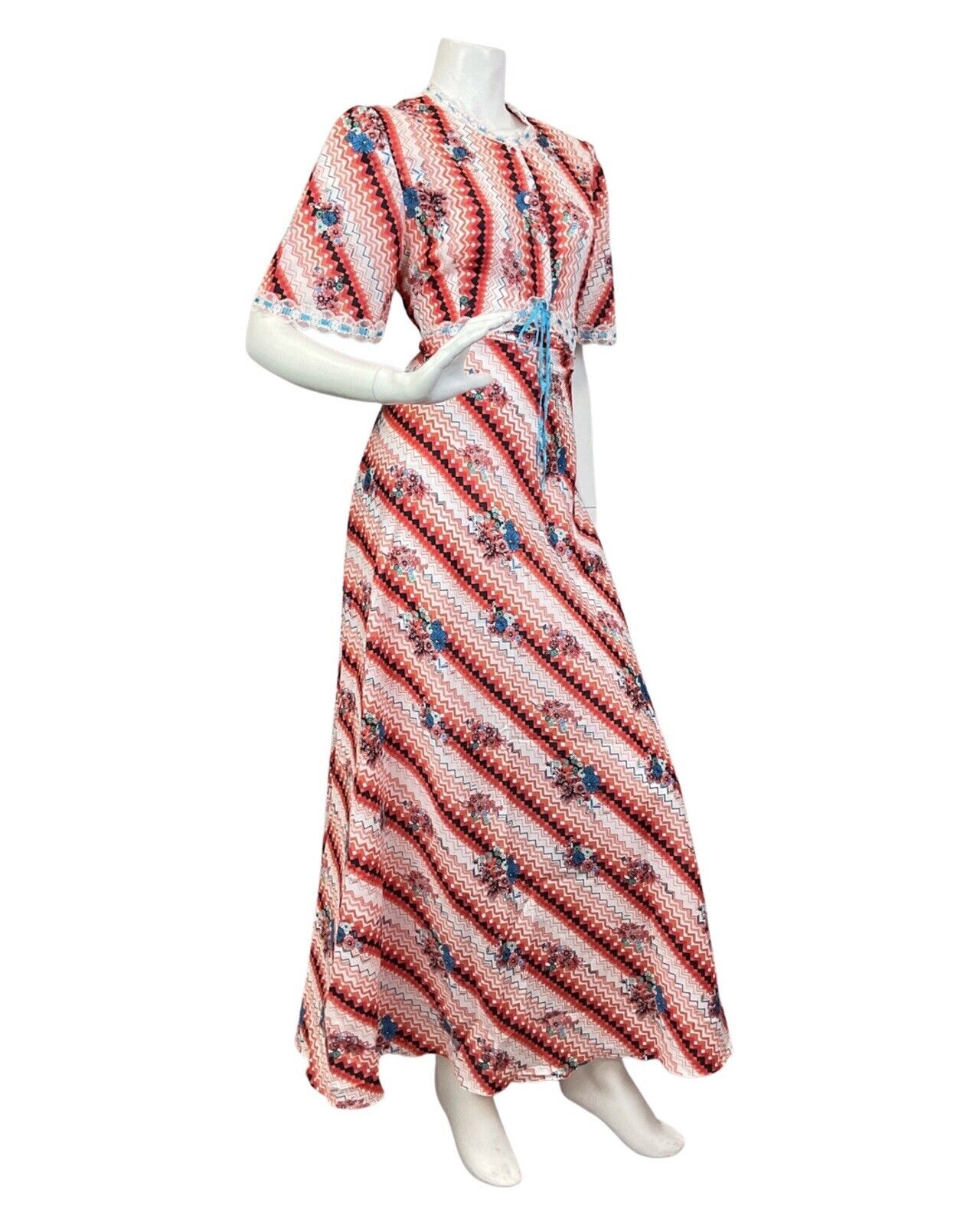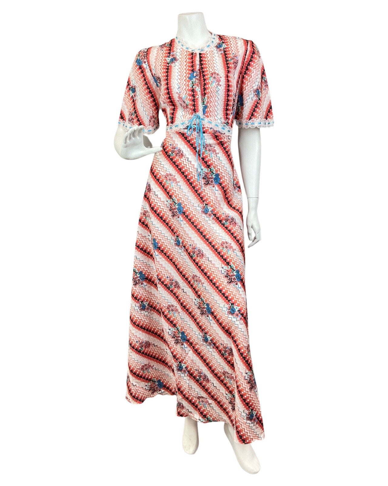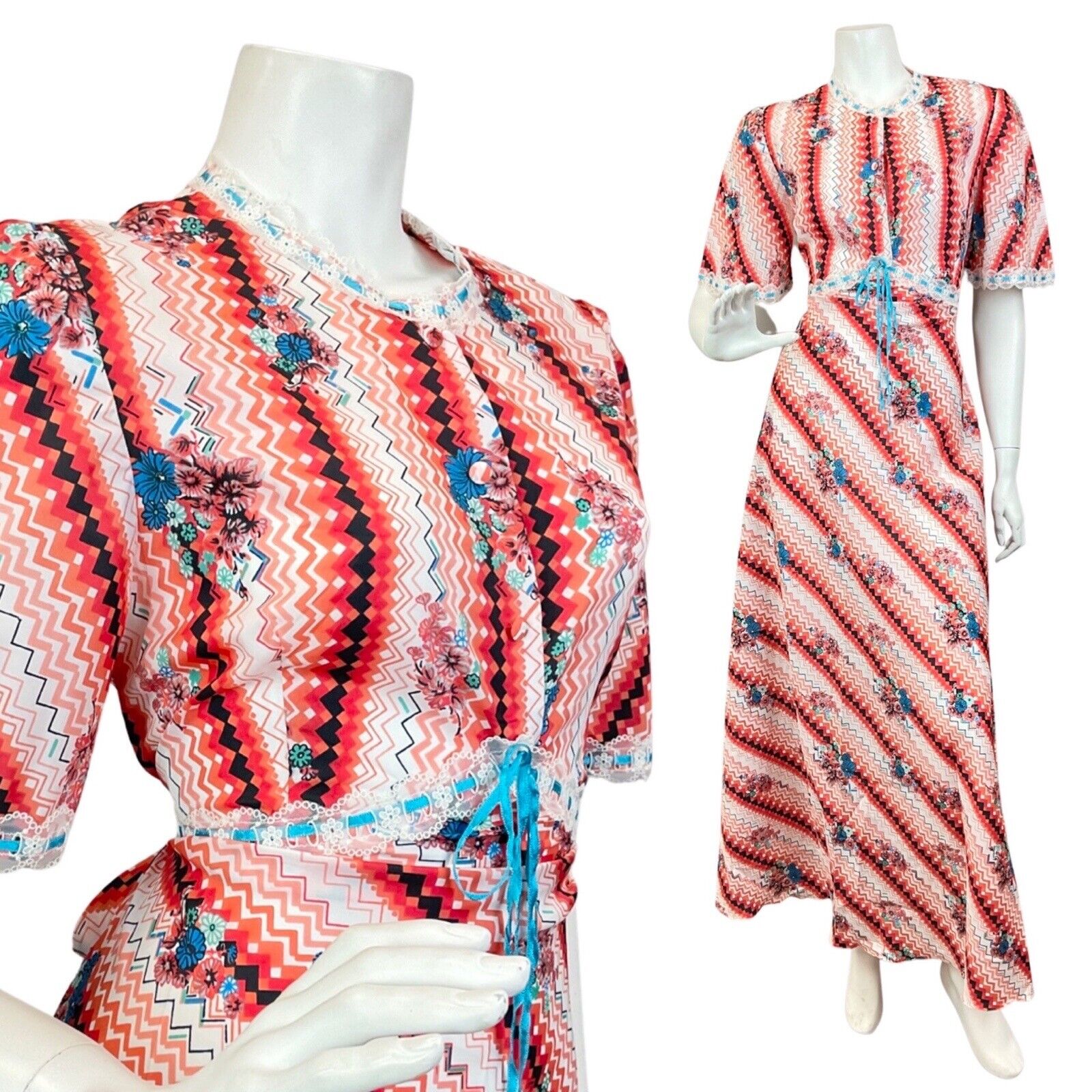 VINTAGE 60s 70s RED WHITE BLUE CHEVRON FLORAL GEOMETRIC SUMMER MAXI DRESS 10