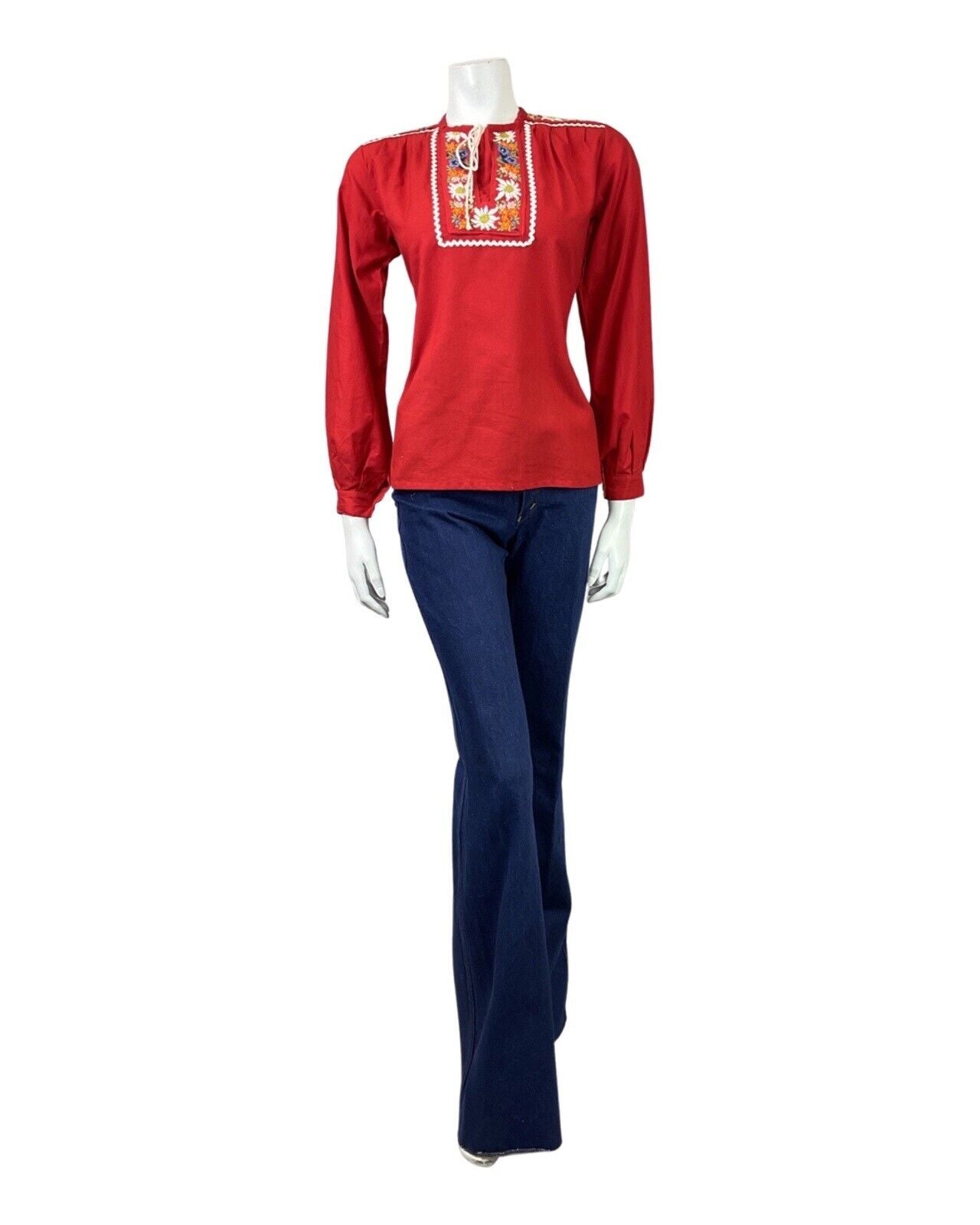 VINTAGE 60s 70s RED WHITE BLUE FLORAL EMBROIDERED RIC-RAC BOHO BLOUSE 12