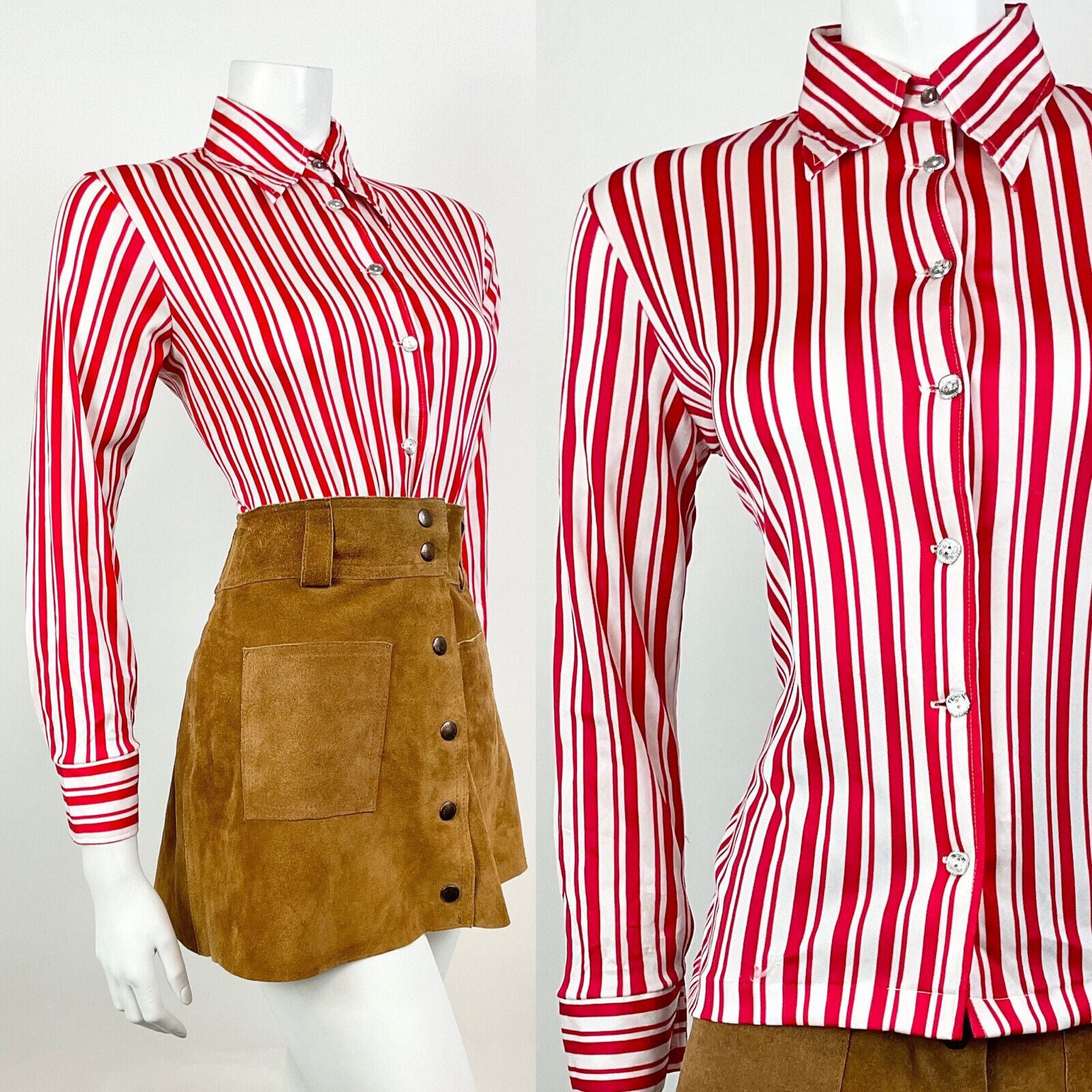 VINTAGE 60s 70s RED WHITE CANDY STRIPED MOD DAGGER SHIRT BLOUSE 12