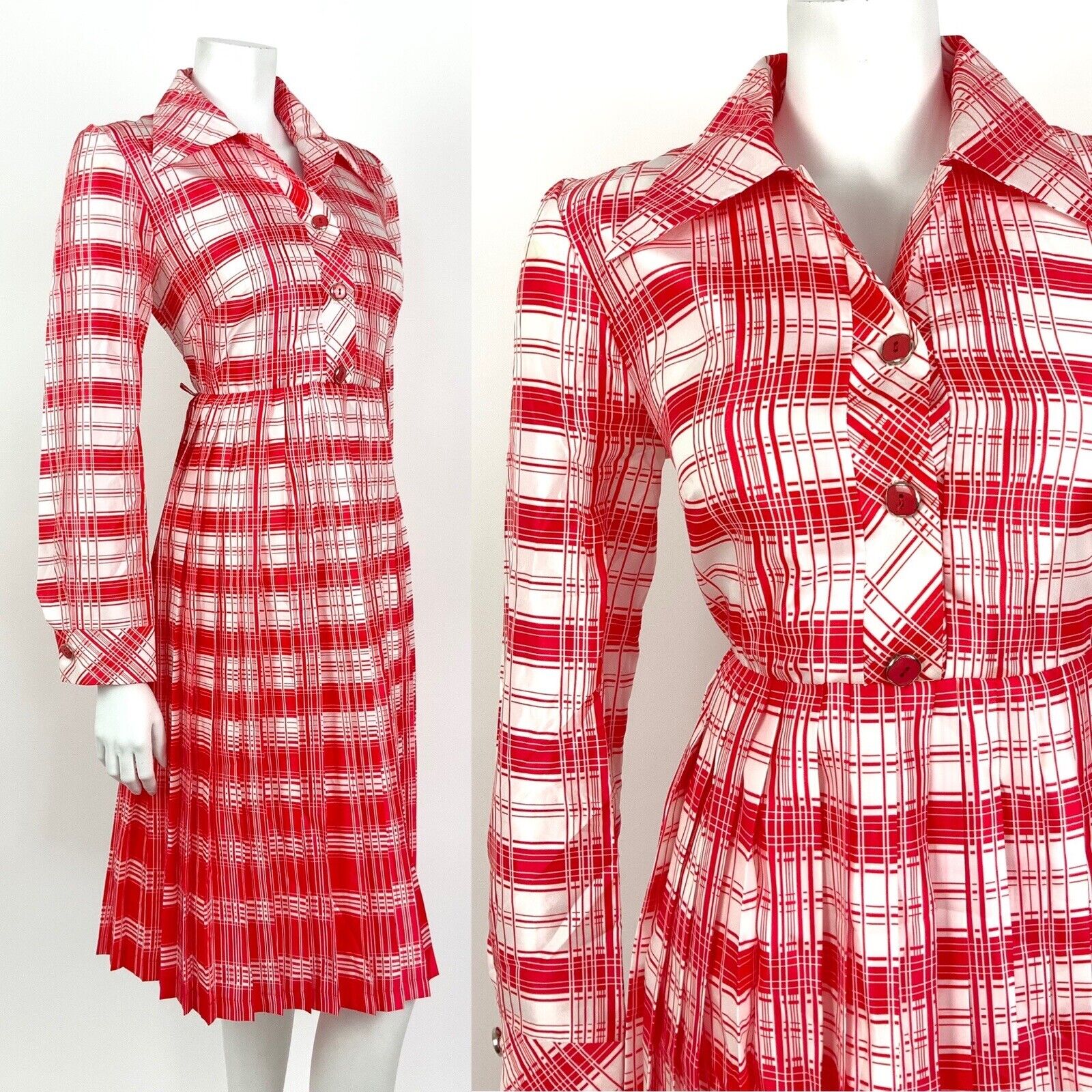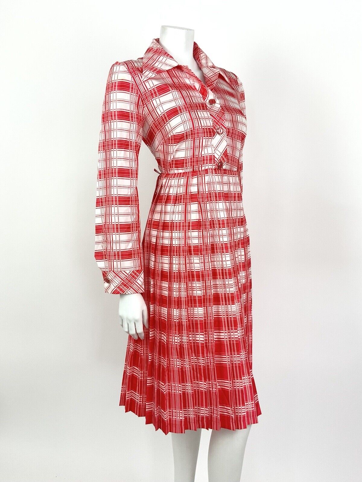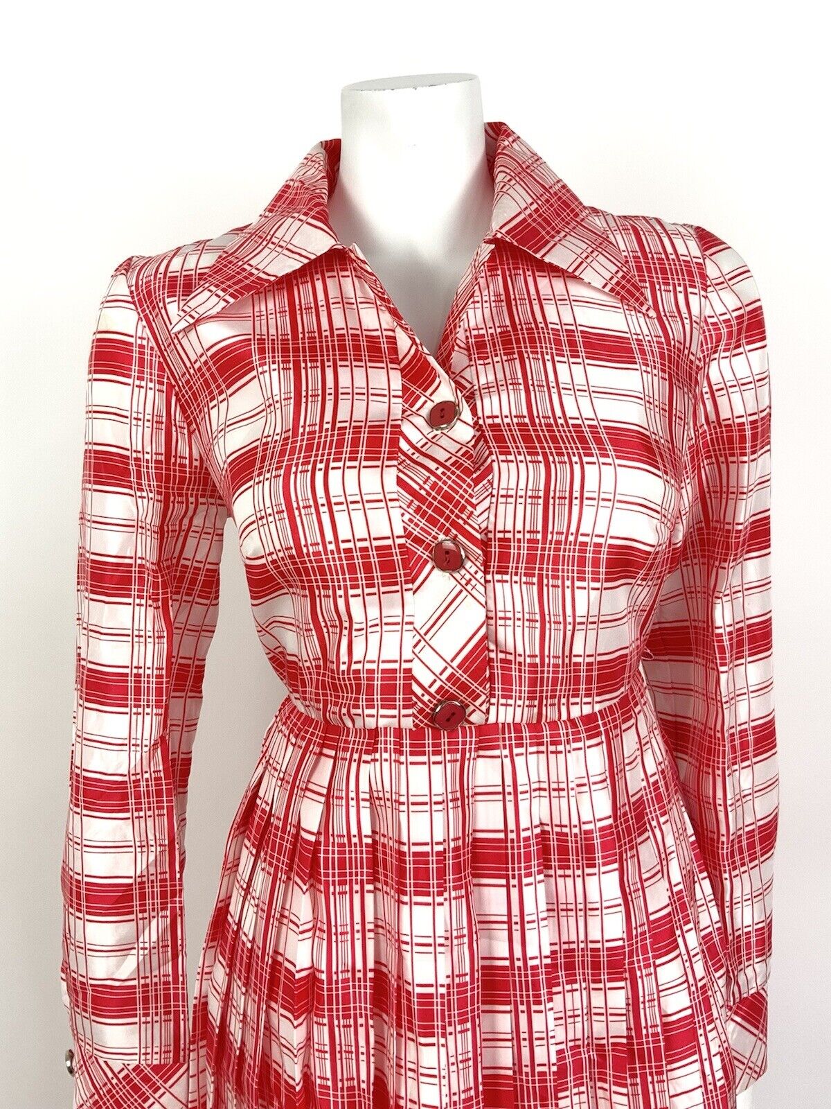 VINTAGE 60s 70s RED WHITE CHECKED PLAID MOD DAGGER COLLAR SHIRT DRESS 12