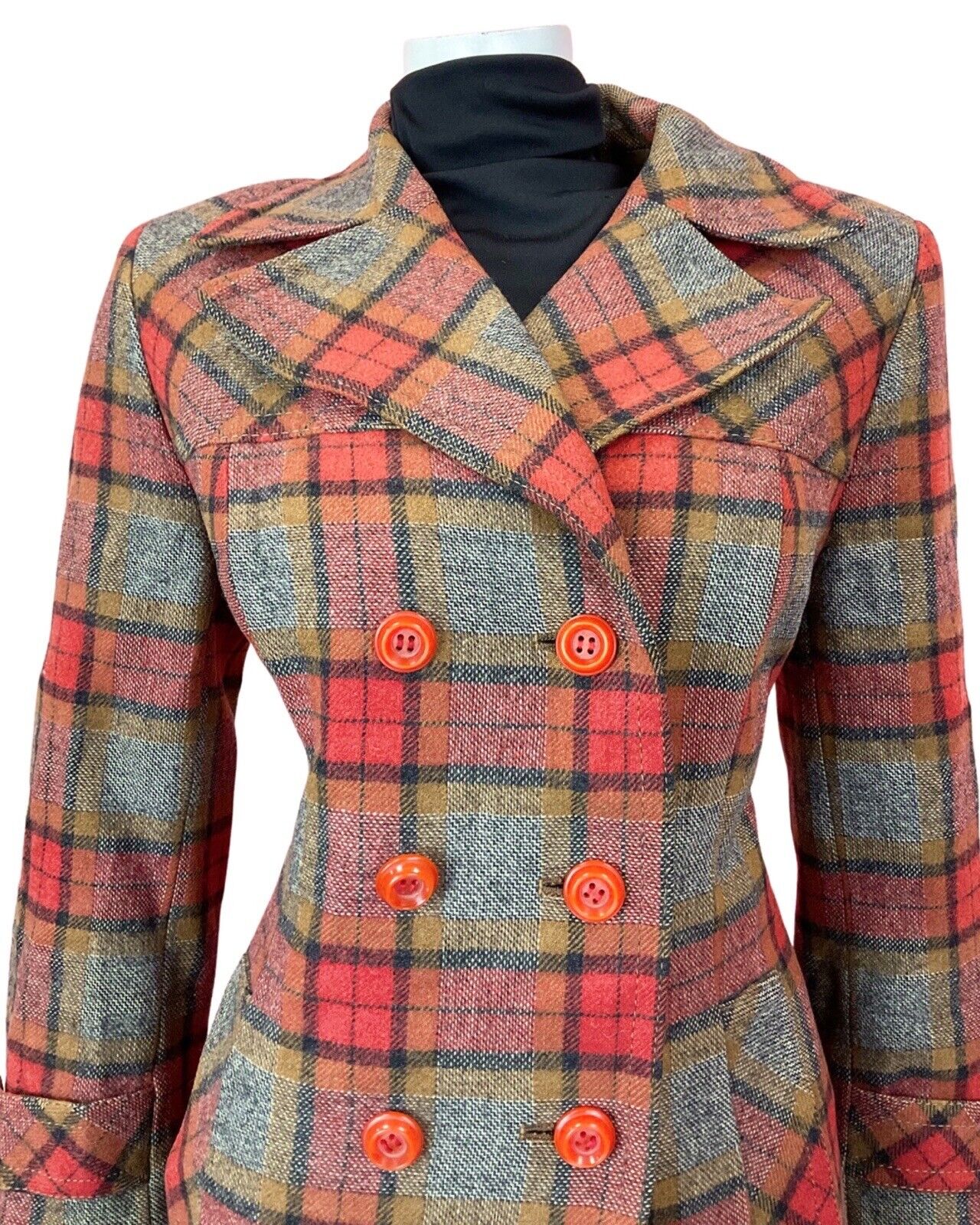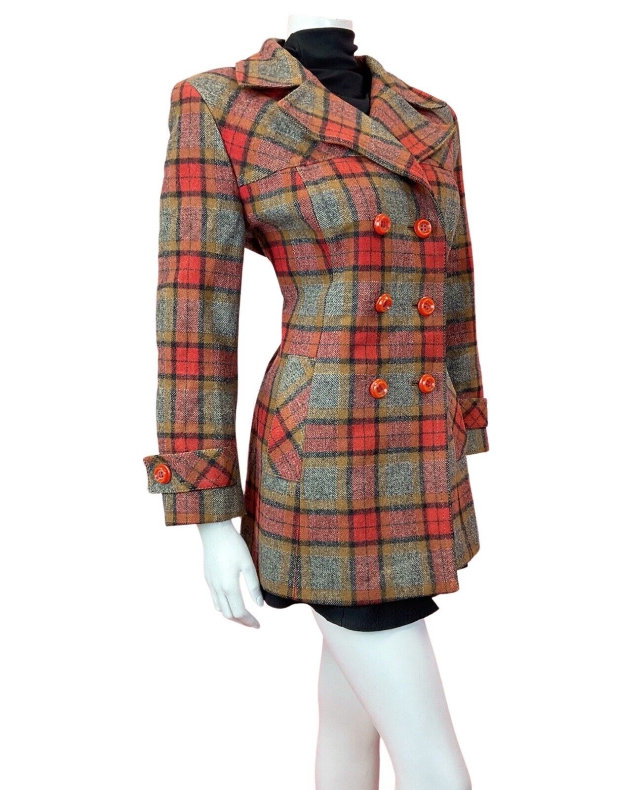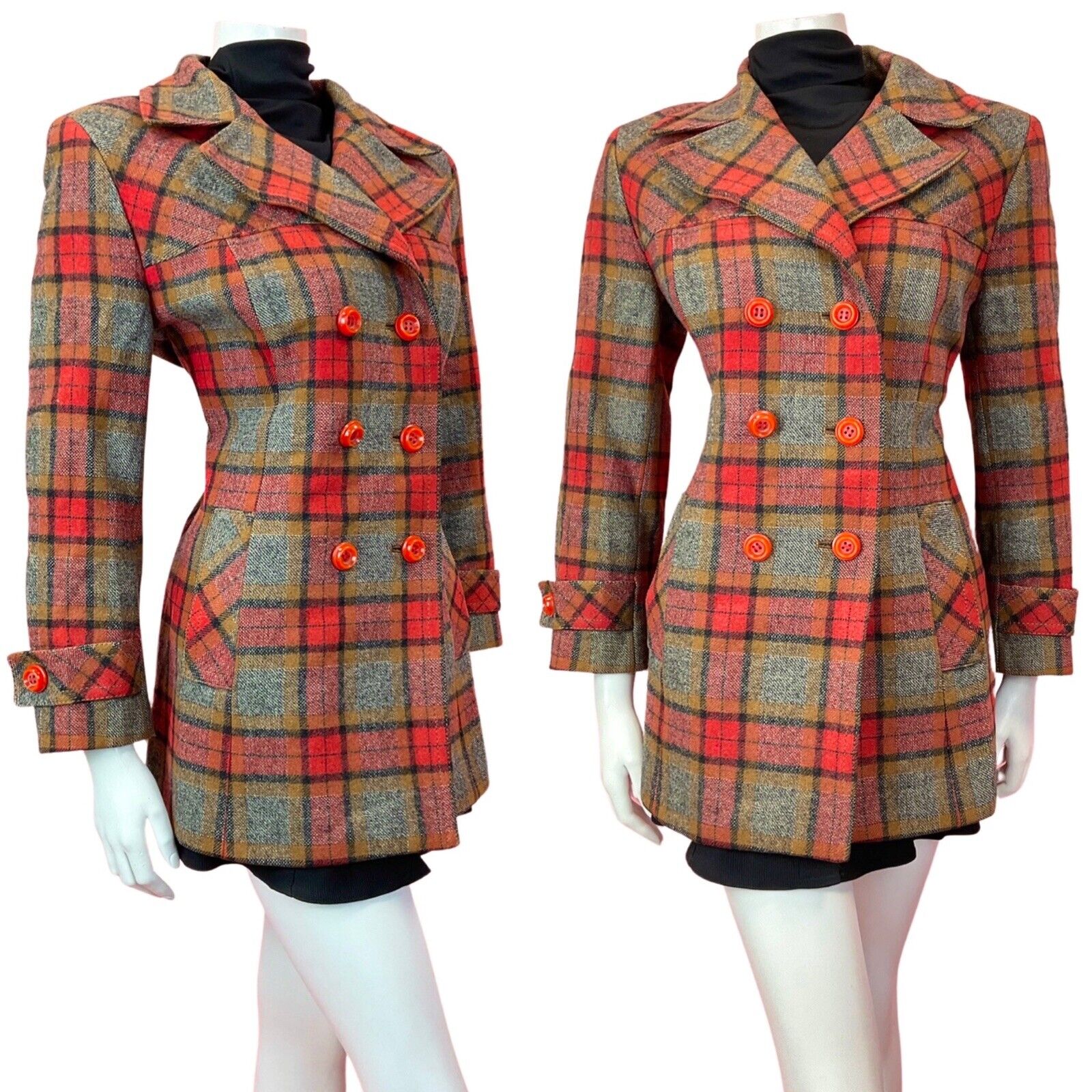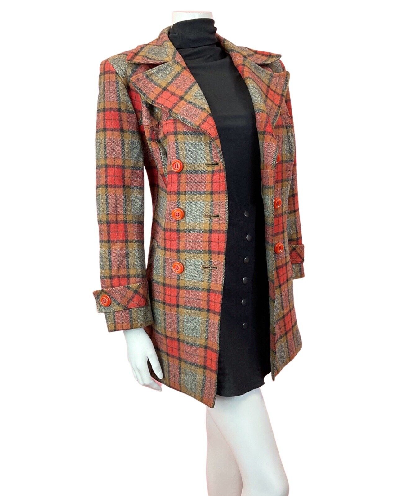 VINTAGE 60s 70s RED YELLOW BLACK CHECKED PLAIN MOD DOUBLE-BREASTED COAT 12 14
