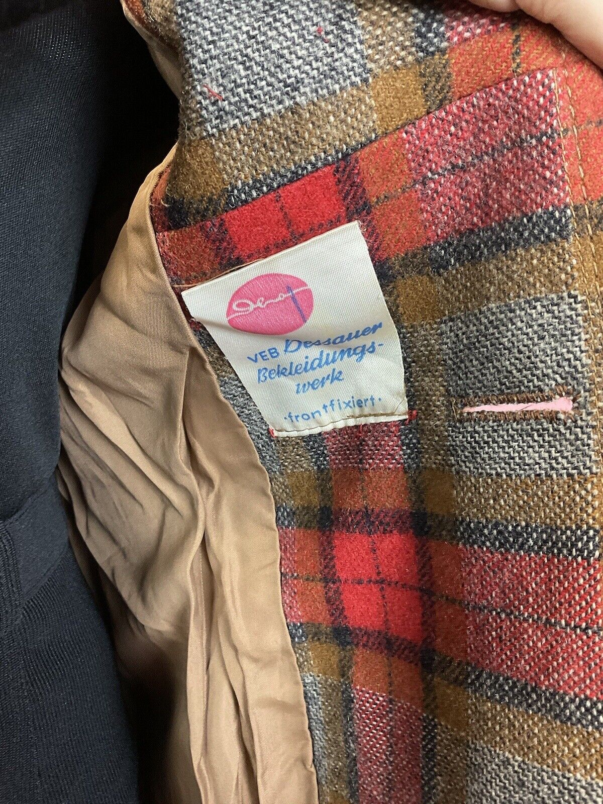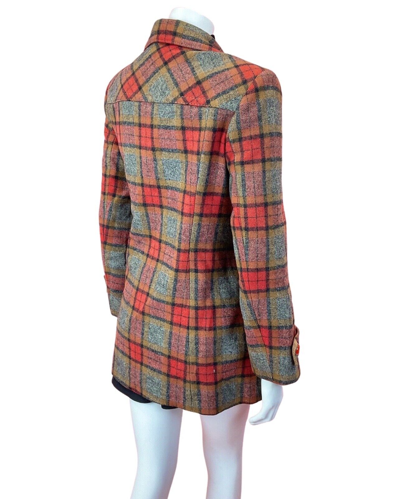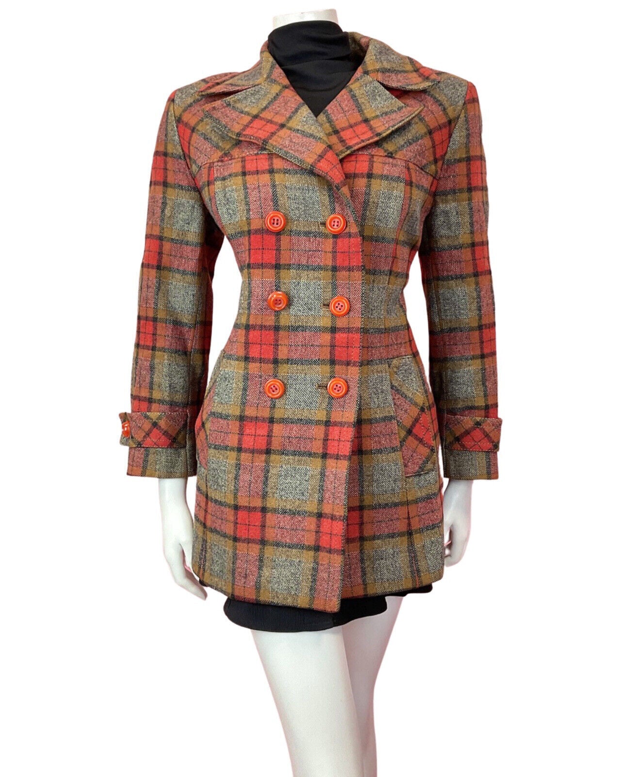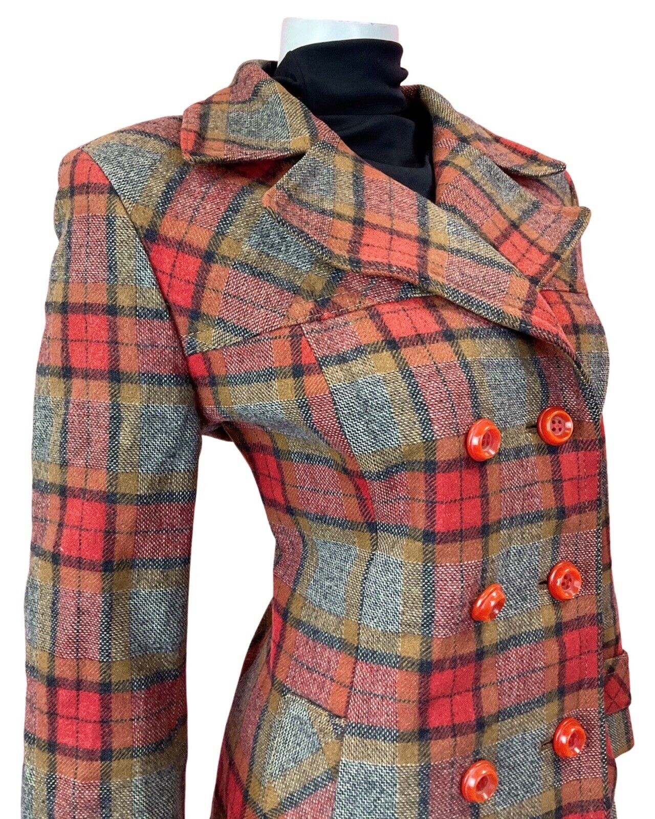VINTAGE 60s 70s RED YELLOW BLACK CHECKED PLAIN MOD DOUBLE-BREASTED COAT 12 14