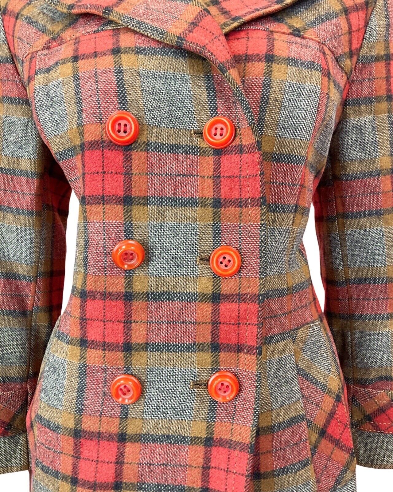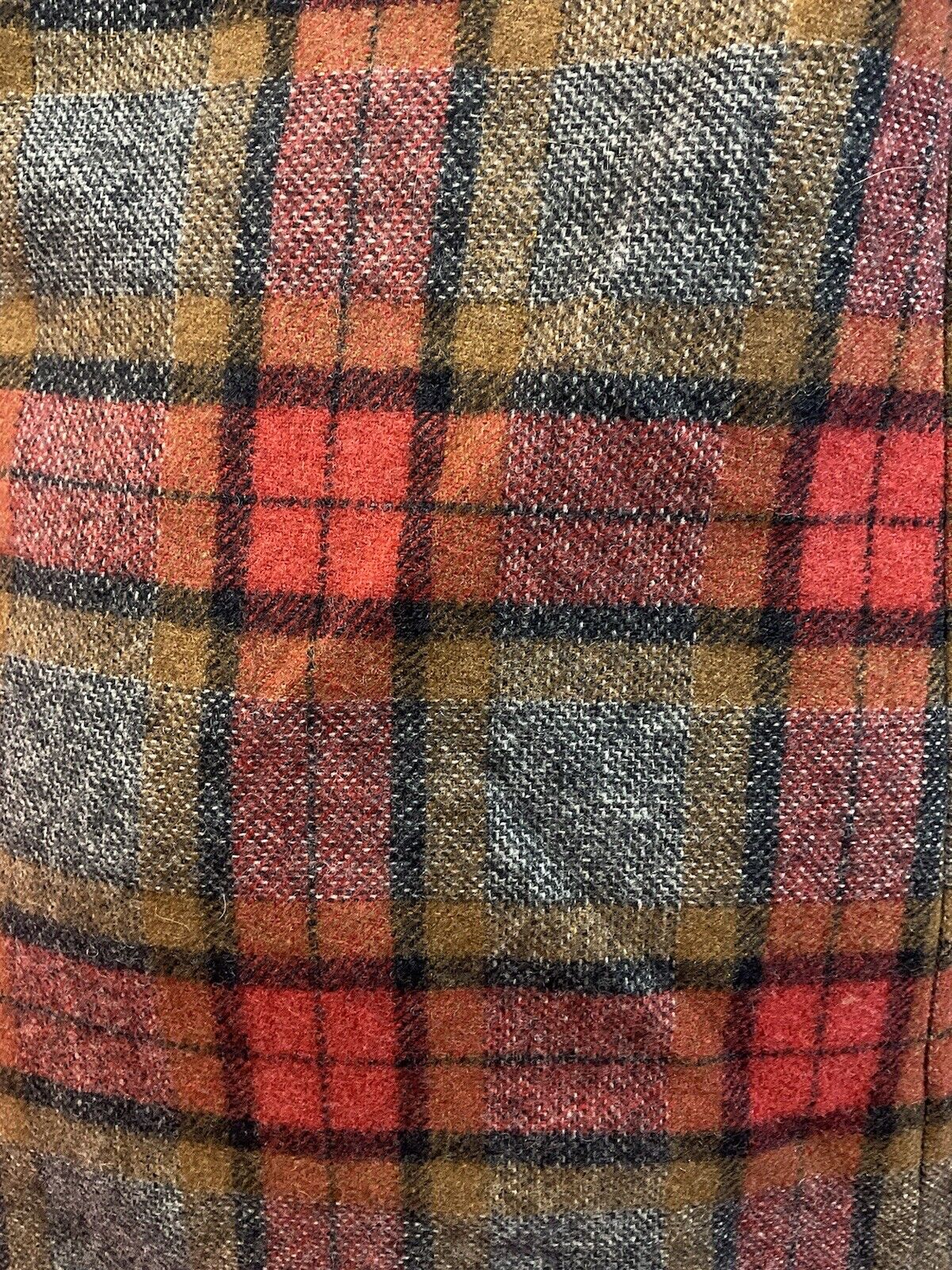 Covering the coat is a bold tartan checked pattern in shades of red, orange, yellow, and black.