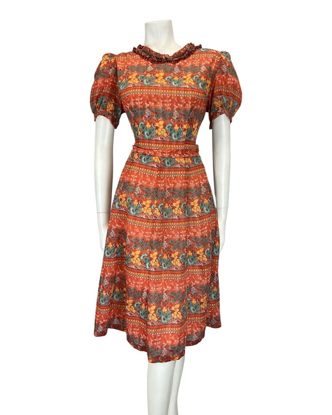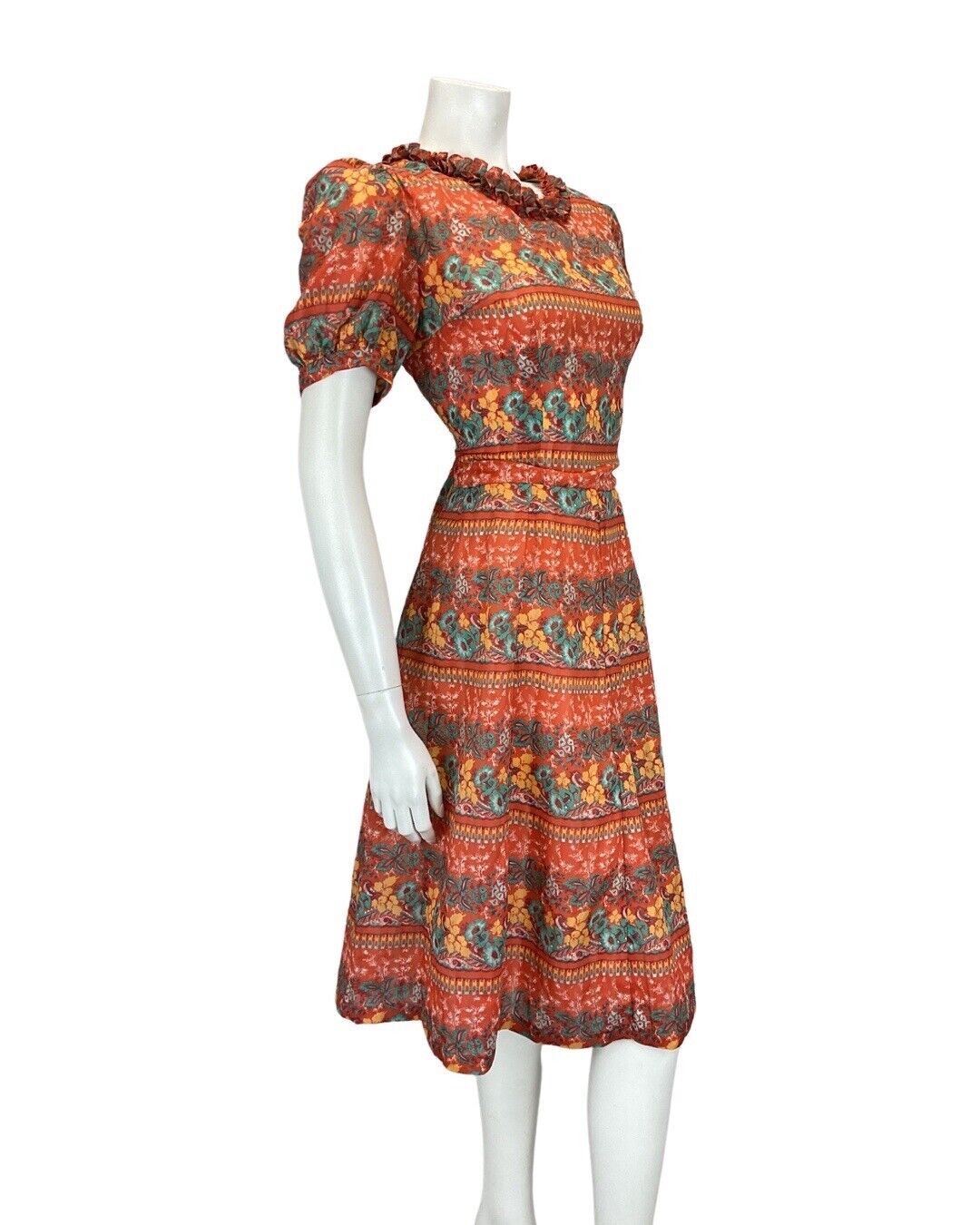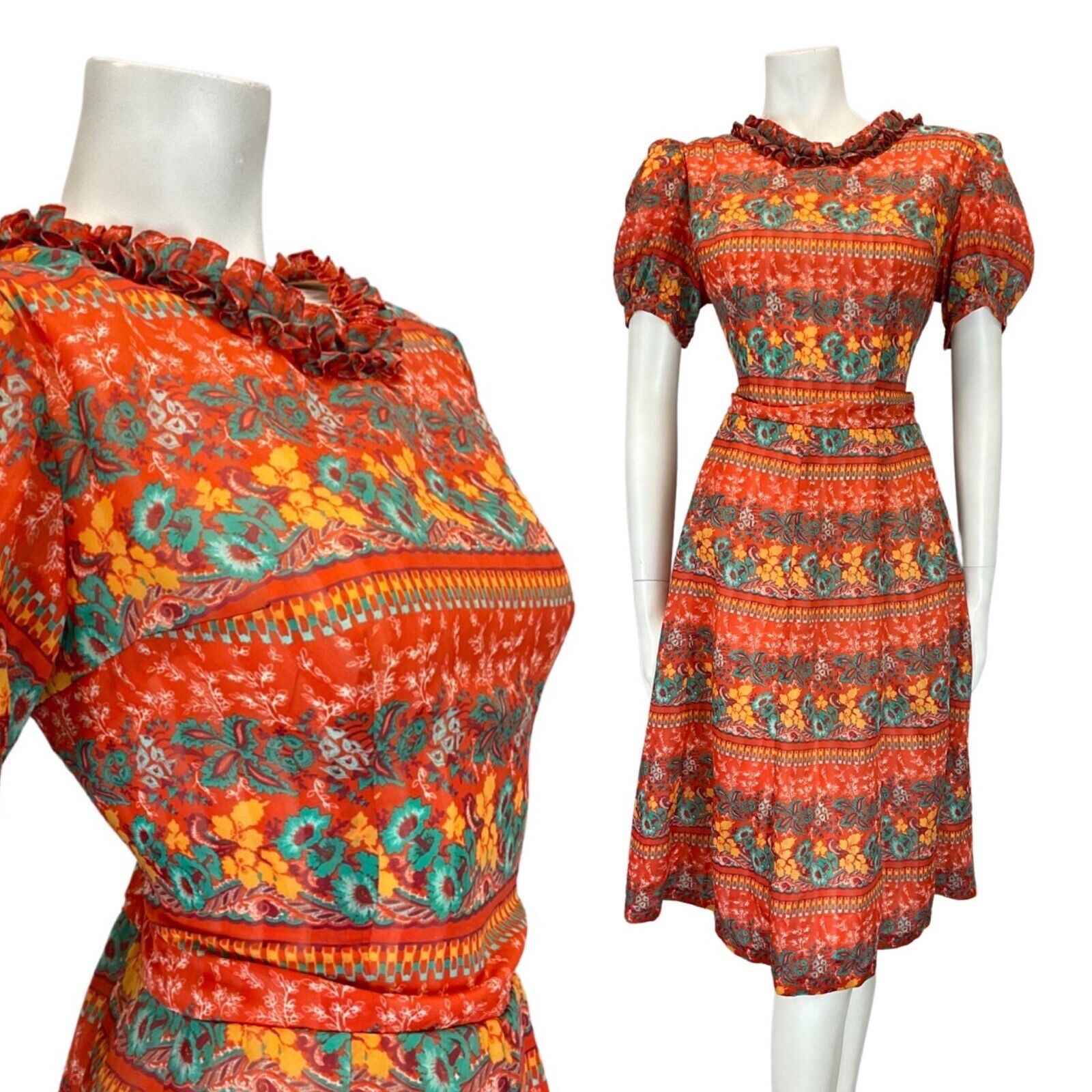 VINTAGE 60s 70s RED YELLOW GREEN GARDEN FLORAL RUFFLED MOD SHORT SLEEVE DRESS 12