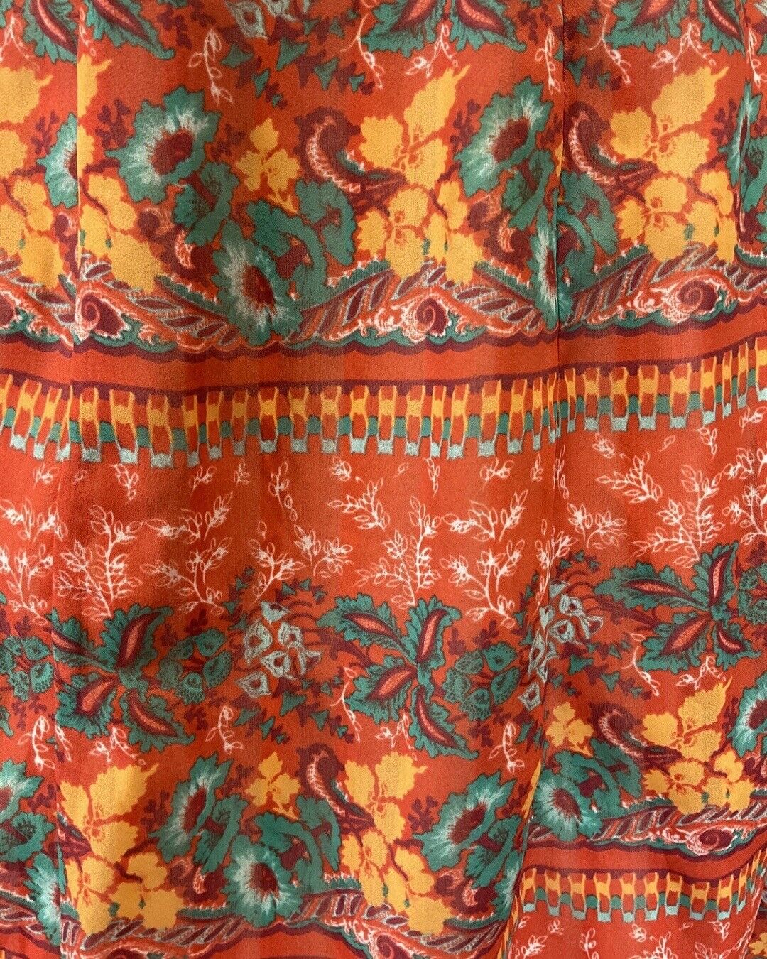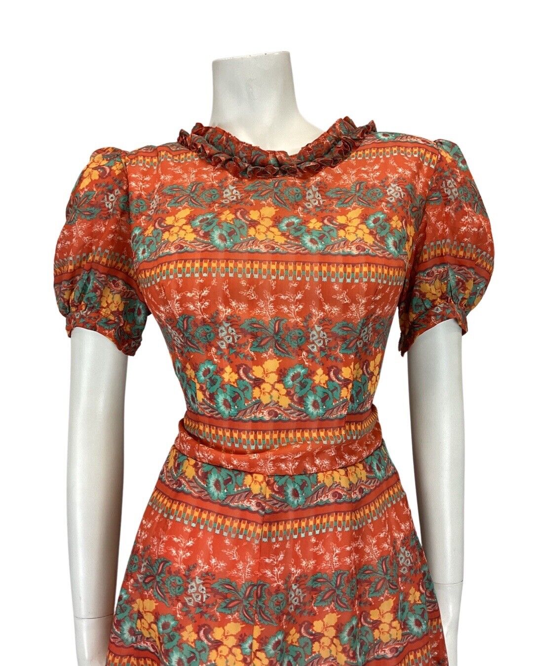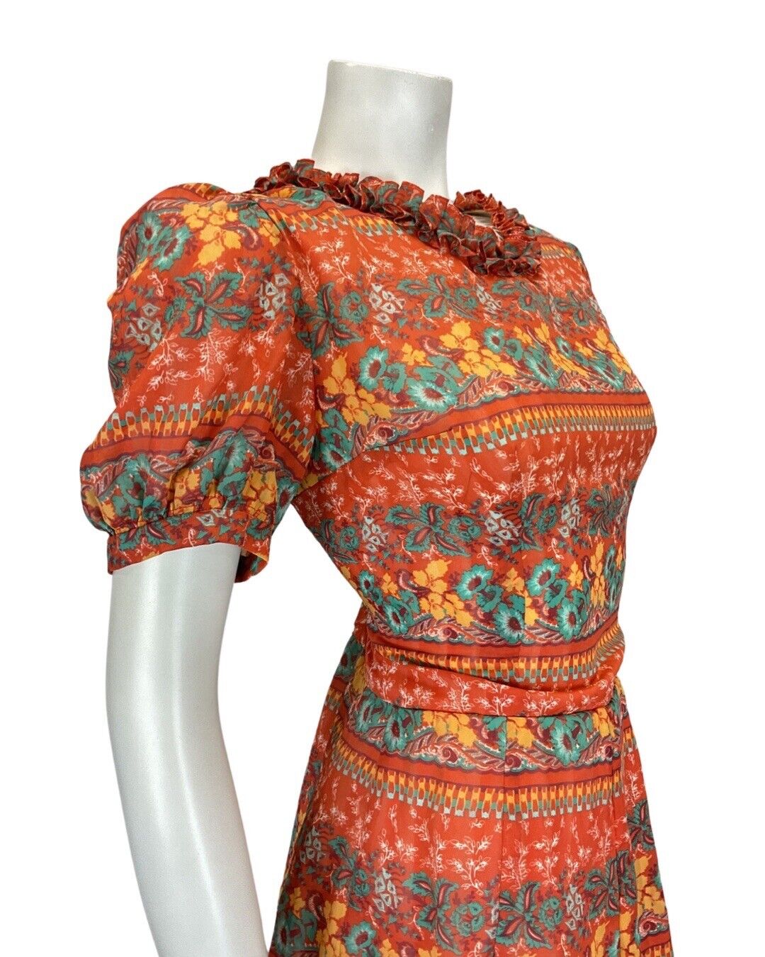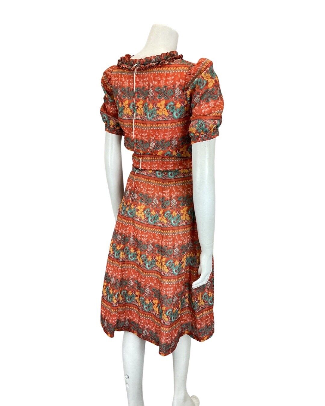 VINTAGE 60s 70s RED YELLOW GREEN GARDEN FLORAL RUFFLED MOD SHORT SLEEVE DRESS 12