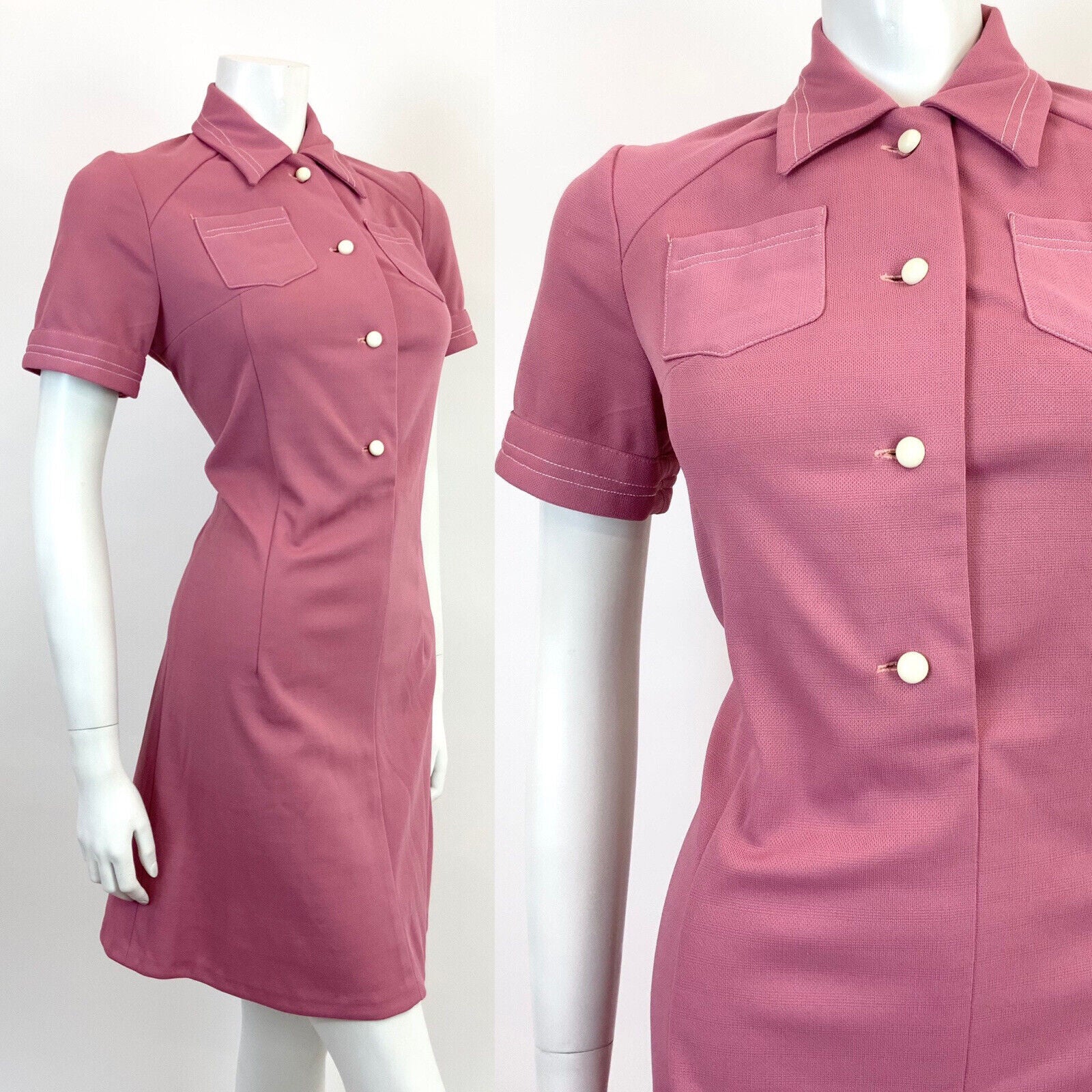 VINTAGE 60s 70s ROSE PINK WHITE MOD SCOOTER DAGGER SHIRT DRESS 12 14