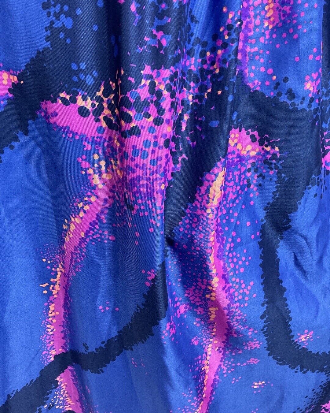 Covering the fabric is a bold psychedelic "spray-paint" style pattern in vibrant tones of blue, pink, navy, and peach.