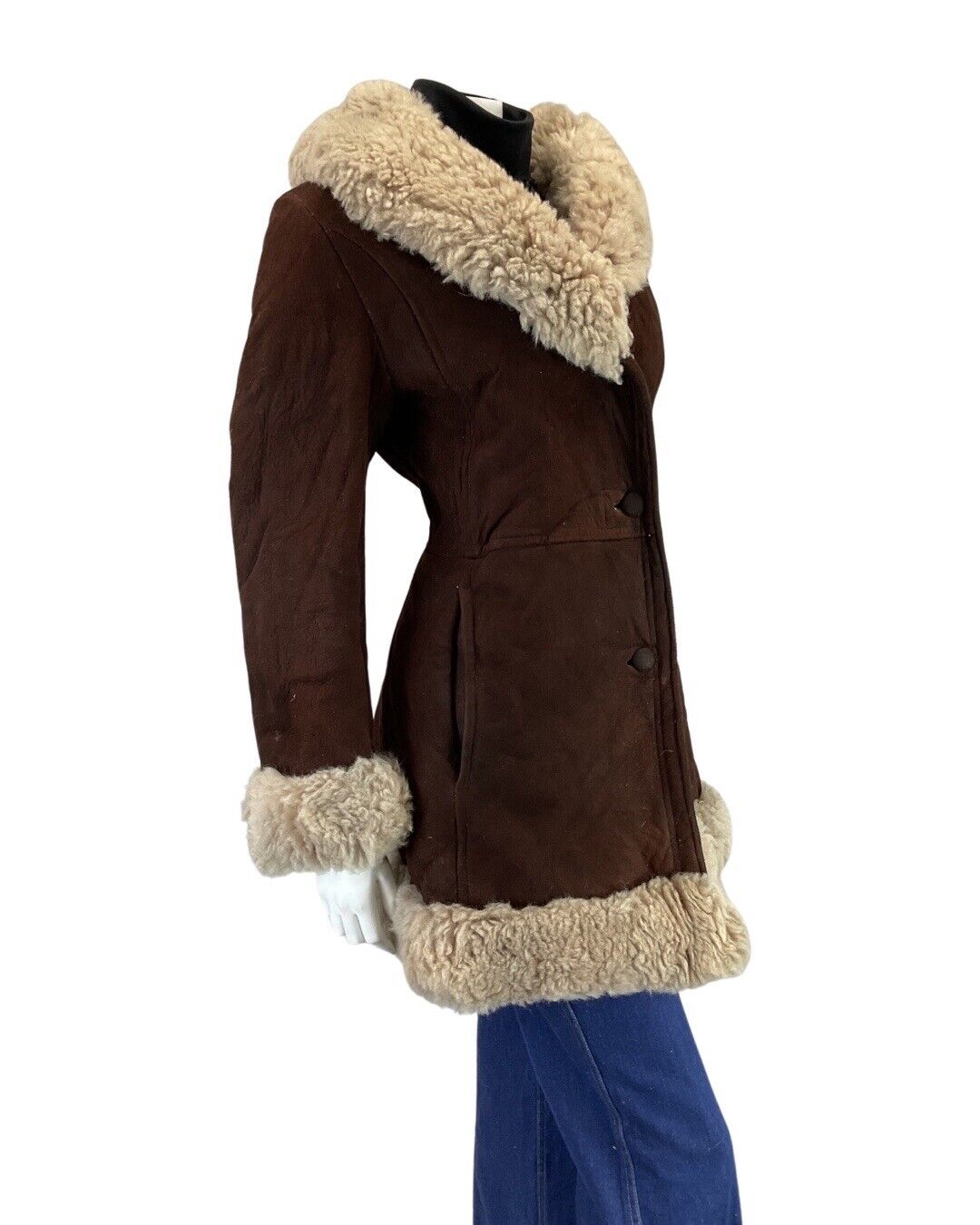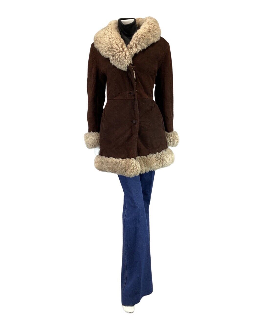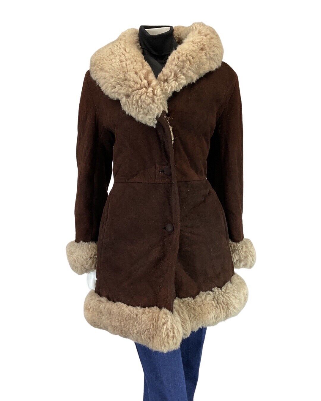 VINTAGE 60s 70s RUSSET BROWN CREAM MOD BOHO SUEDE SHEARLING COAT 14