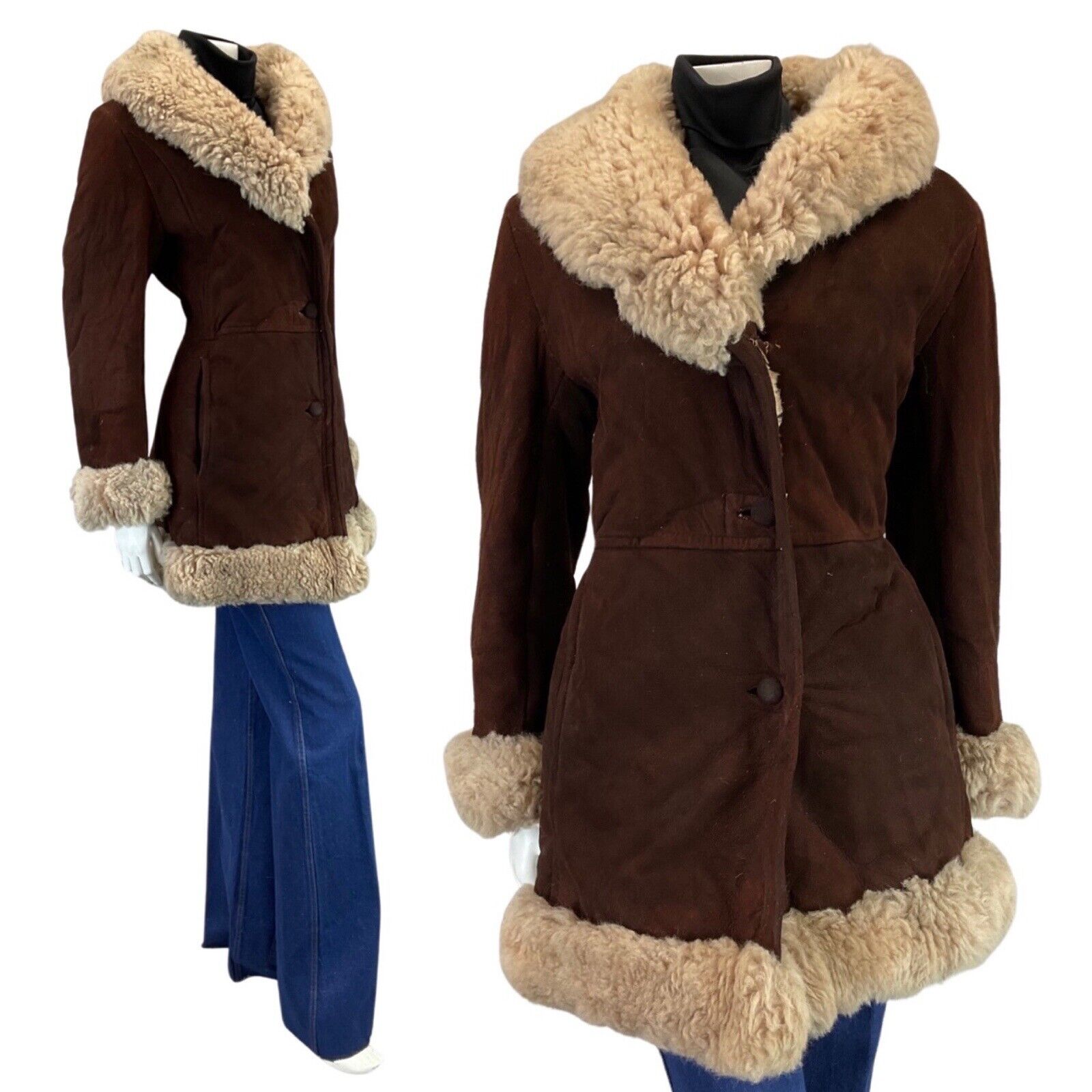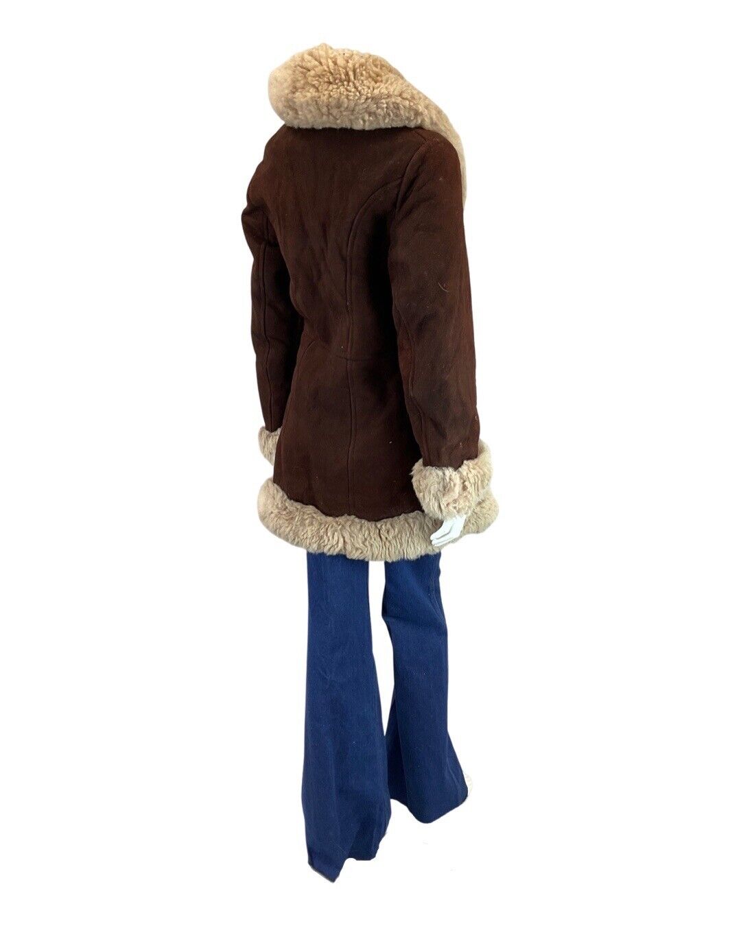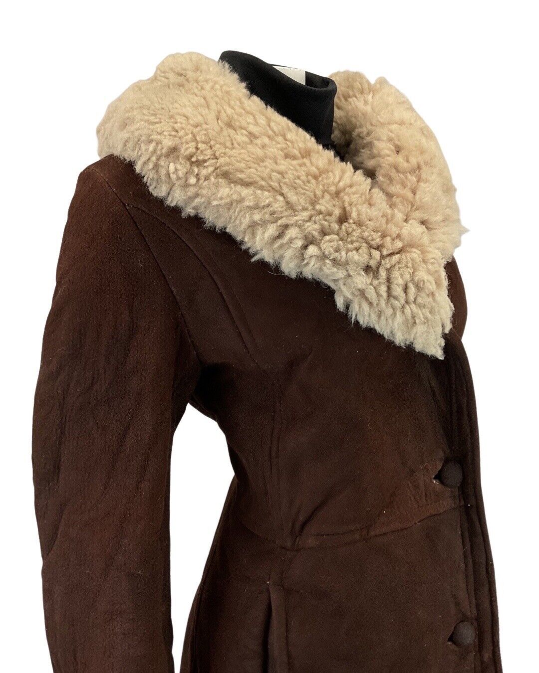 VINTAGE 60s 70s RUSSET BROWN CREAM MOD BOHO SUEDE SHEARLING COAT 14