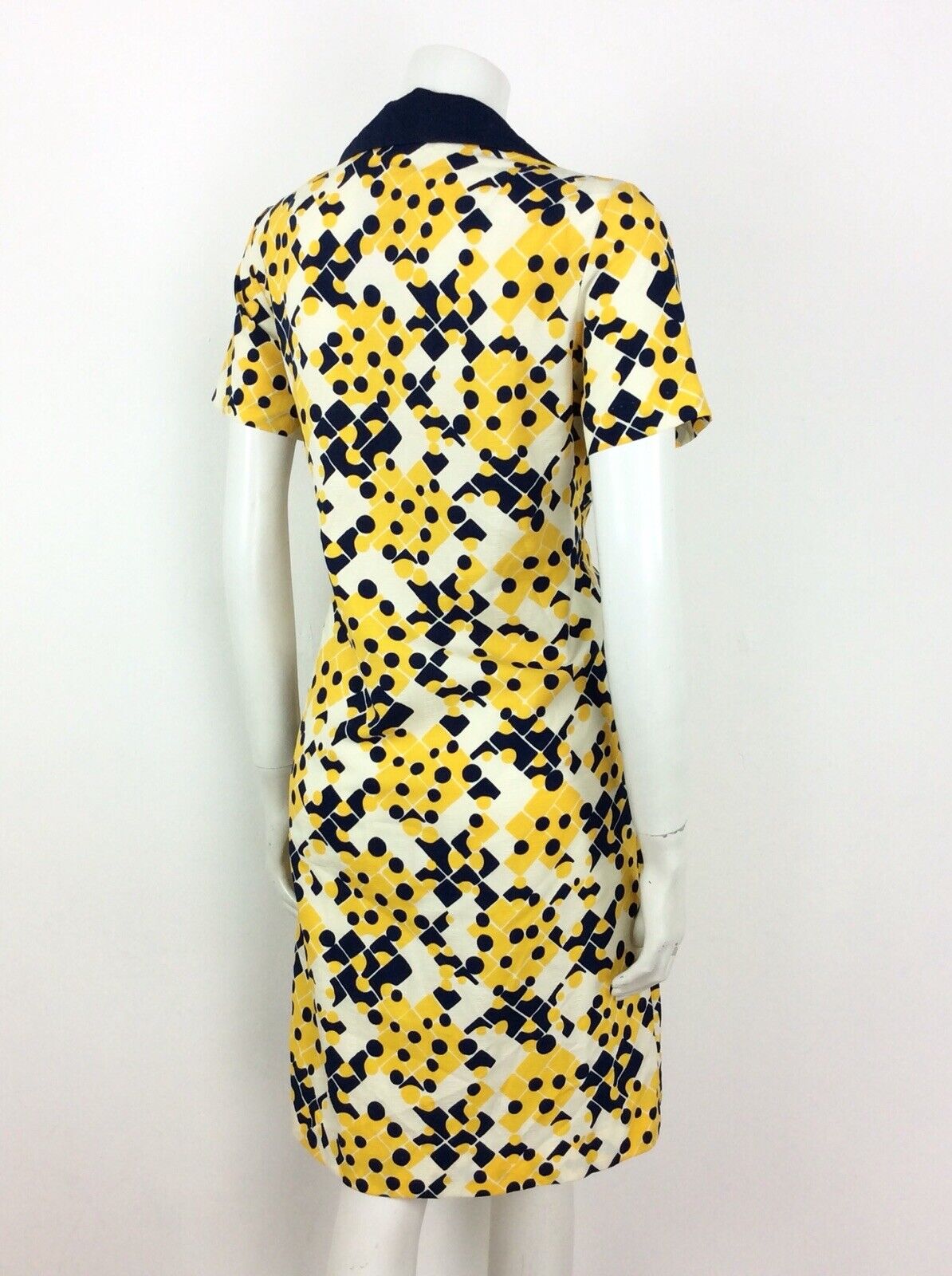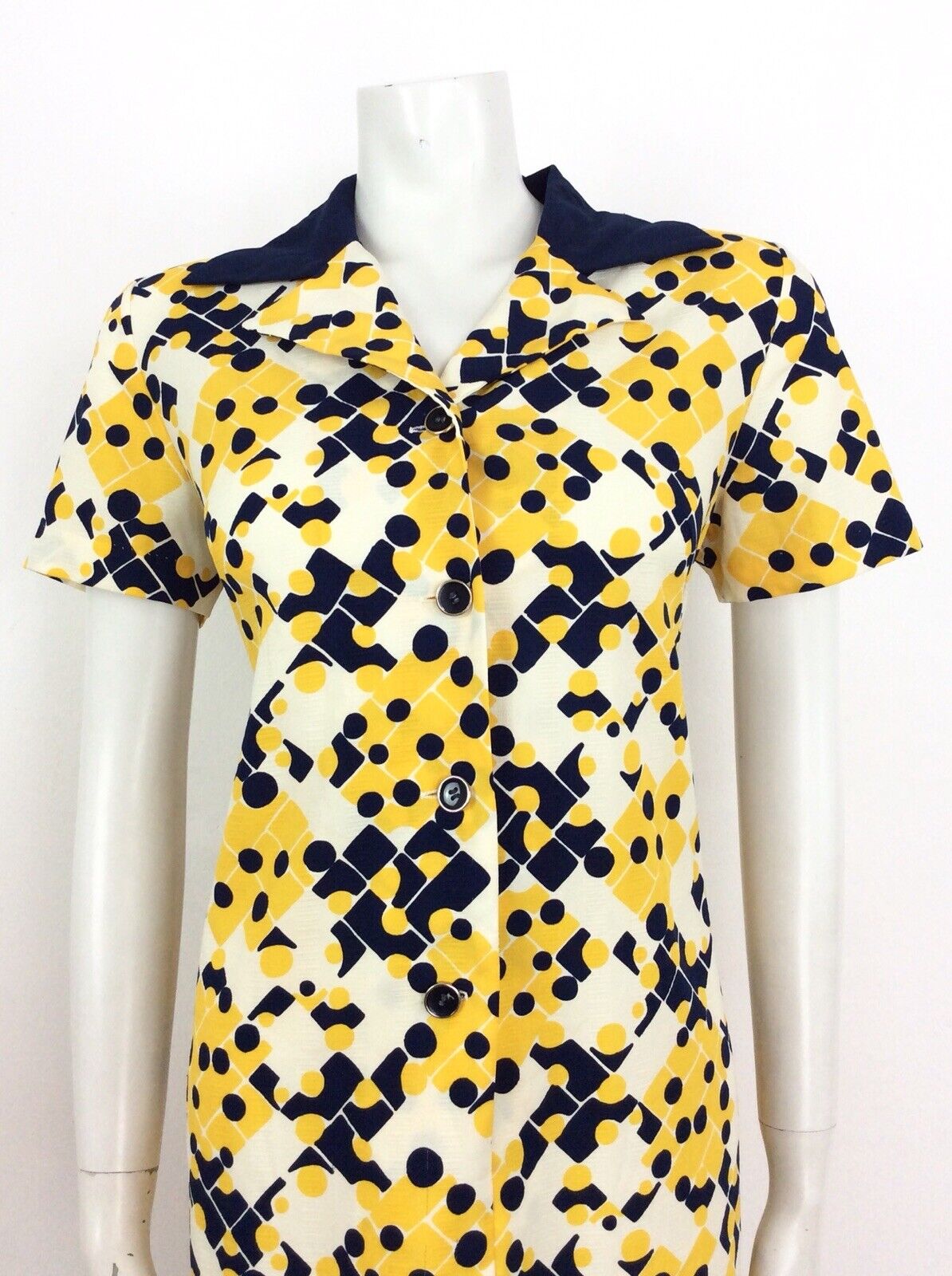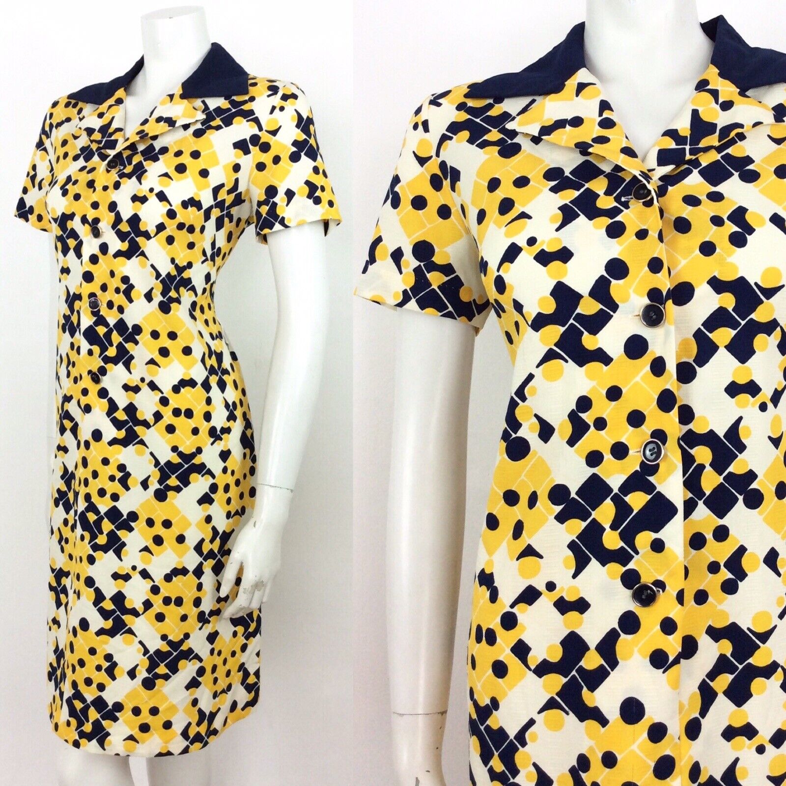 VINTAGE 60s 70s SHIRT DRESS GEOMETRIC ABSTRACT BLUE YELLOW CREAM WHITE 14 16