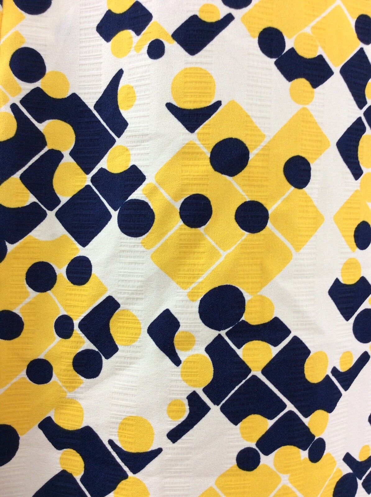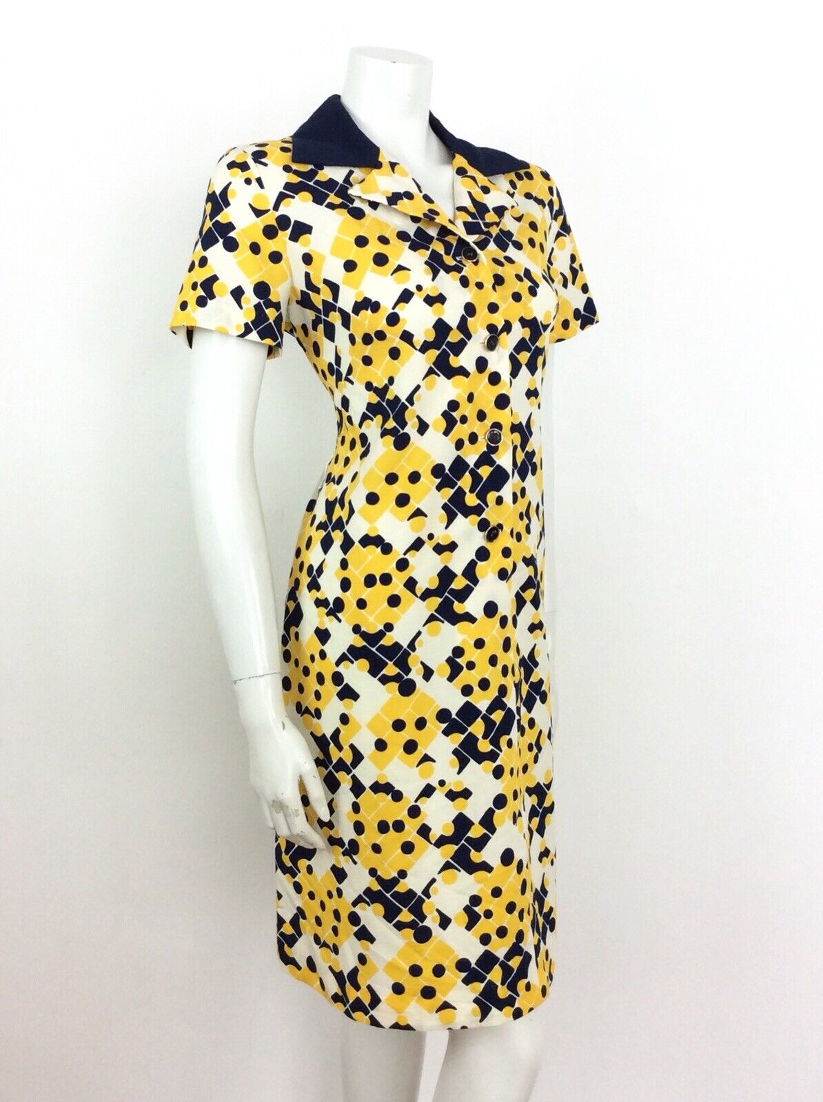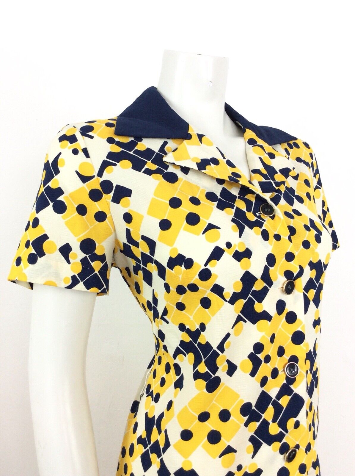 VINTAGE 60s 70s SHIRT DRESS GEOMETRIC ABSTRACT BLUE YELLOW CREAM WHITE 14 16