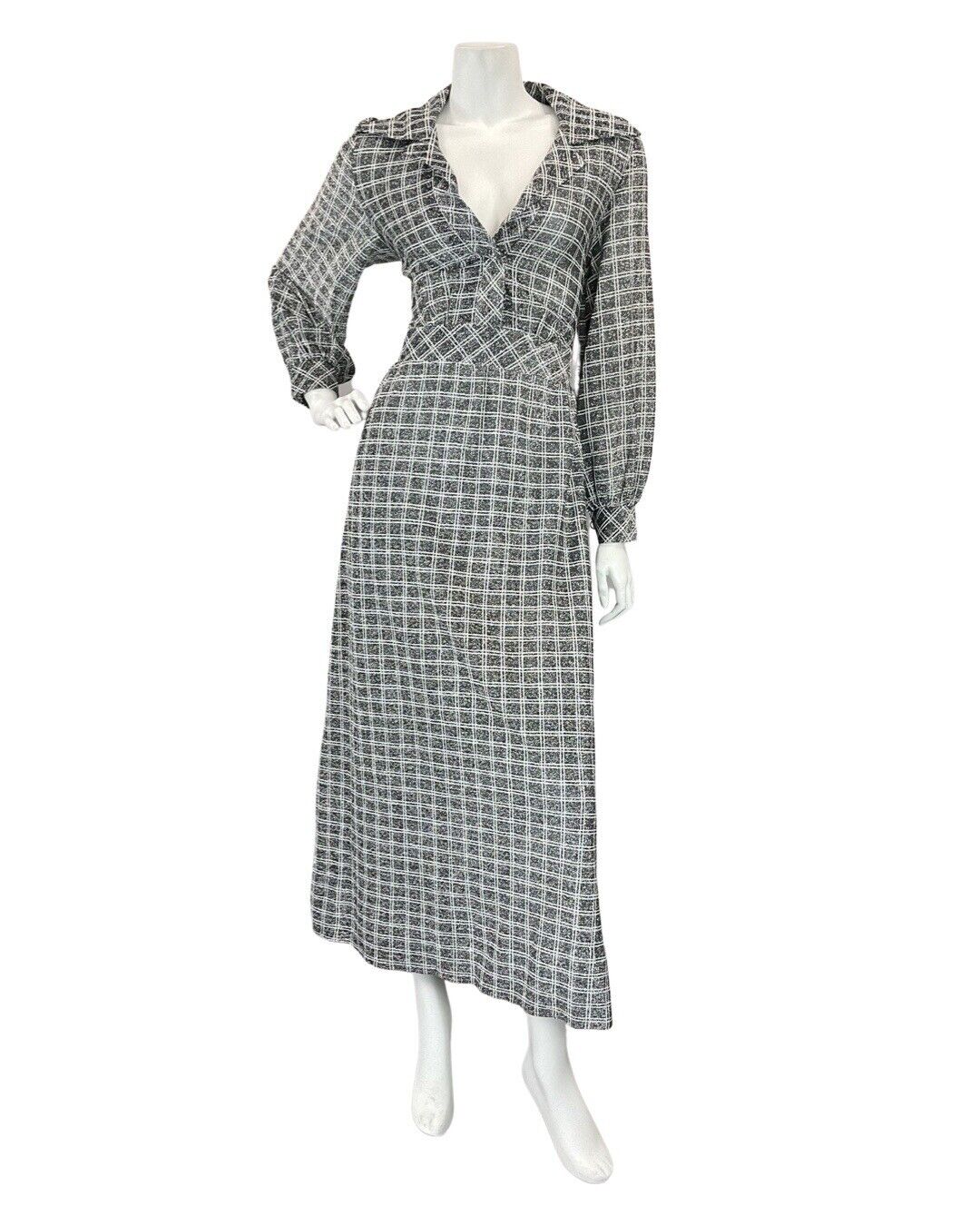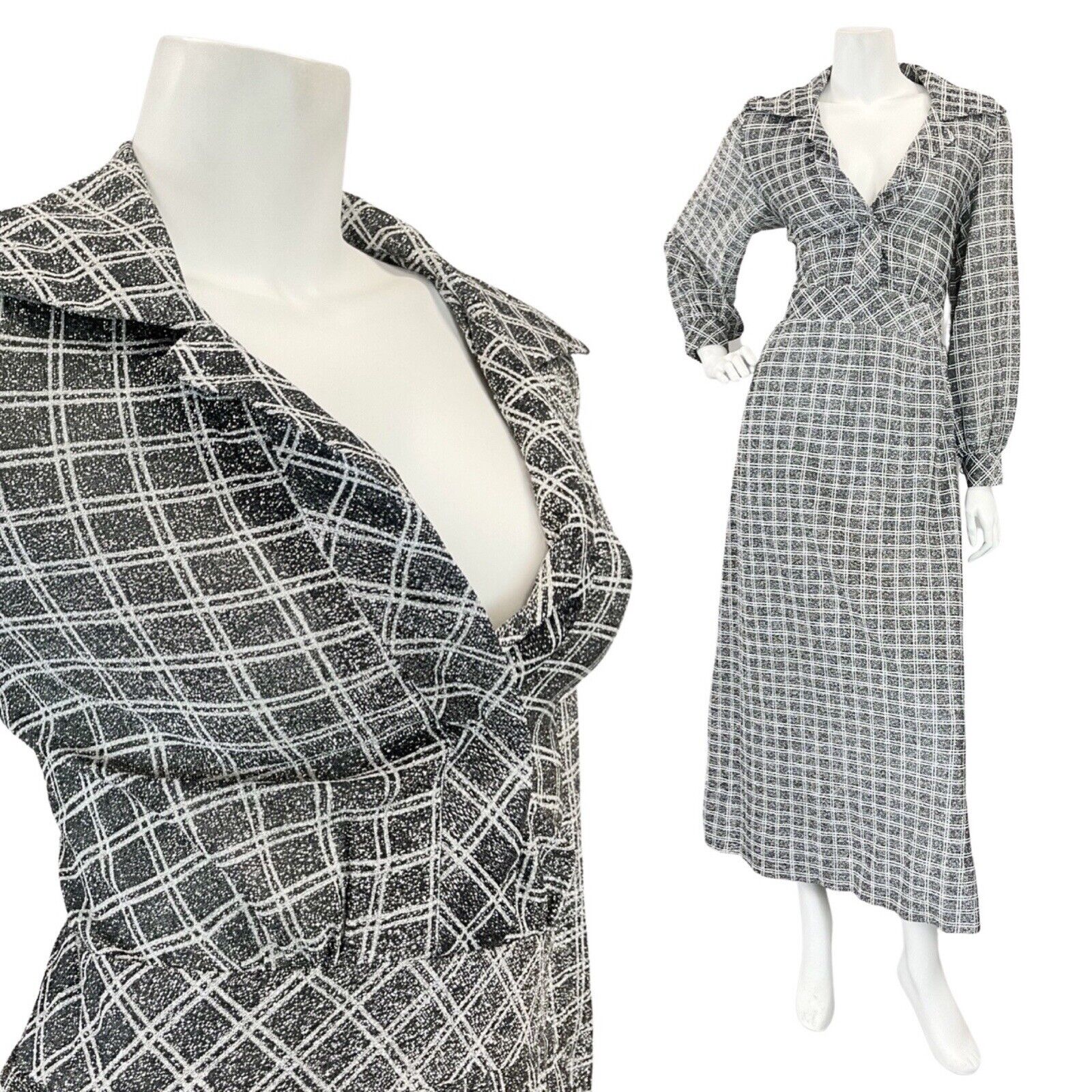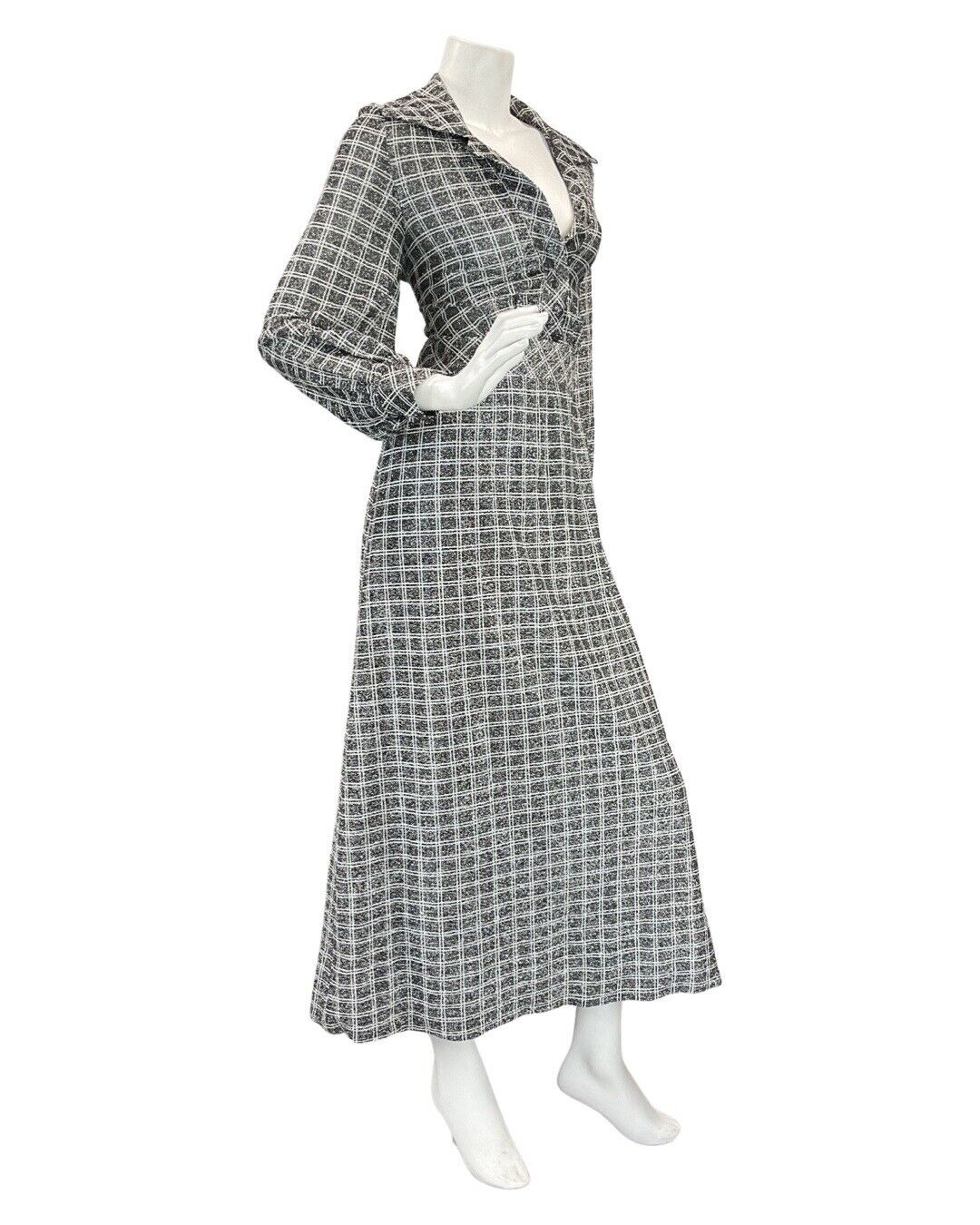 VINTAGE 60s 70s SILVER BLACK GRID CHECKED MOD DAGGER SHIRT MAXI DRESS 12
