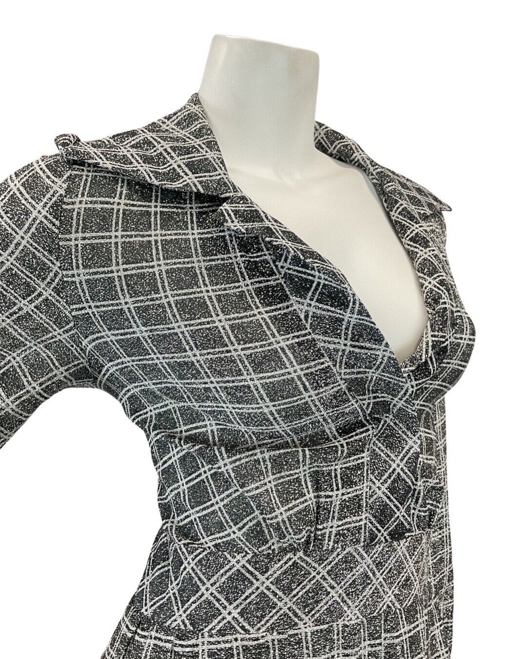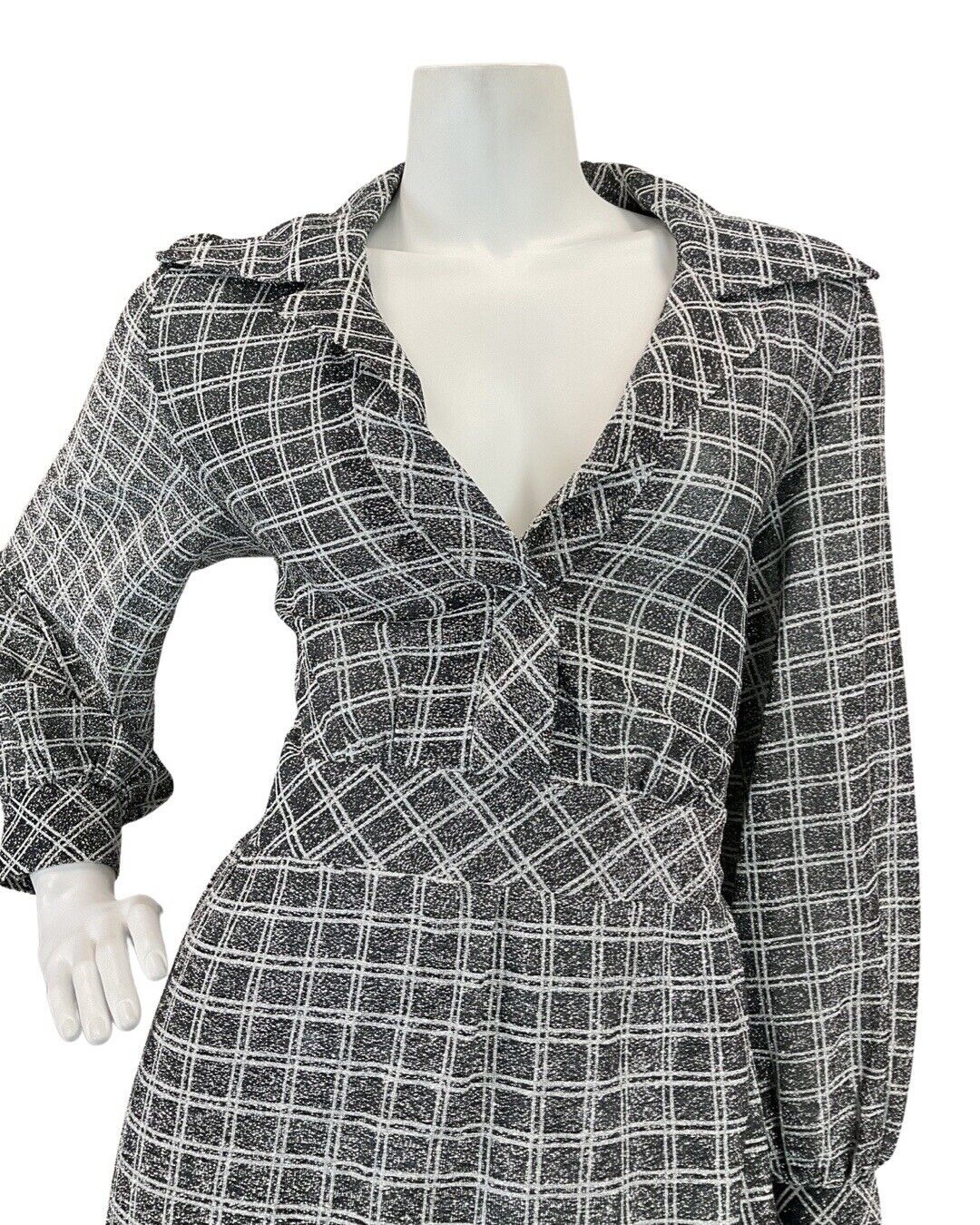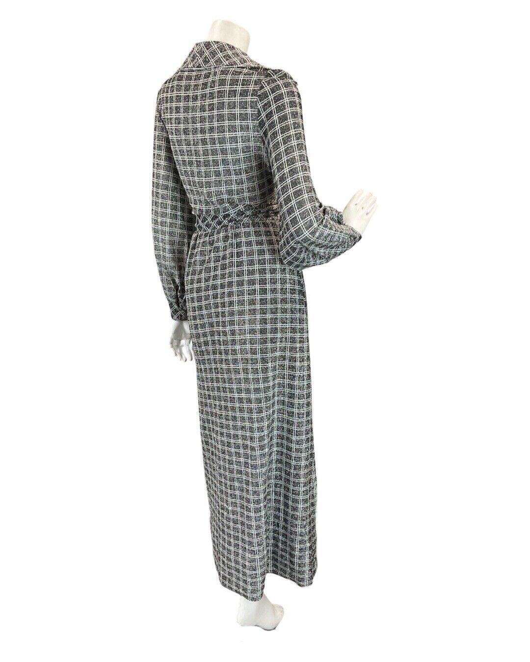 VINTAGE 60s 70s SILVER BLACK GRID CHECKED MOD DAGGER SHIRT MAXI DRESS 12
