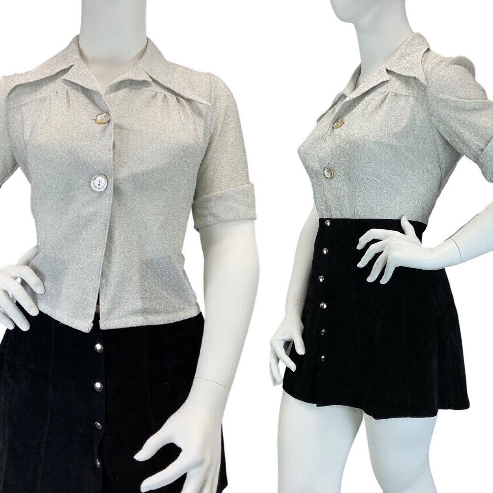 This is a gorgeous vintage shirt made from light-weight, textured, polyester lurex fabric with a good amount of stretch and no additional lining.