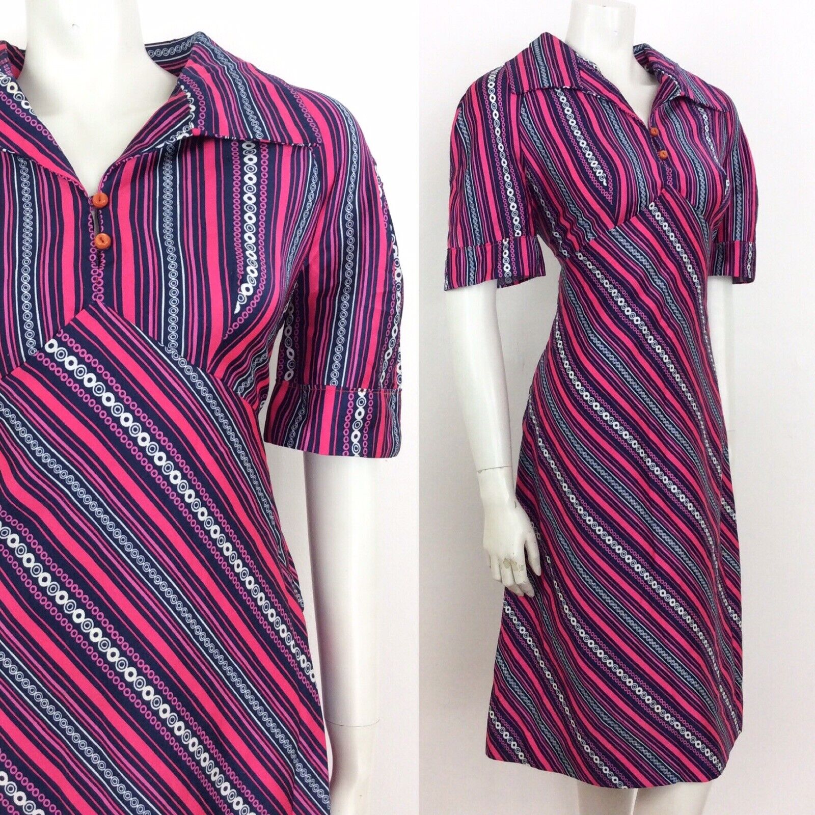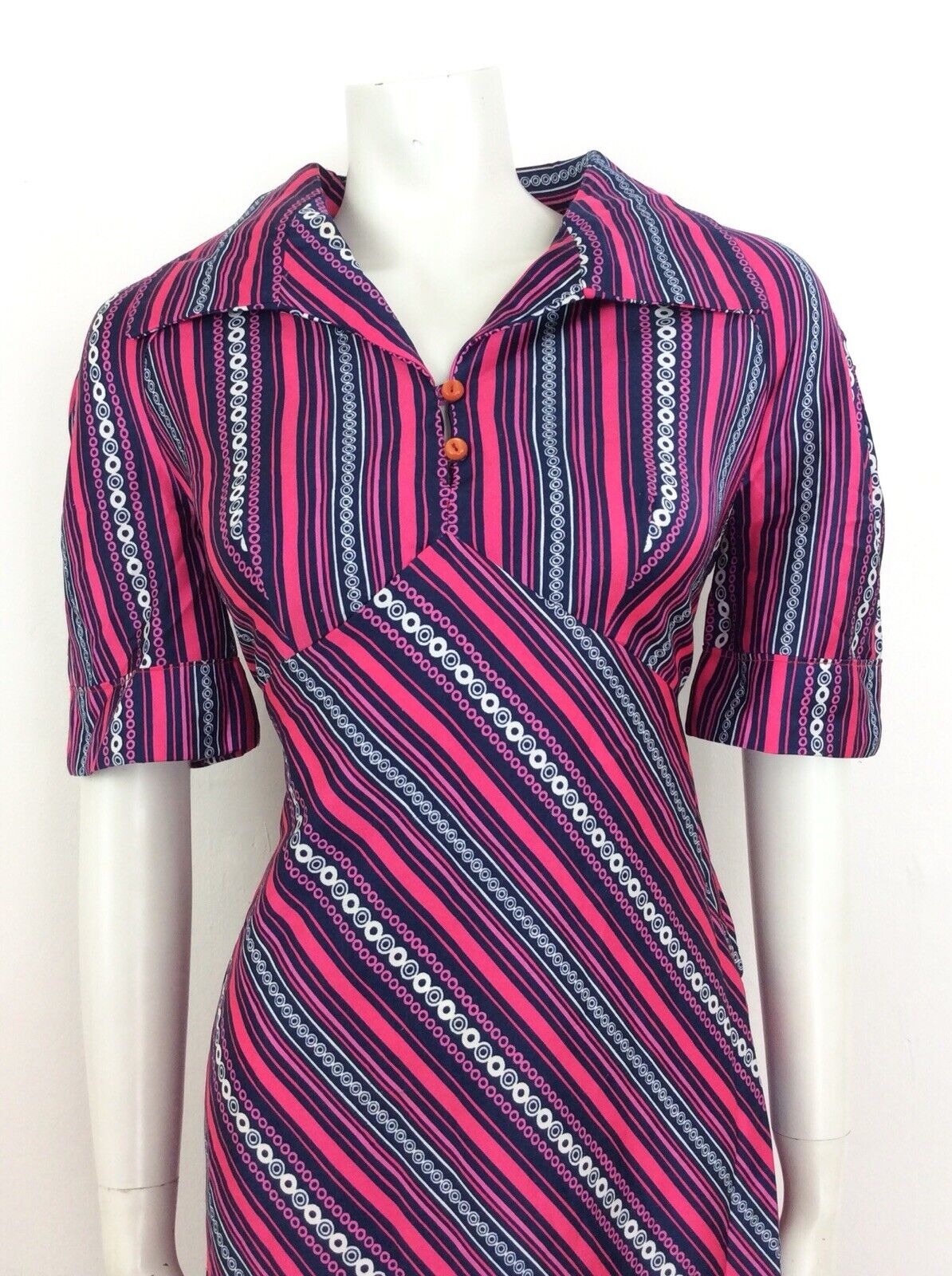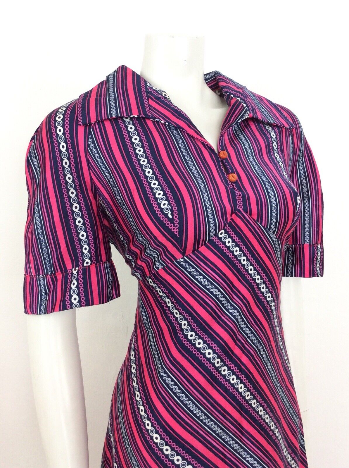 VINTAGE 60s 70s STRIPED CIRCLE GEOMETRIC SHIRT DRESS PINK BLUE WHITE 14