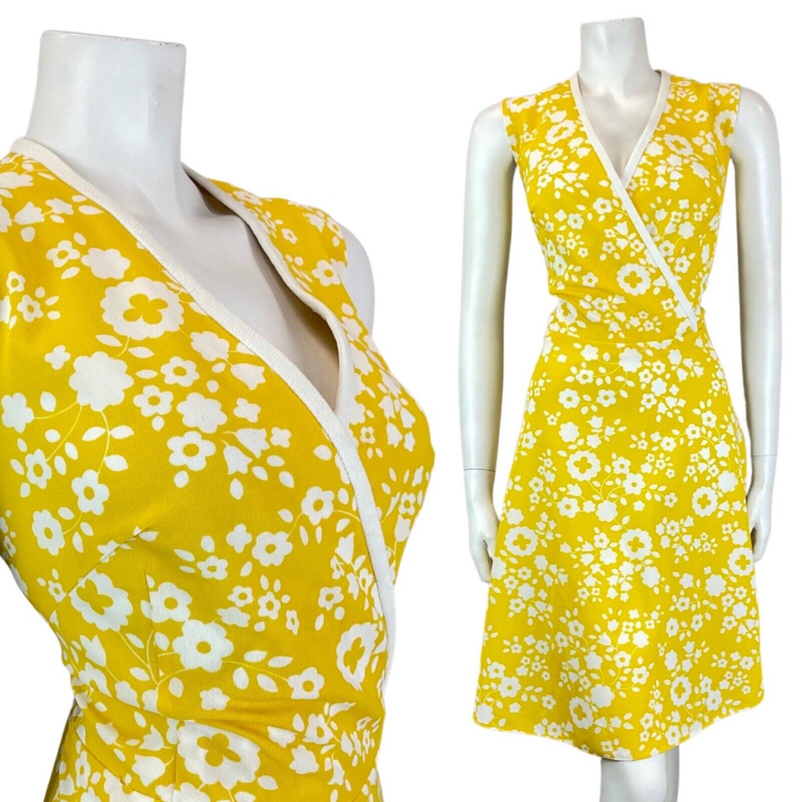 VINTAGE 60s 70s SUNSHINE YELLOW WHITE DAISY FLOWER MOD SLEEVELESS DRESS 14