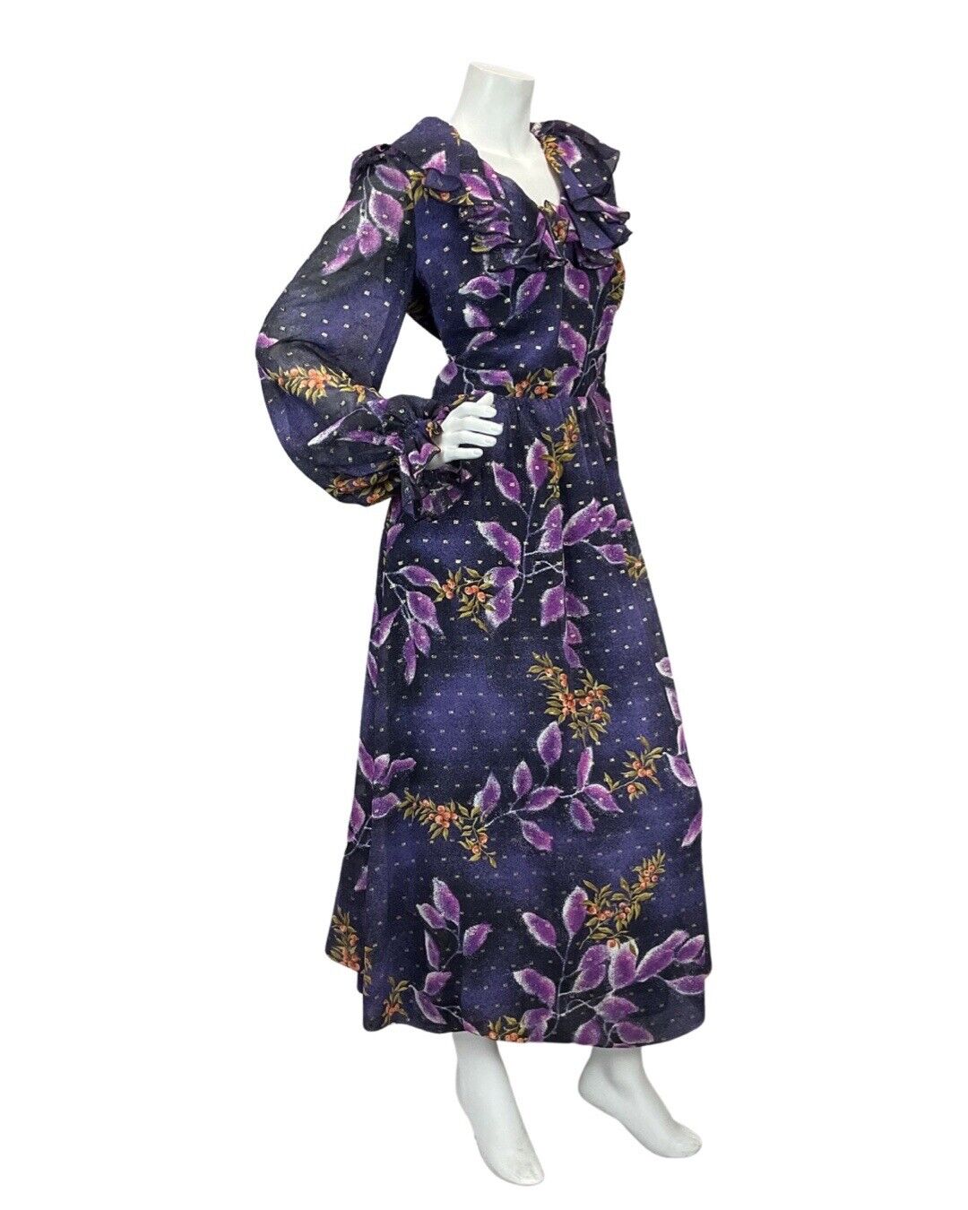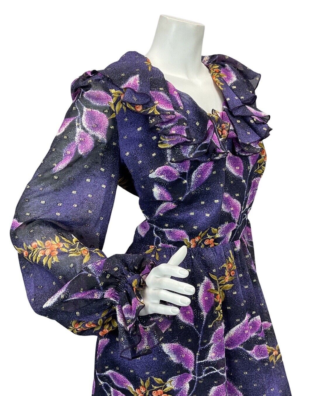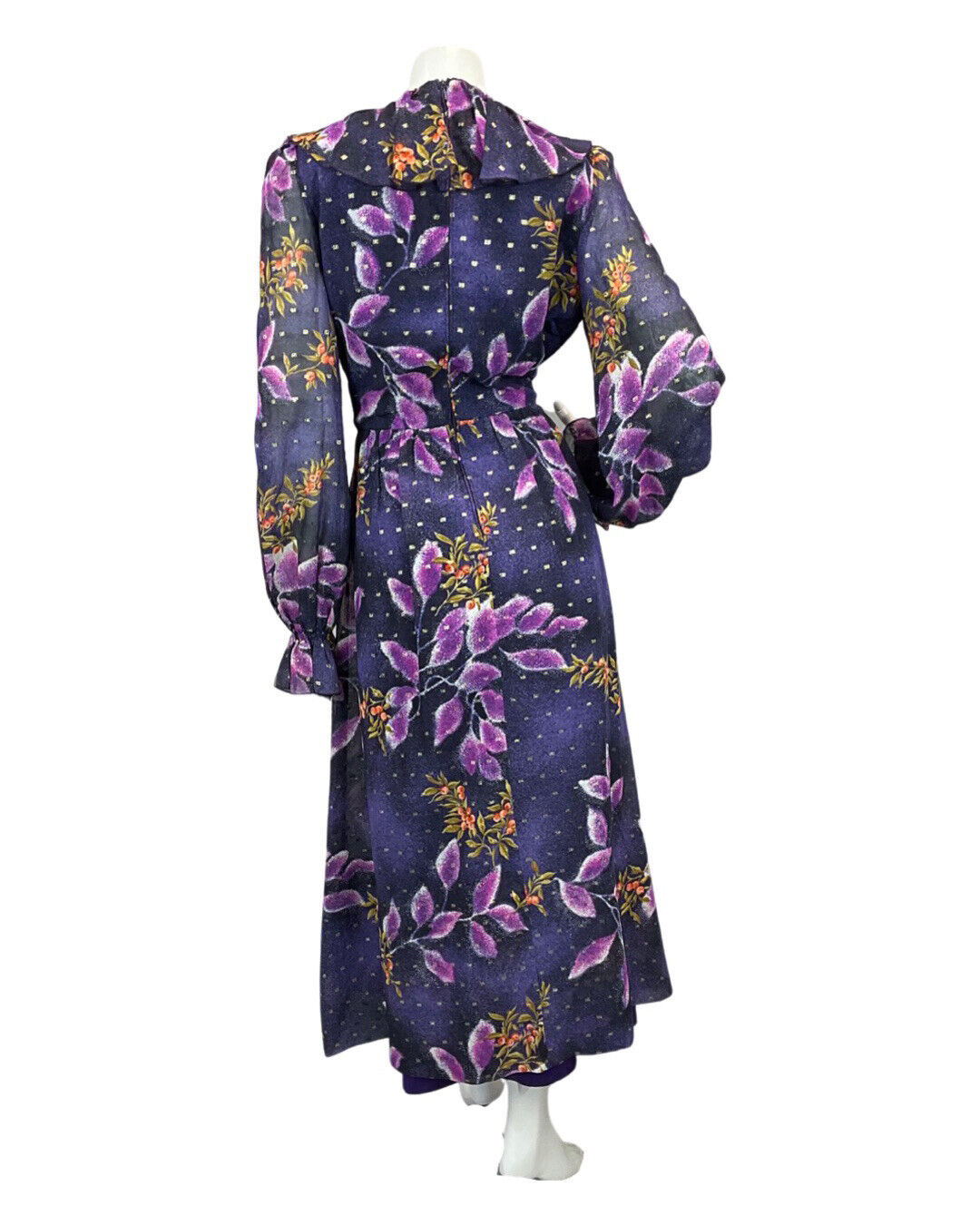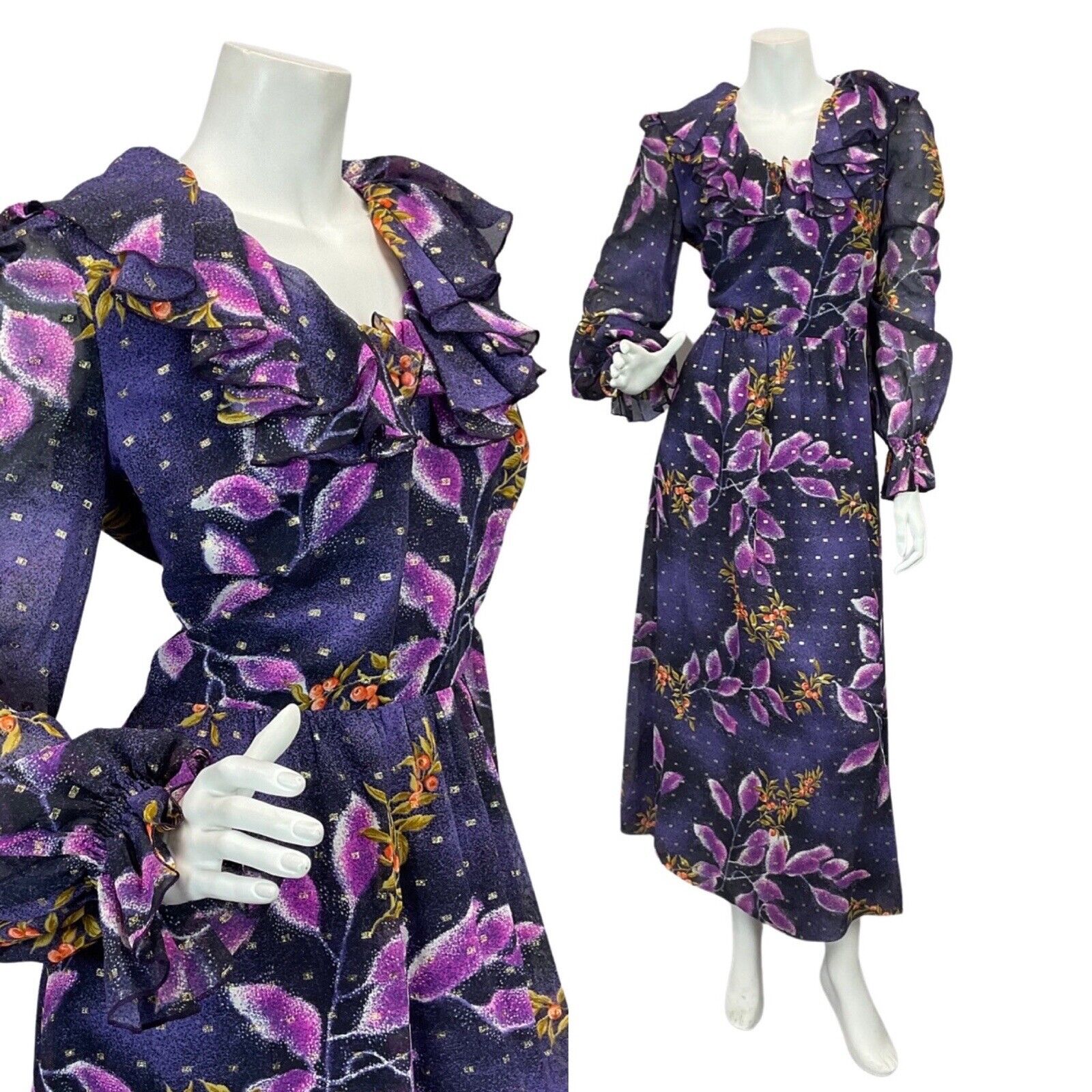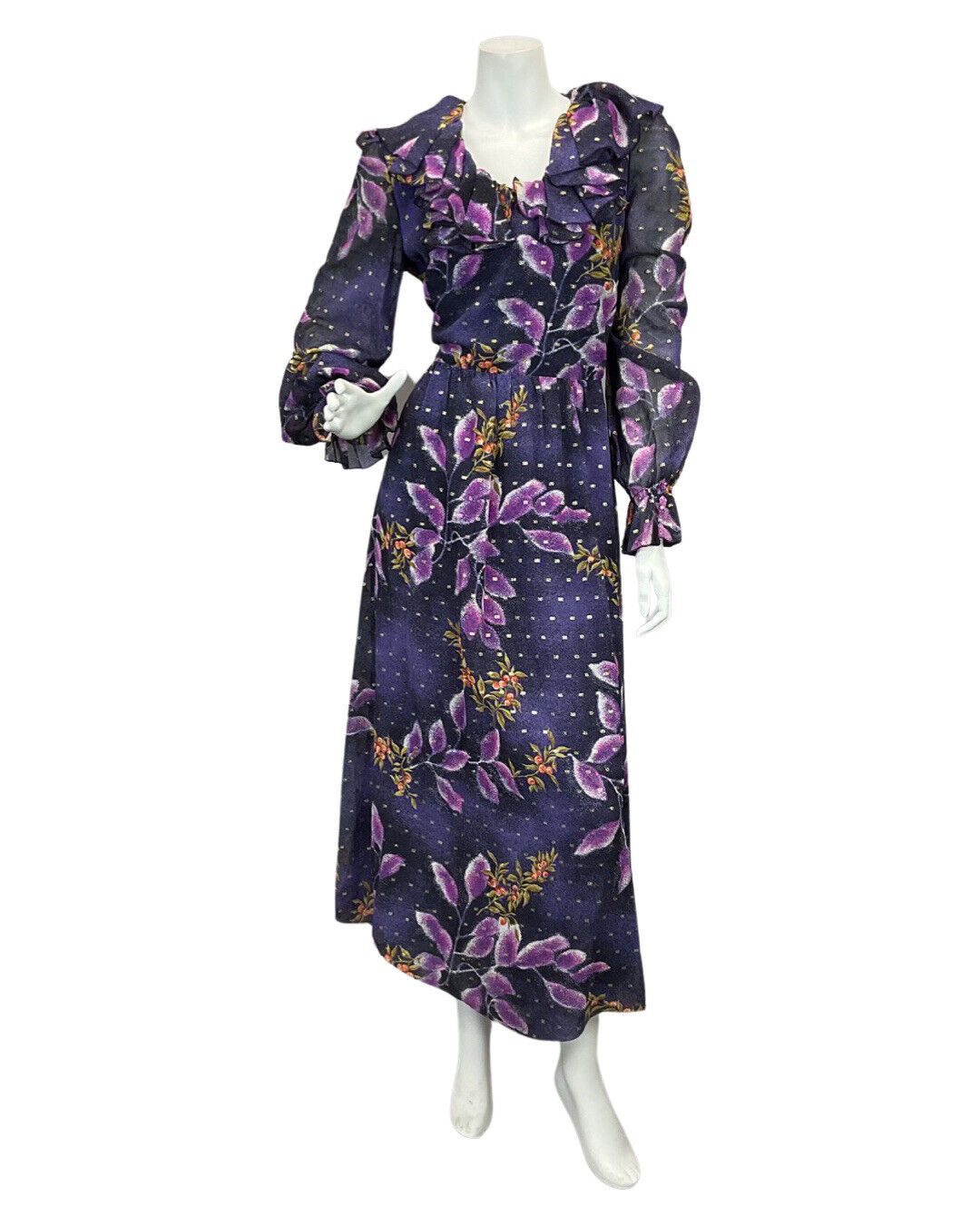 VINTAGE 60s 70s VERA MONT PURPLE NAVY BLUE GOLD LEAF PRINT RUFFLED MAXI DRESS