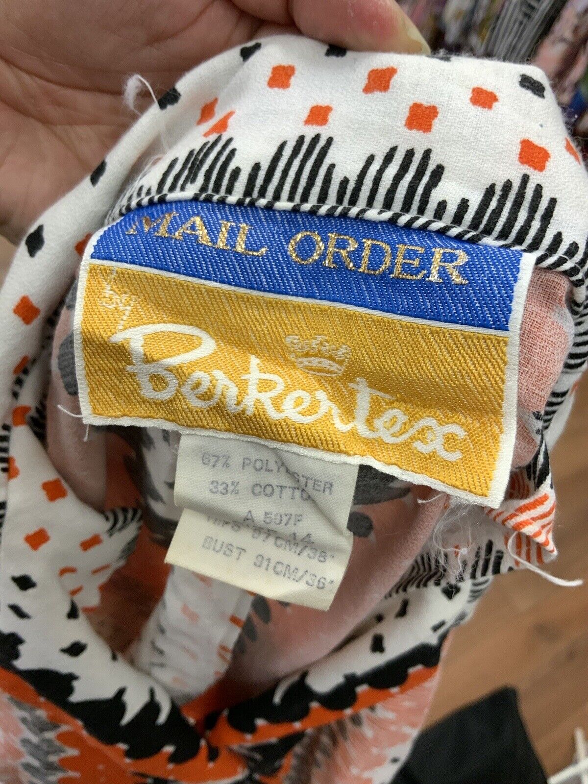 VINTAGE 60s 70s WHITE BLACK ORANGE STRIPED GEOMETRIC MOD DAGGER SHIRT DRESS 10