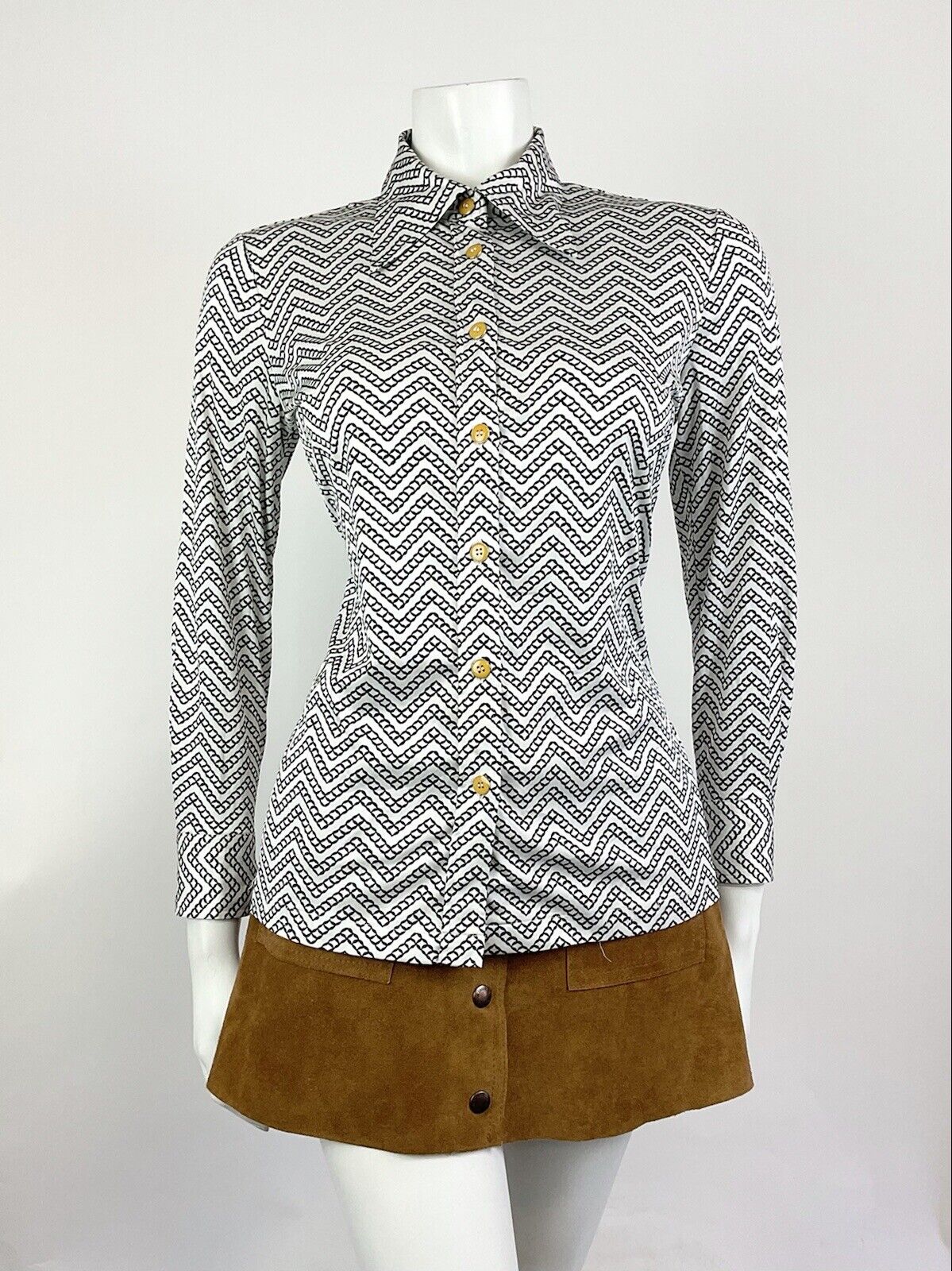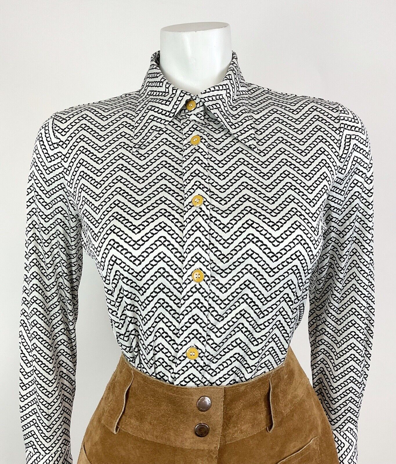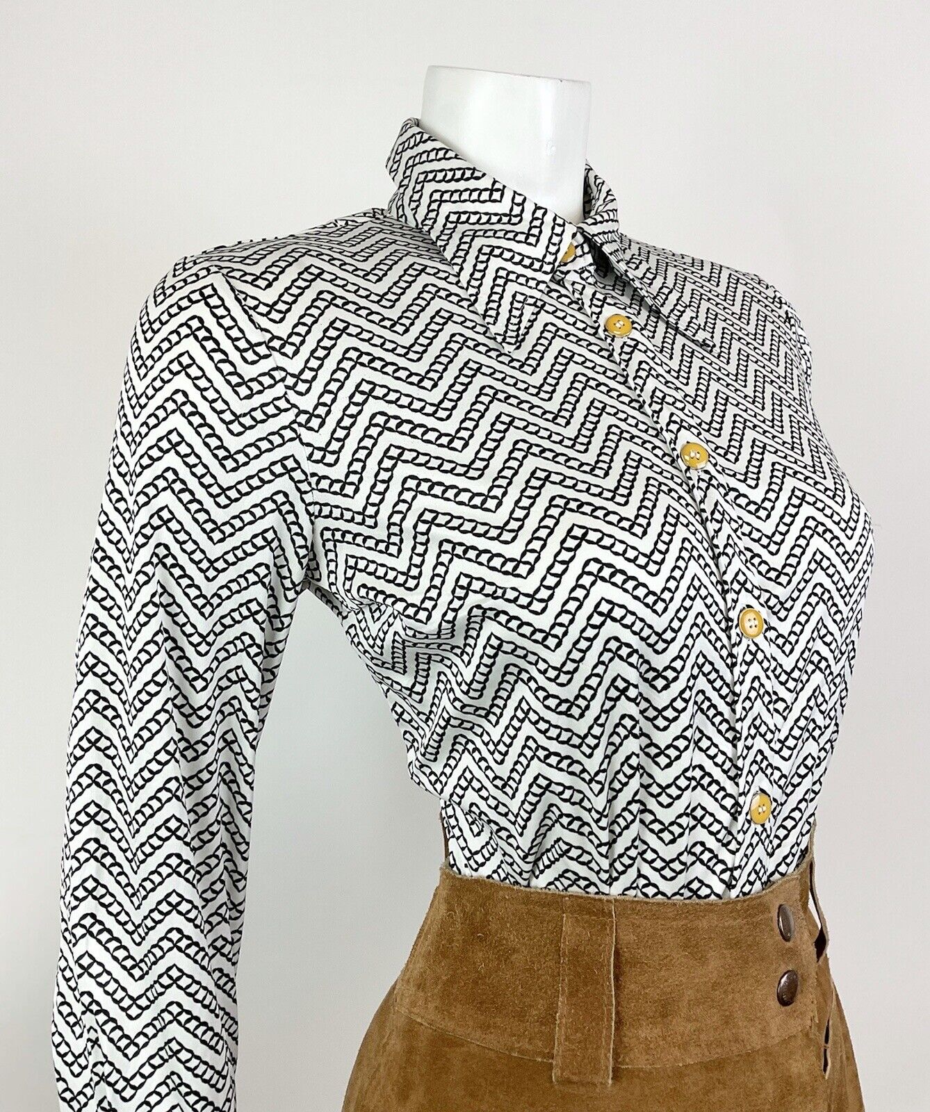 VINTAGE 60s 70s WHITE BLACK ZIG-ZAG CHAIN-LINK GEOMETRIC MOD DAGGER SHIRT 12