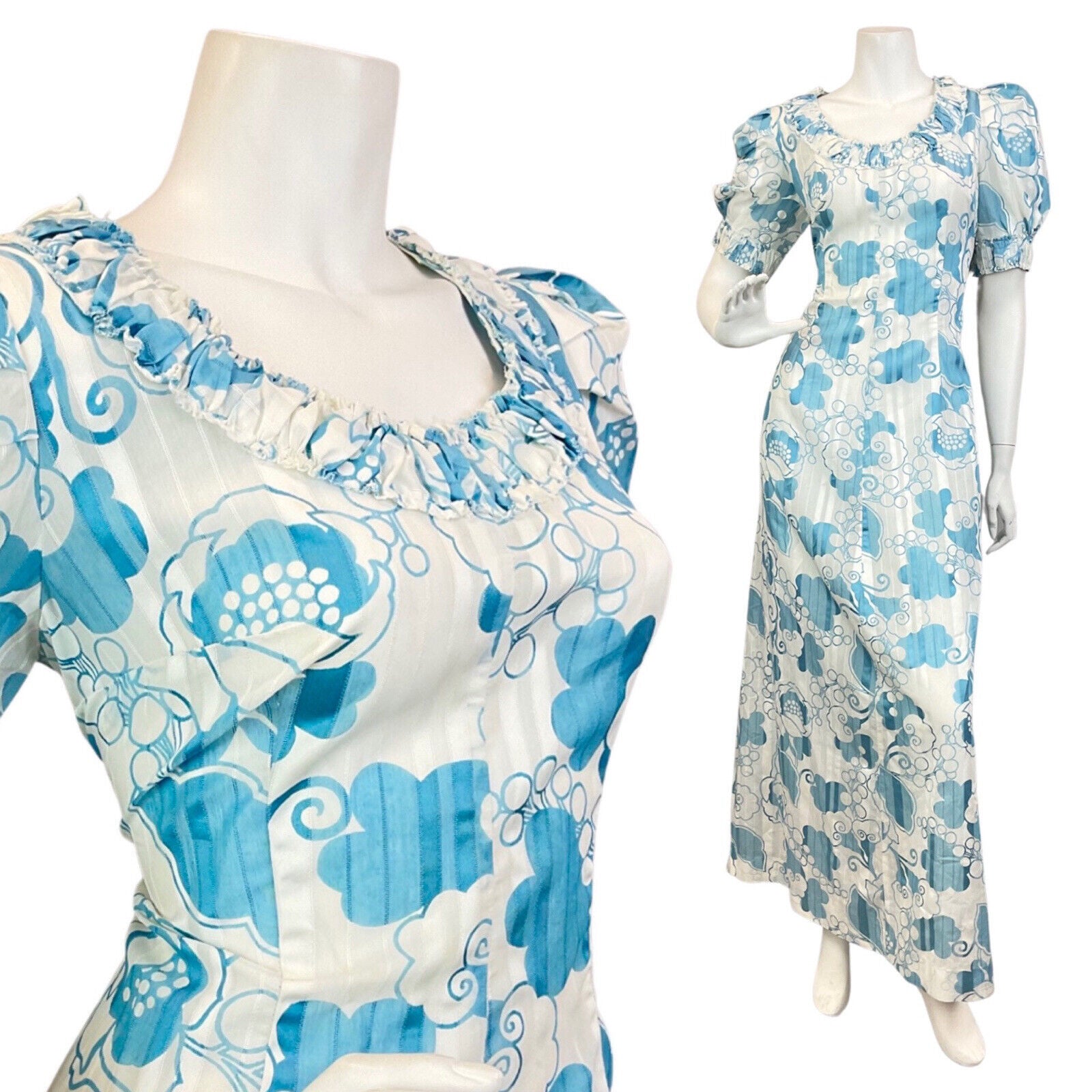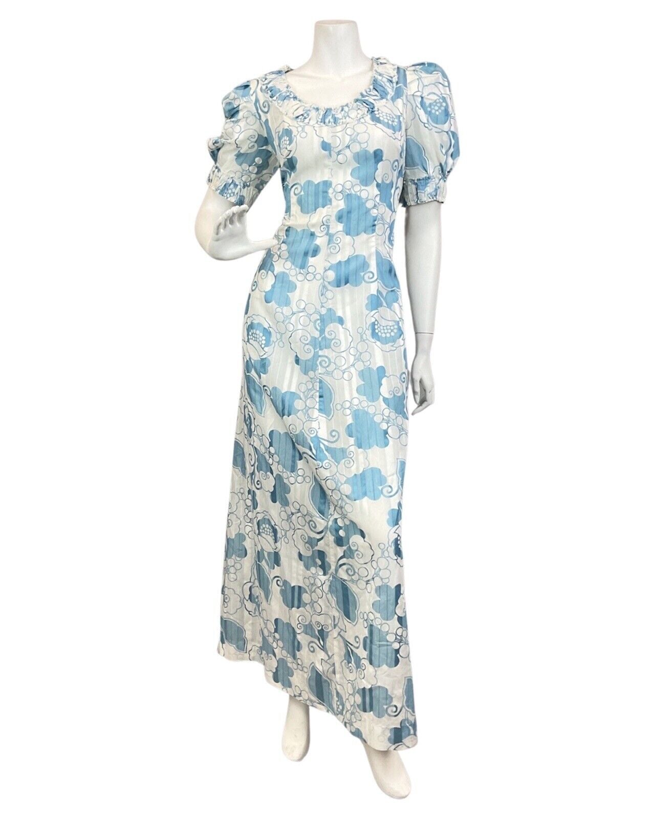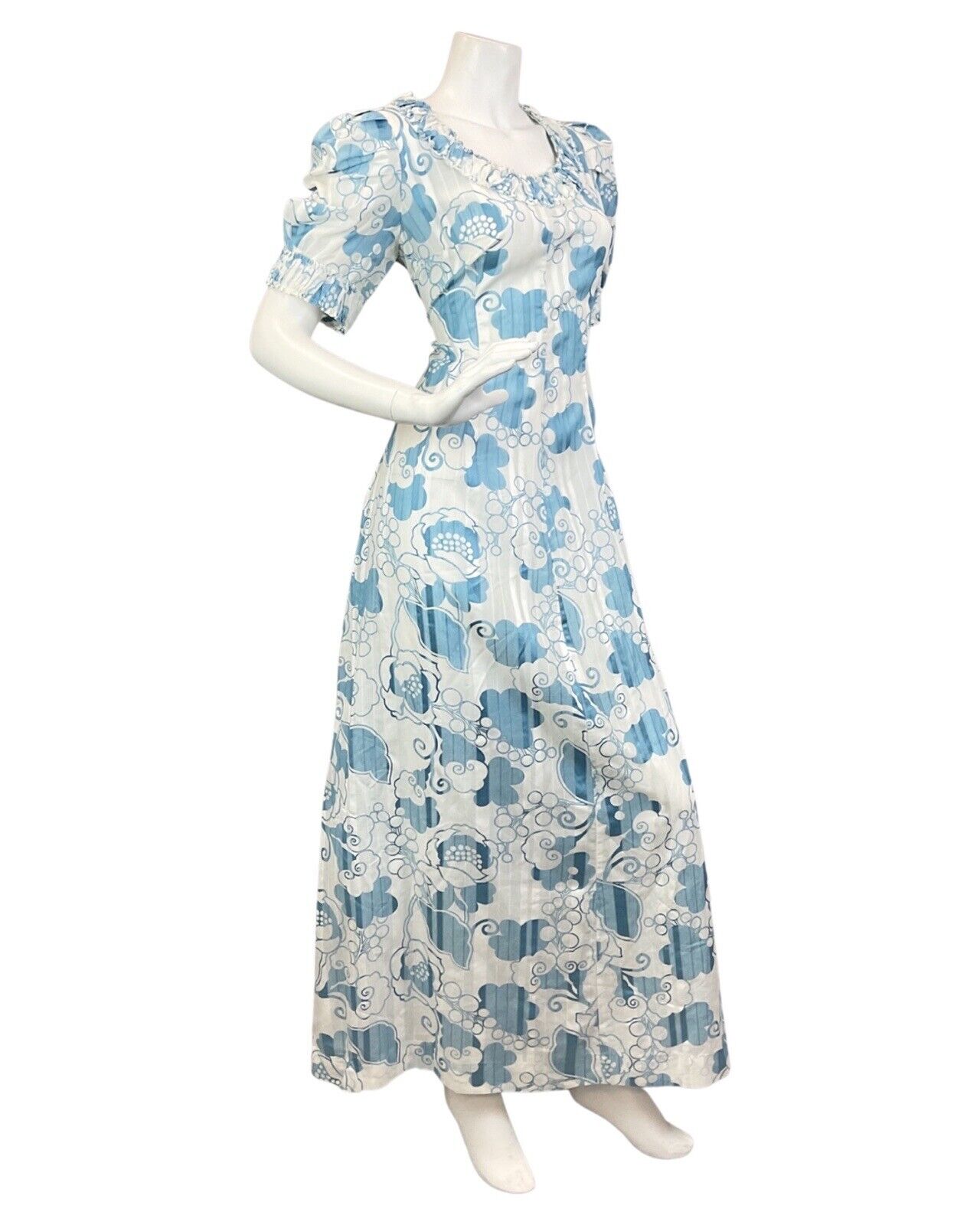 VINTAGE 60s 70s WHITE BLUE FLORAL SWIRLY MOD STRIPED SHEER MAXI DRESS 12