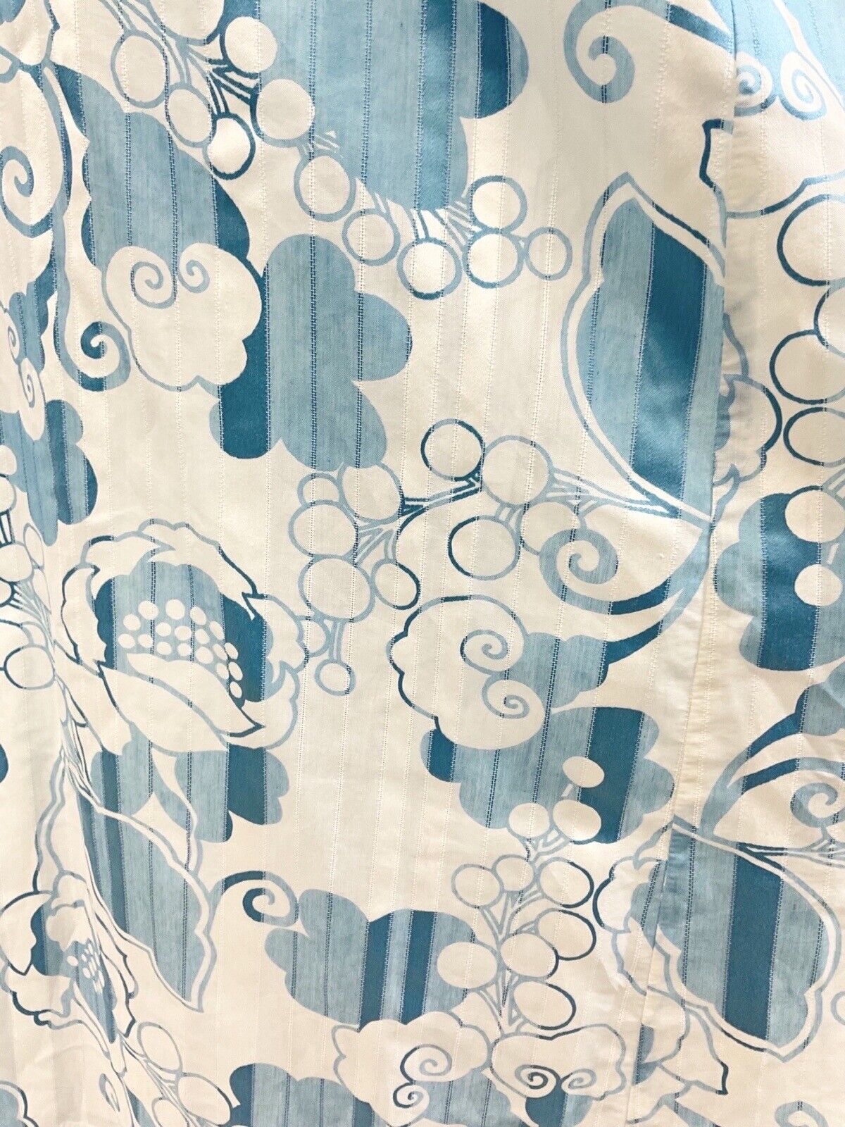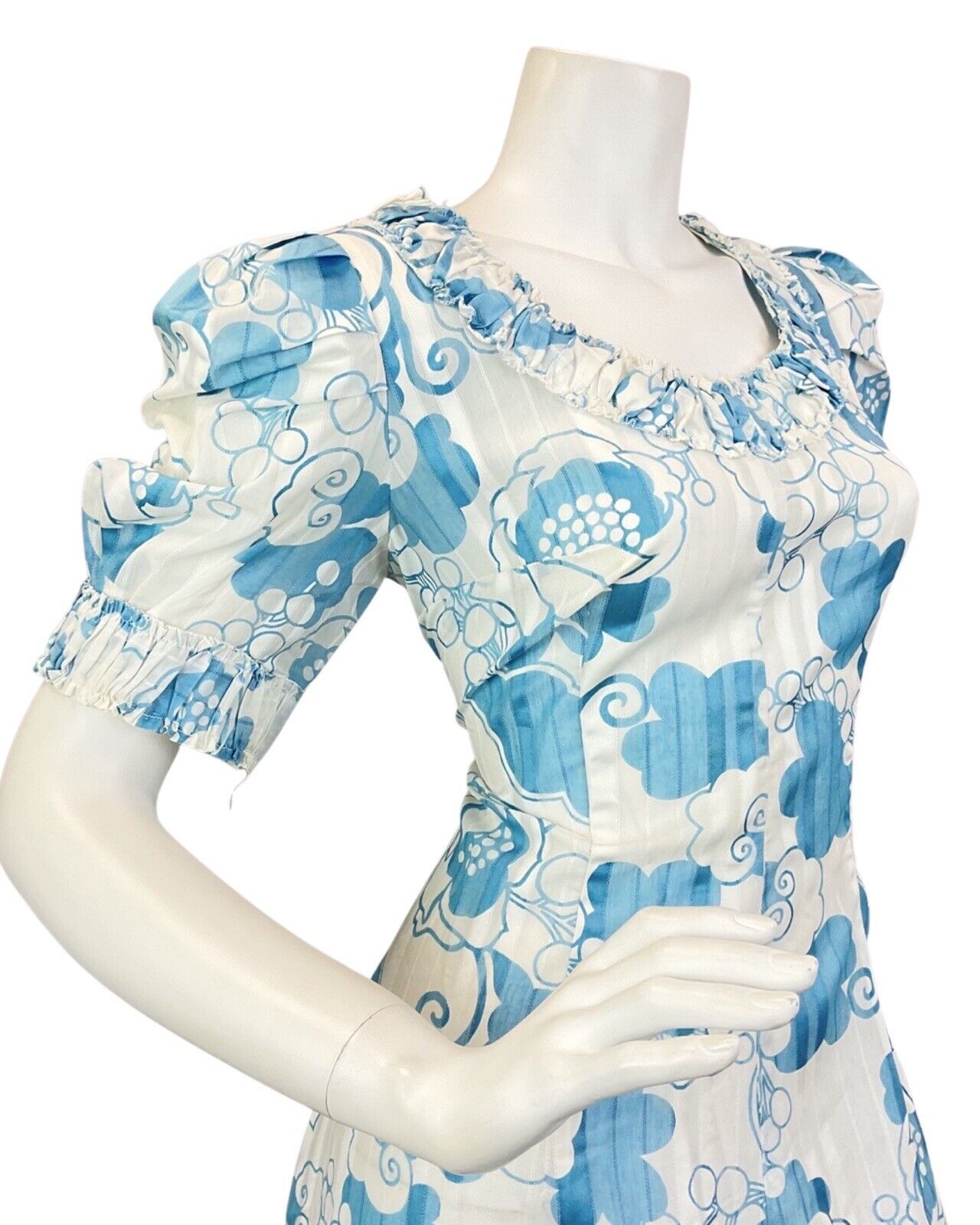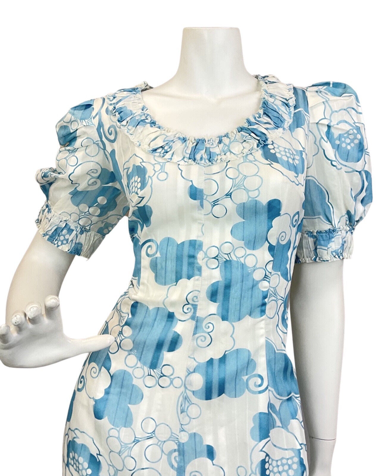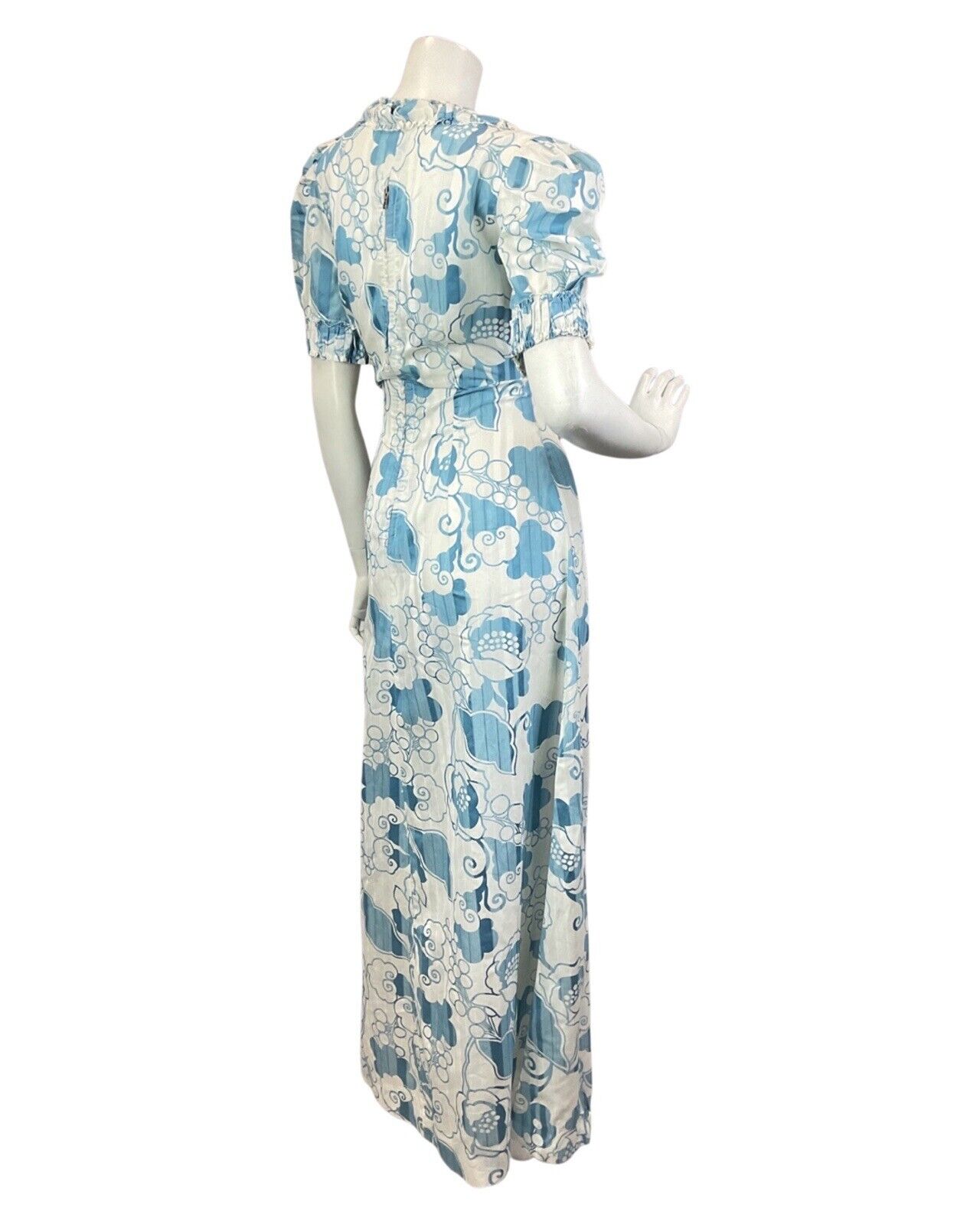 VINTAGE 60s 70s WHITE BLUE FLORAL SWIRLY MOD STRIPED SHEER MAXI DRESS 12