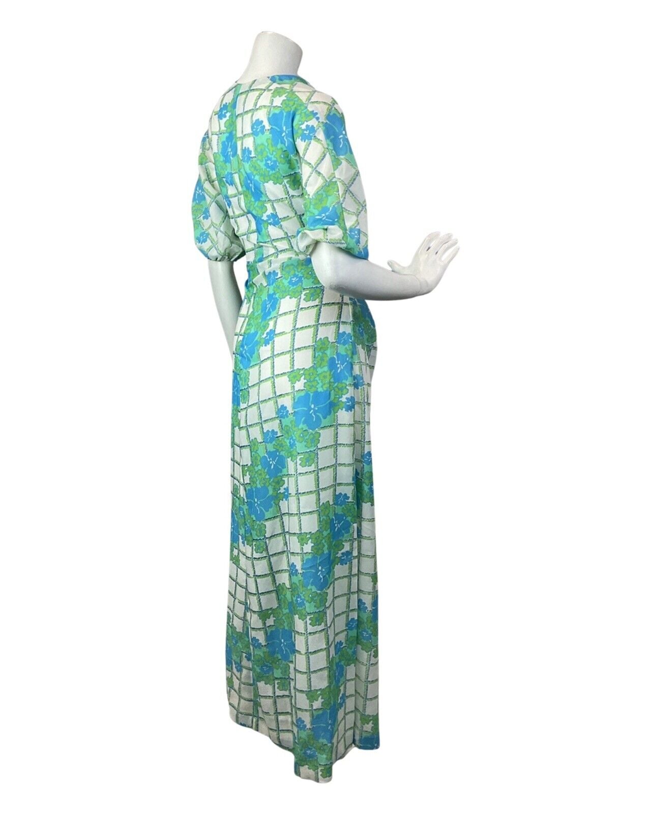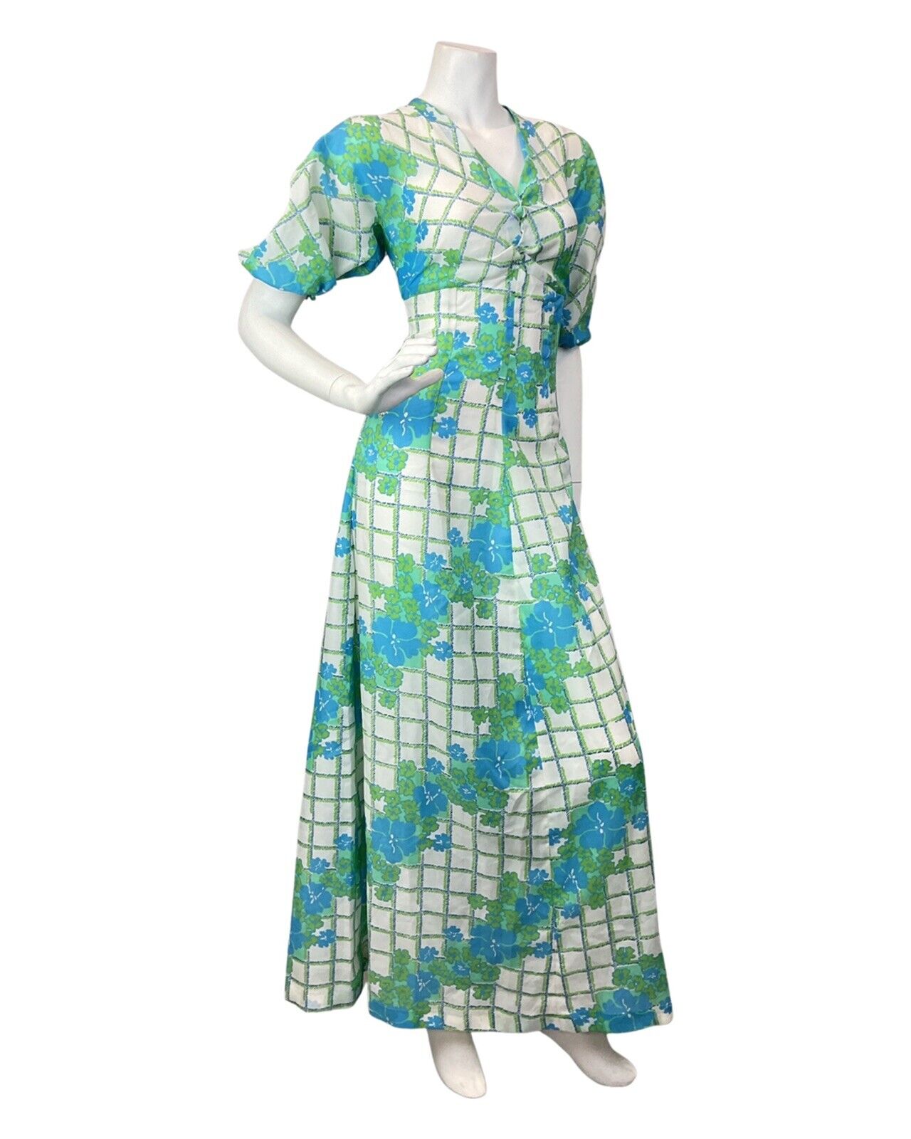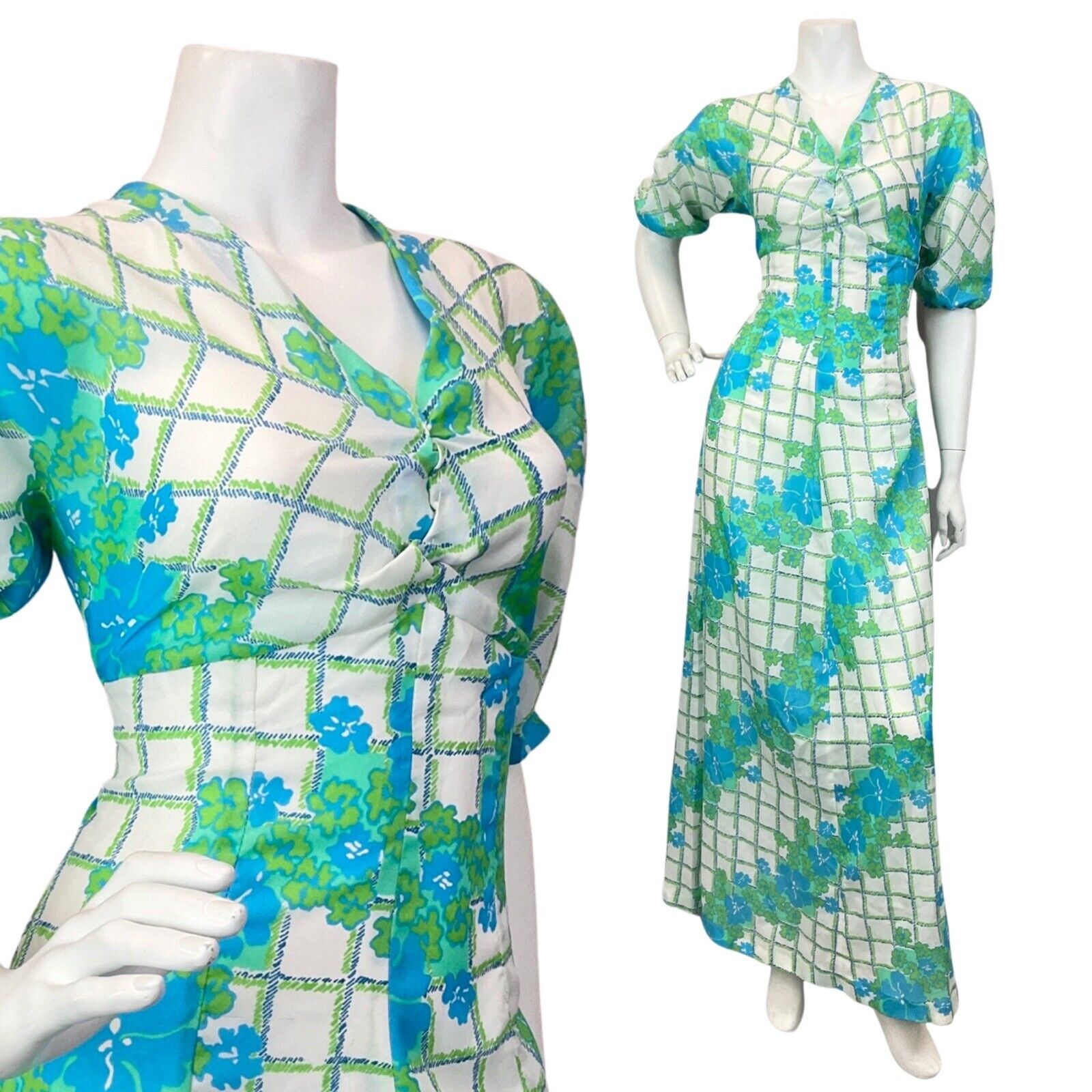 VINTAGE 60s 70s WHITE BLUE GREEN CHECKED FLORAL MOD MAXI DRESS 10 12