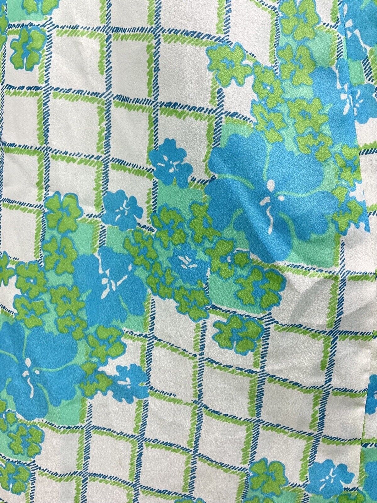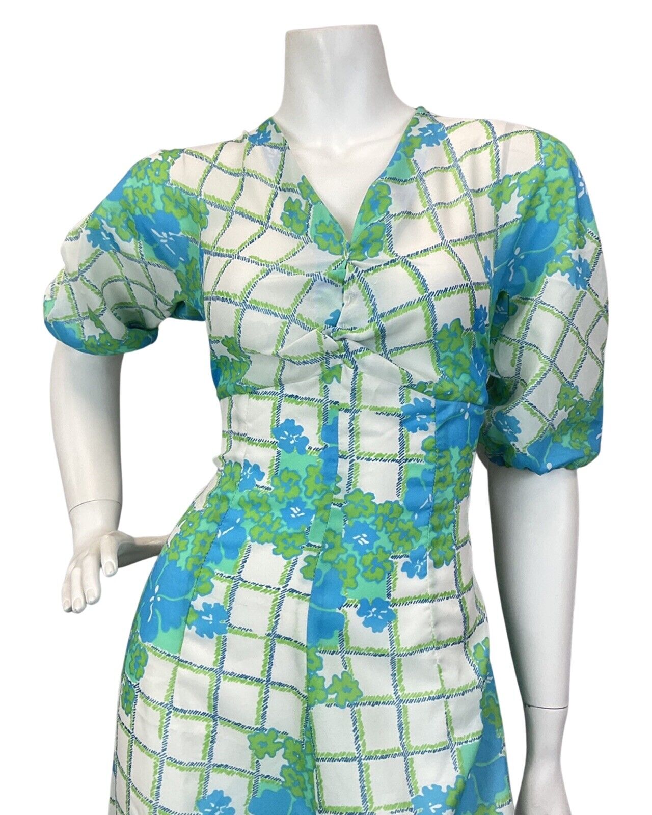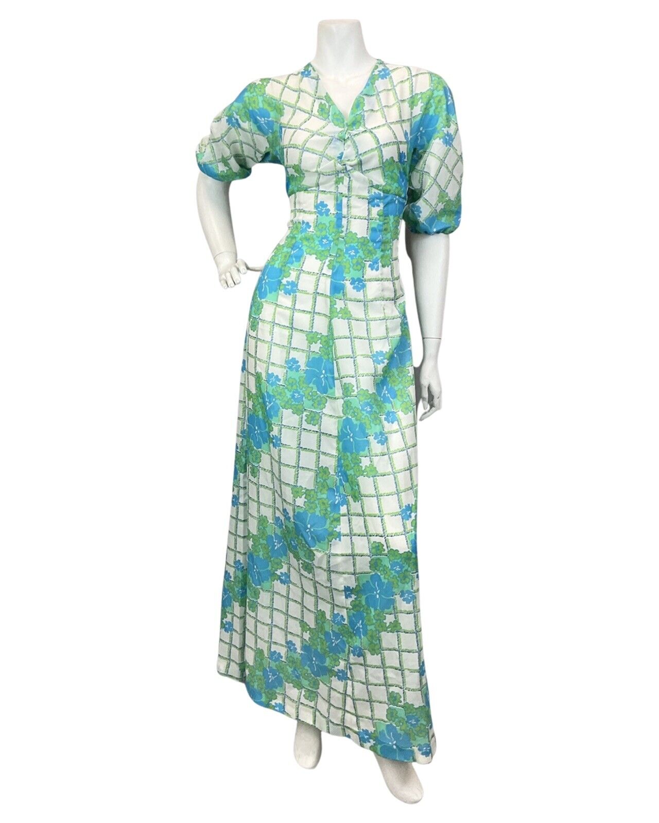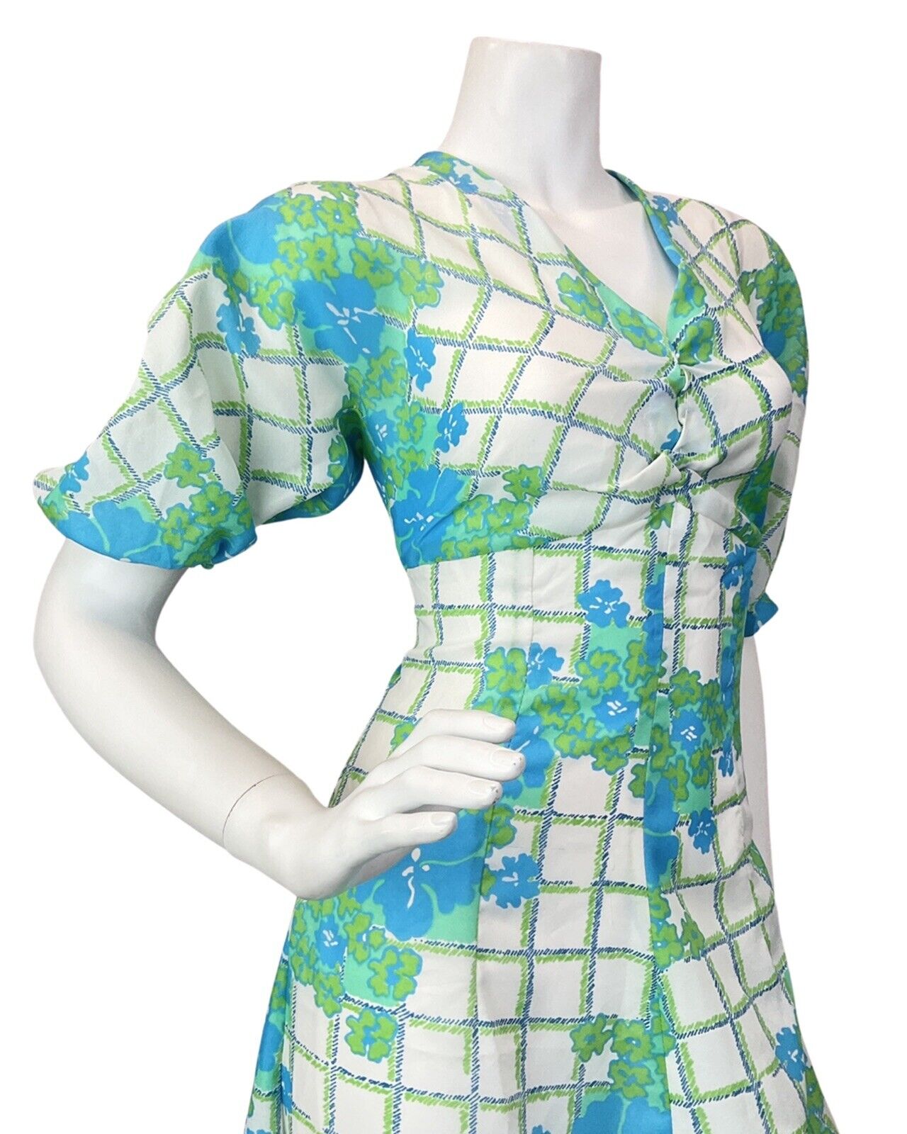VINTAGE 60s 70s WHITE BLUE GREEN CHECKED FLORAL MOD MAXI DRESS 10 12