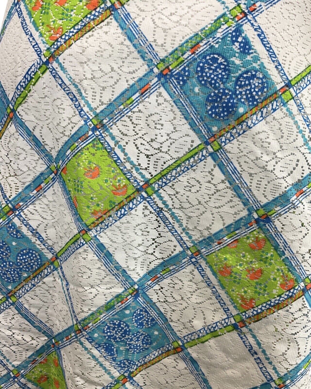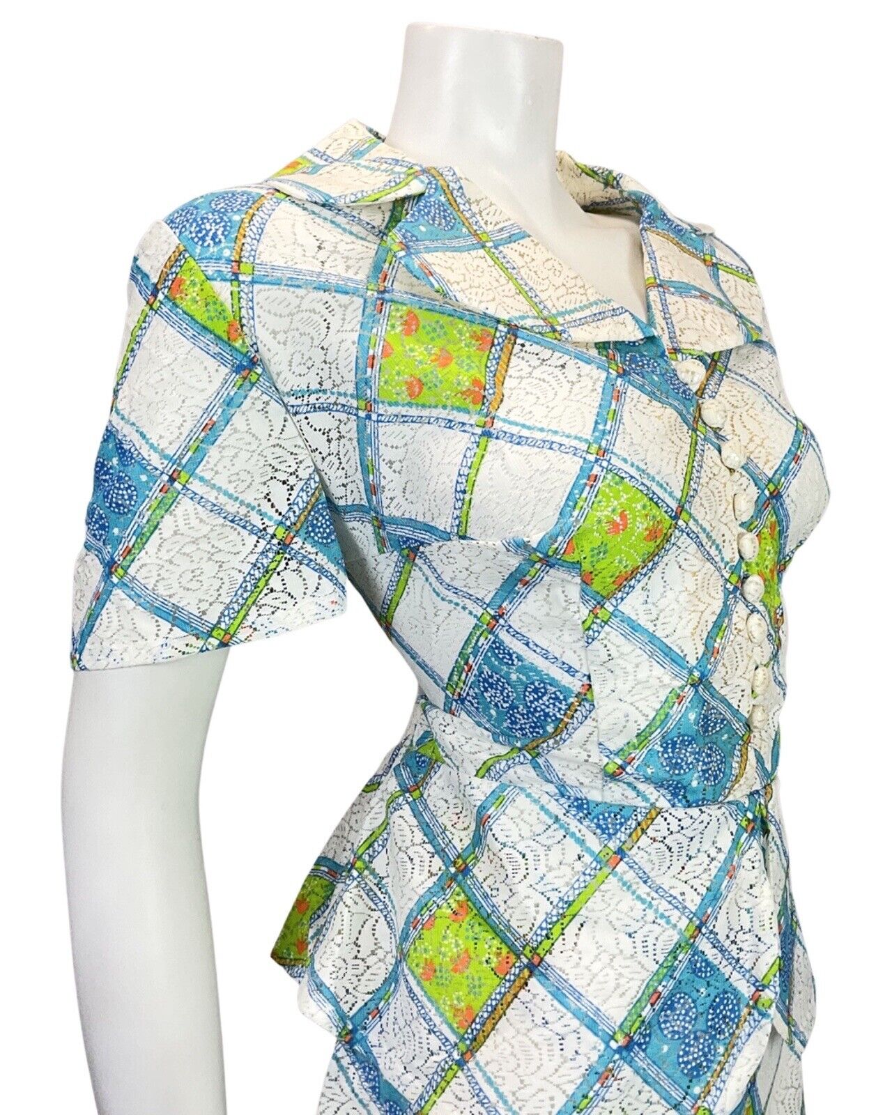VINTAGE 60s 70s WHITE BLUE GREEN CHECKED FLORAL PELUM LACE DRESS 16