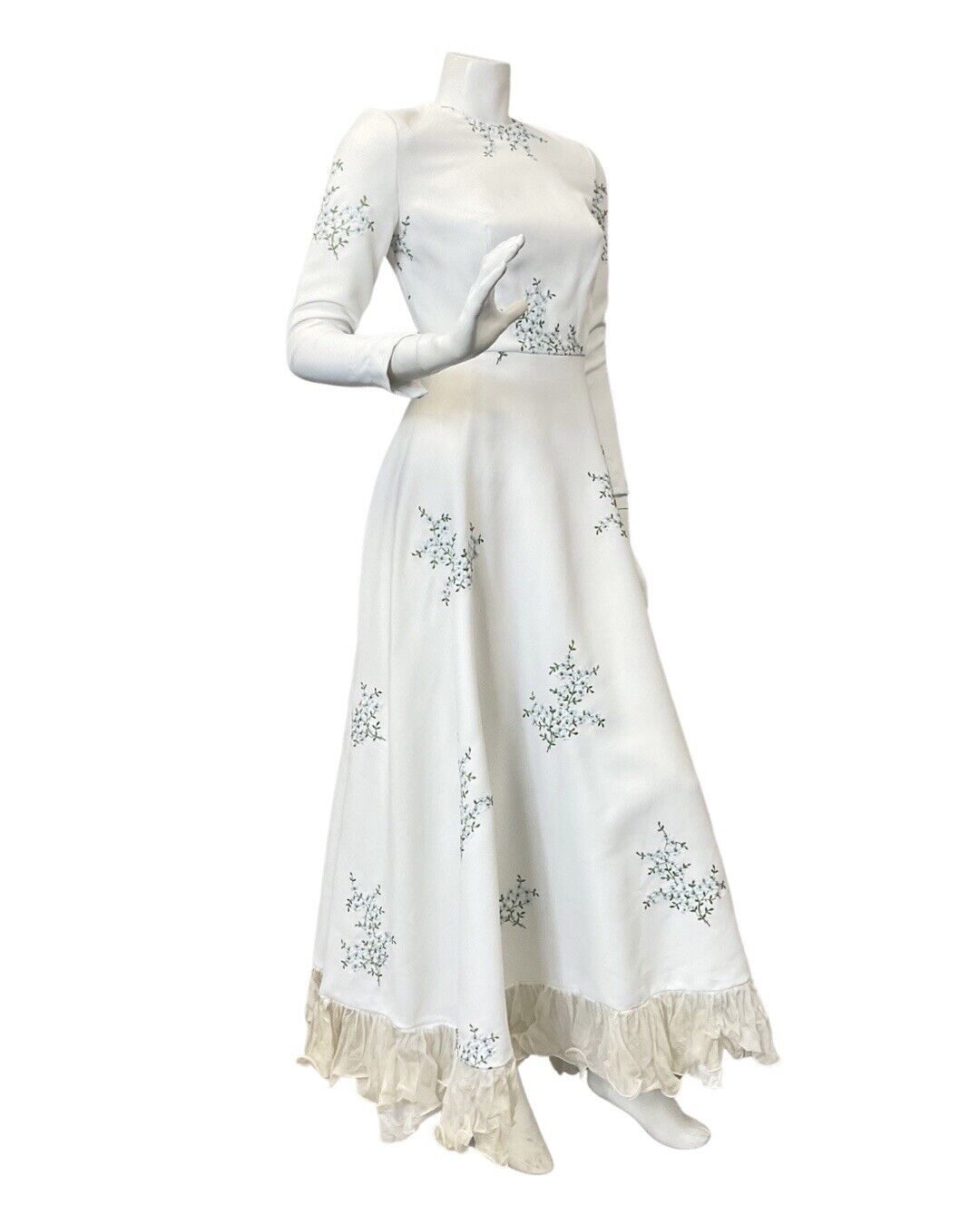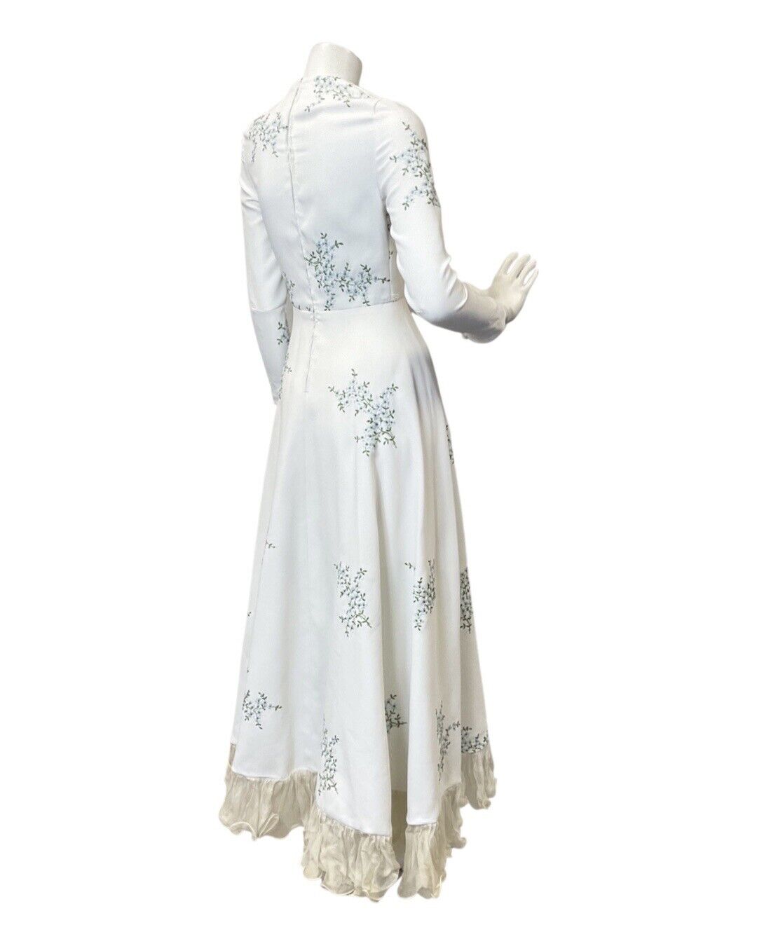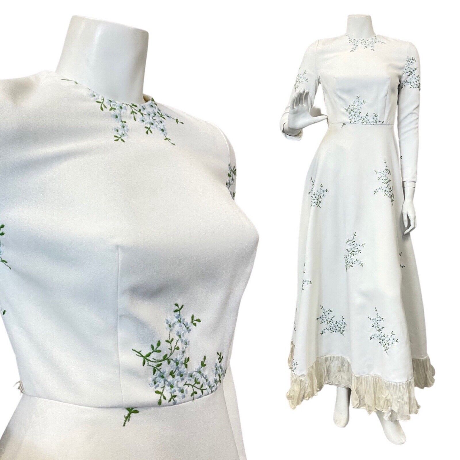 VINTAGE 60s 70s WHITE BLUE GREEN FLORAL EMBROIDERED PRAIRIE WEDDING MAXI DRESS 6