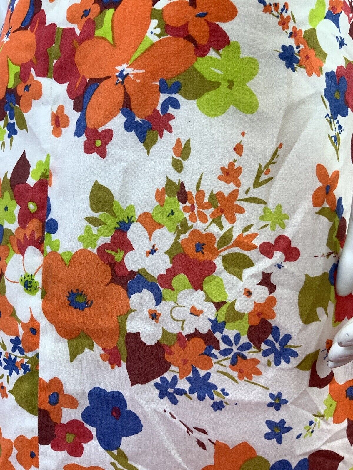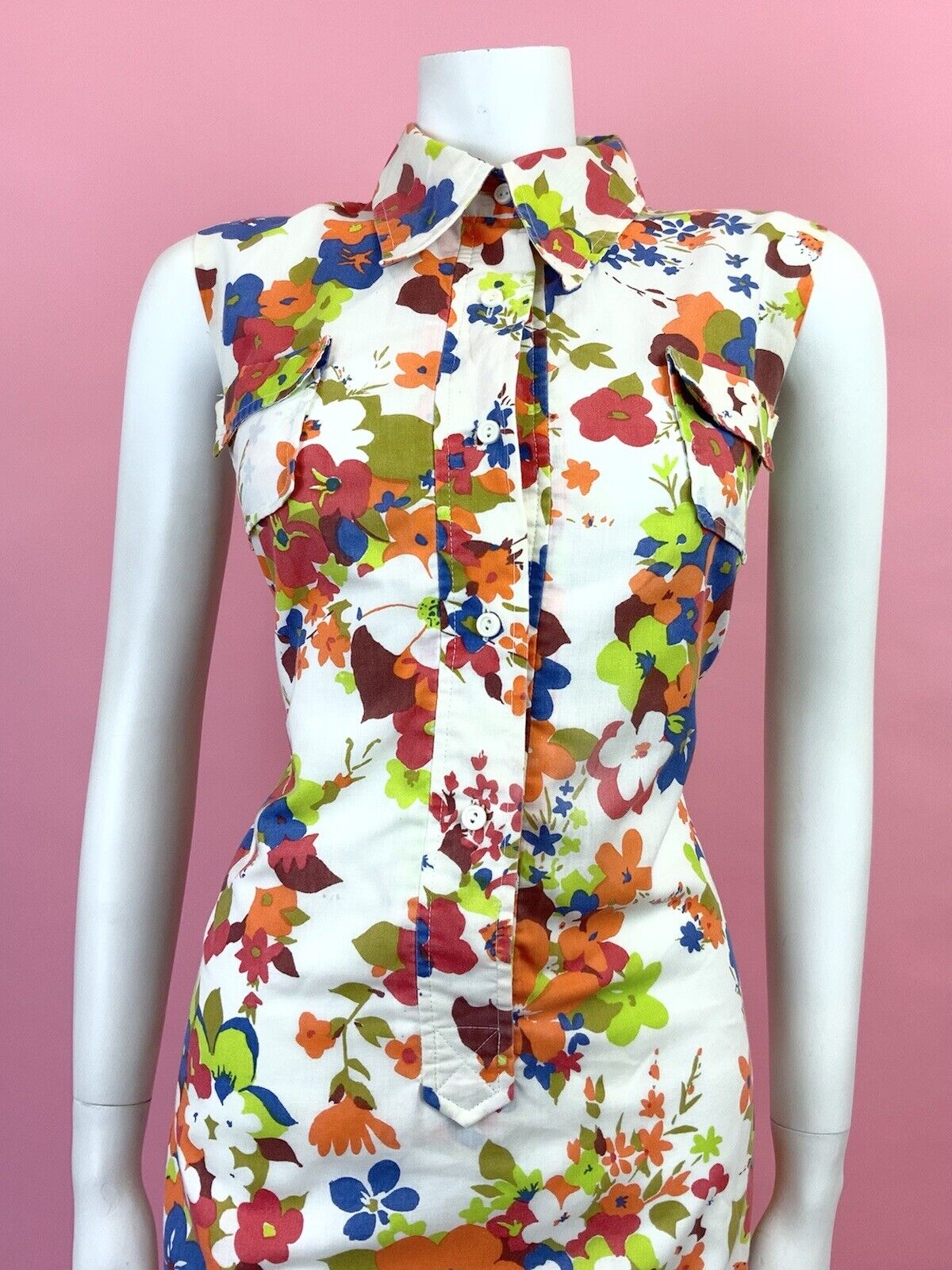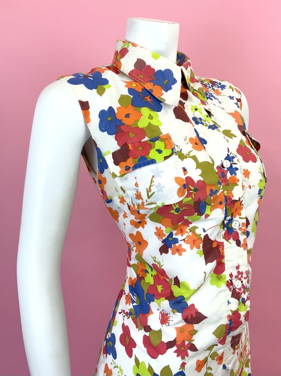 VINTAGE 60s 70s WHITE BLUE ORANGE RED FLORAL MOD SLEEVELESS DAGGER SHIRT 12