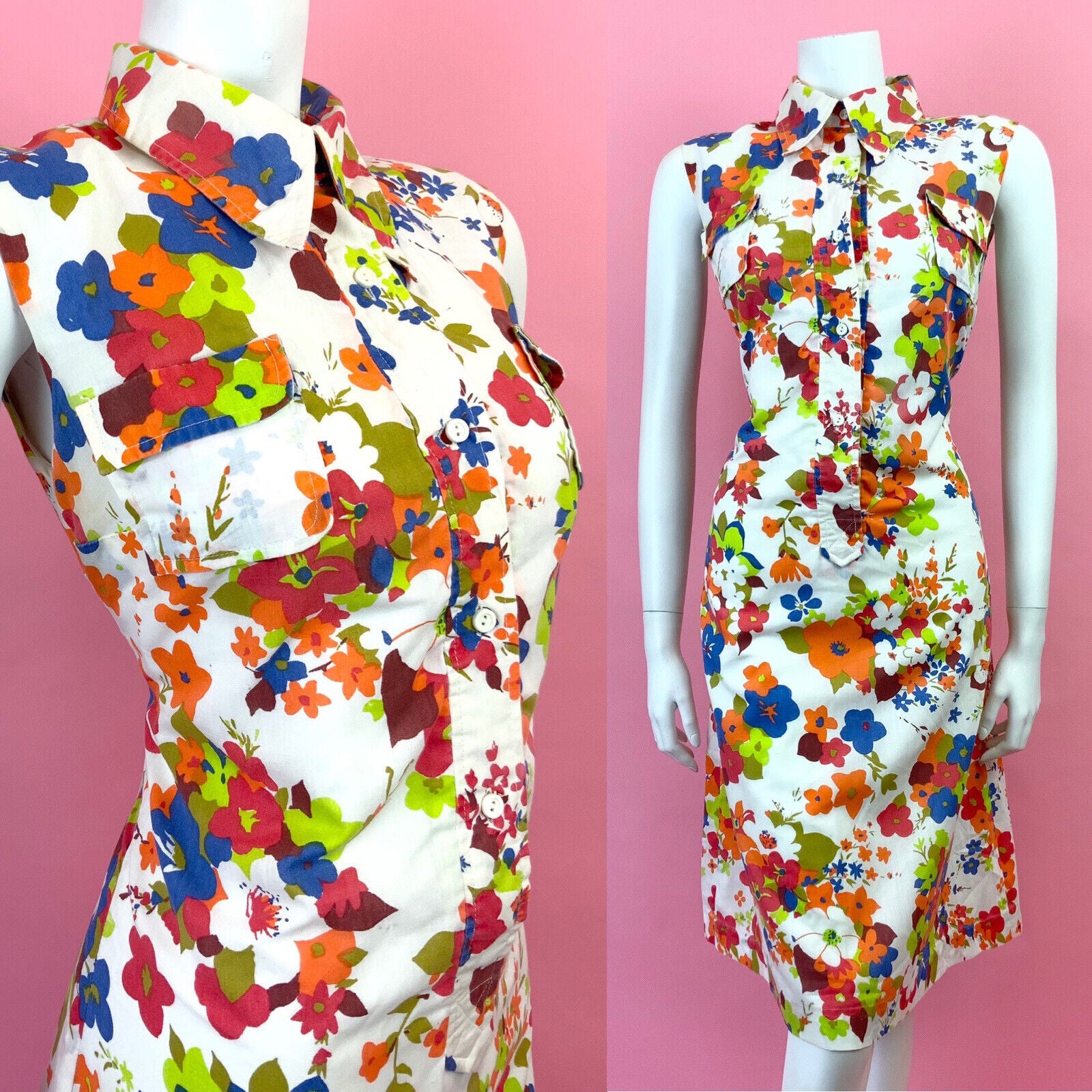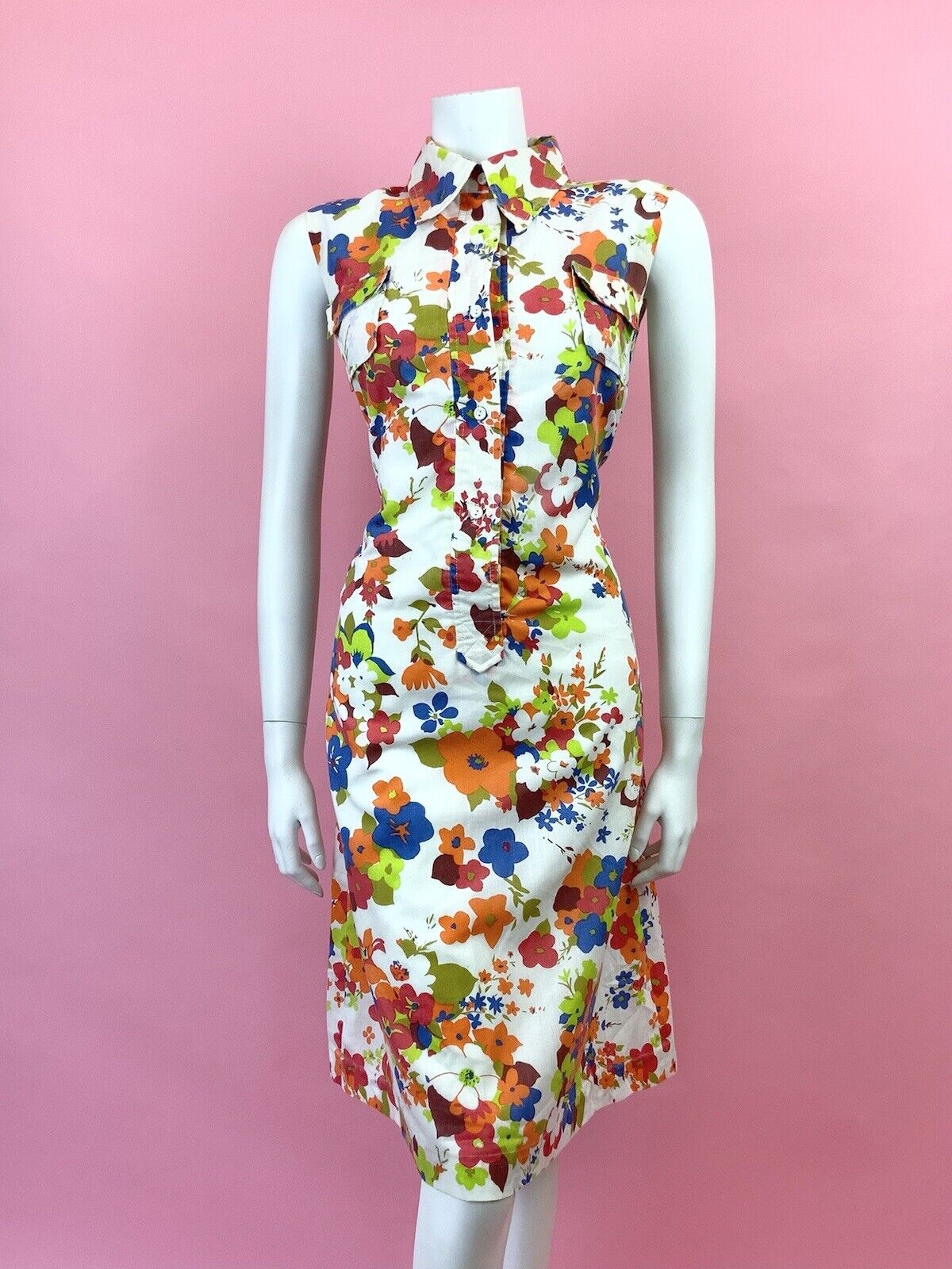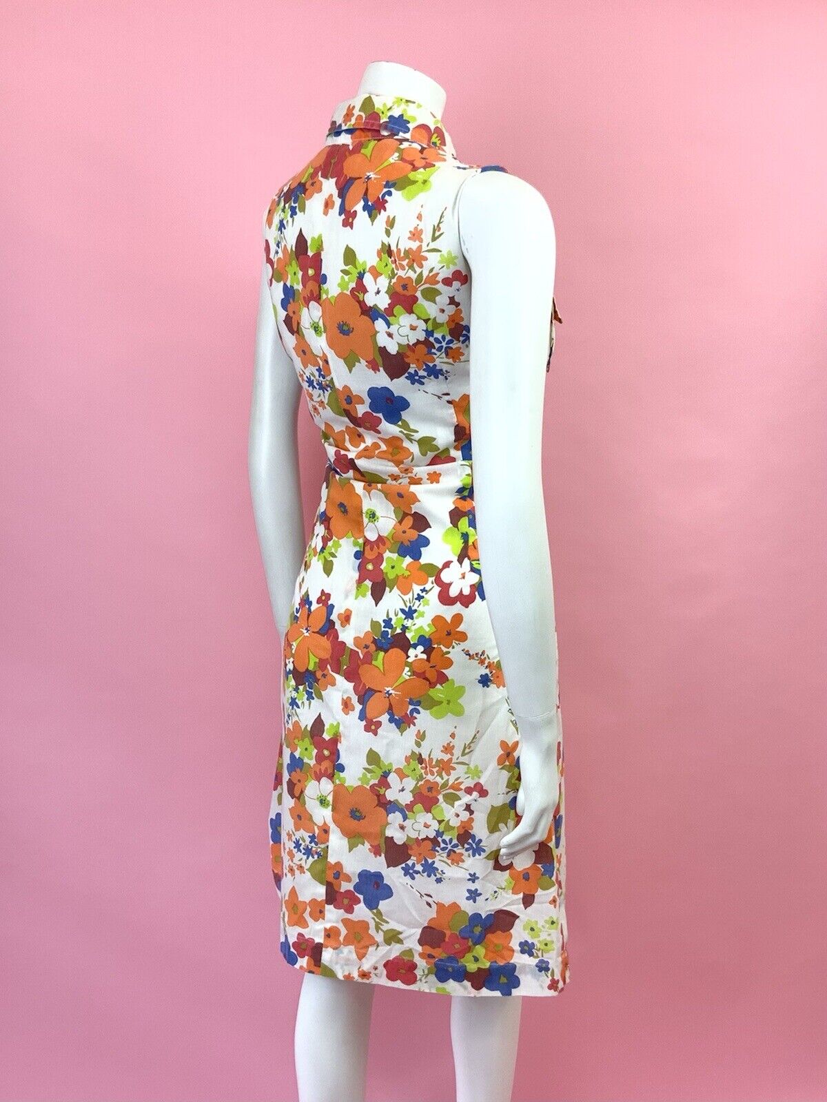 VINTAGE 60s 70s WHITE BLUE ORANGE RED FLORAL MOD SLEEVELESS DAGGER SHIRT 12