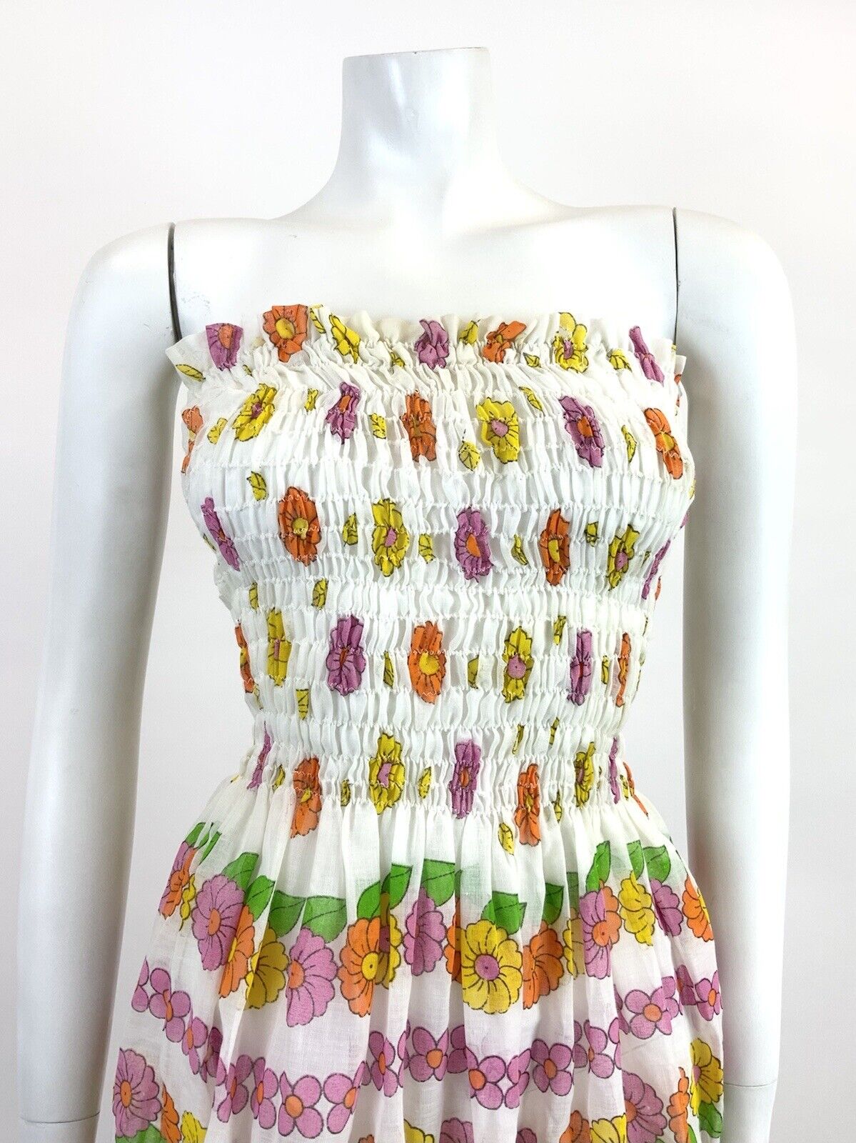 VINTAGE 60s 70s WHITE BLUE PINK ORANGE FLORAL SHIRRED STRAPLESS SUMMER DRESS 6 8