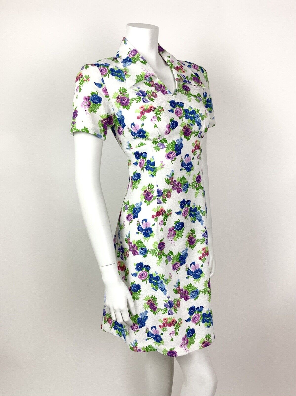 VINTAGE 60s 70s WHITE BLUE PURPLE GREEN FLORAL ROSE DAGGER COLLAR DRESS 10