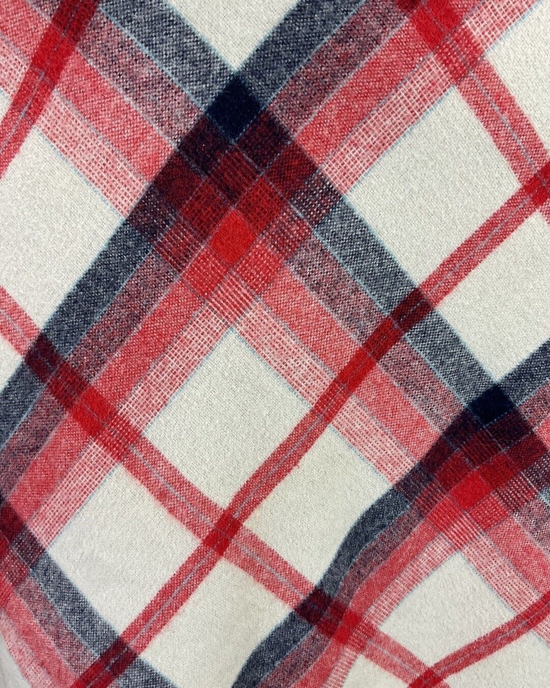 Detailing the fabric is a bold plaid checked pattern in red, blue, and cream.