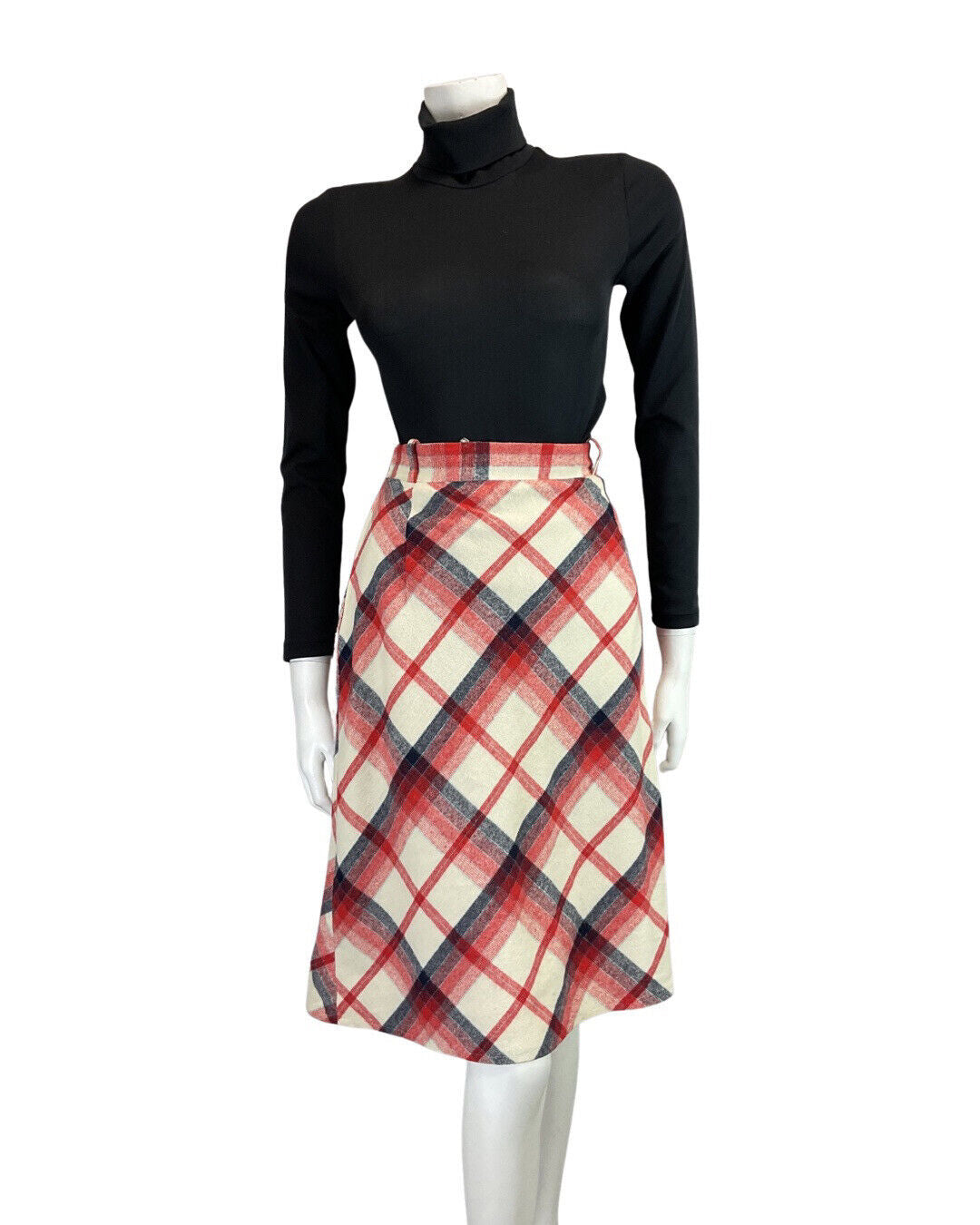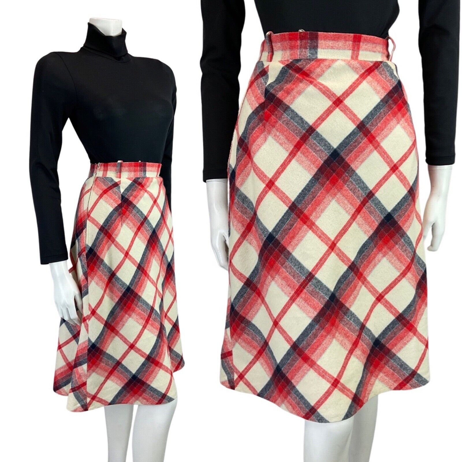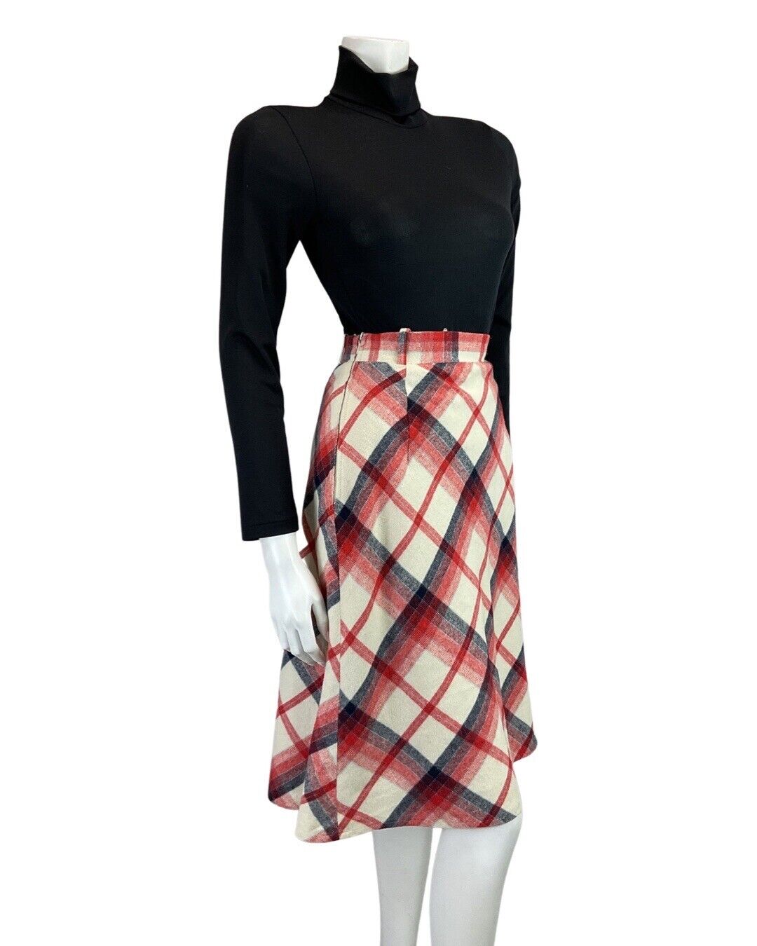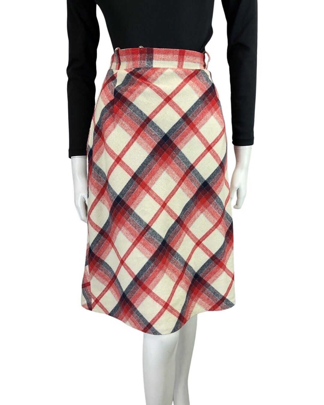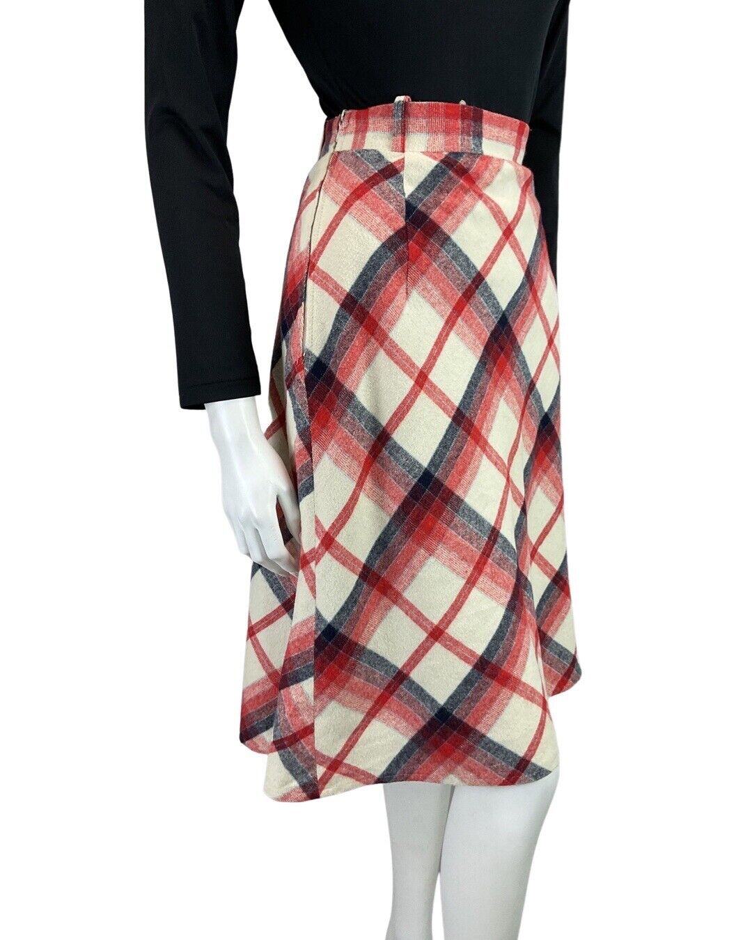 VINTAGE 60s 70s WHITE BLUE RED PLAID CHECKED WOOL KNEE-LENGTH SKIRT 8