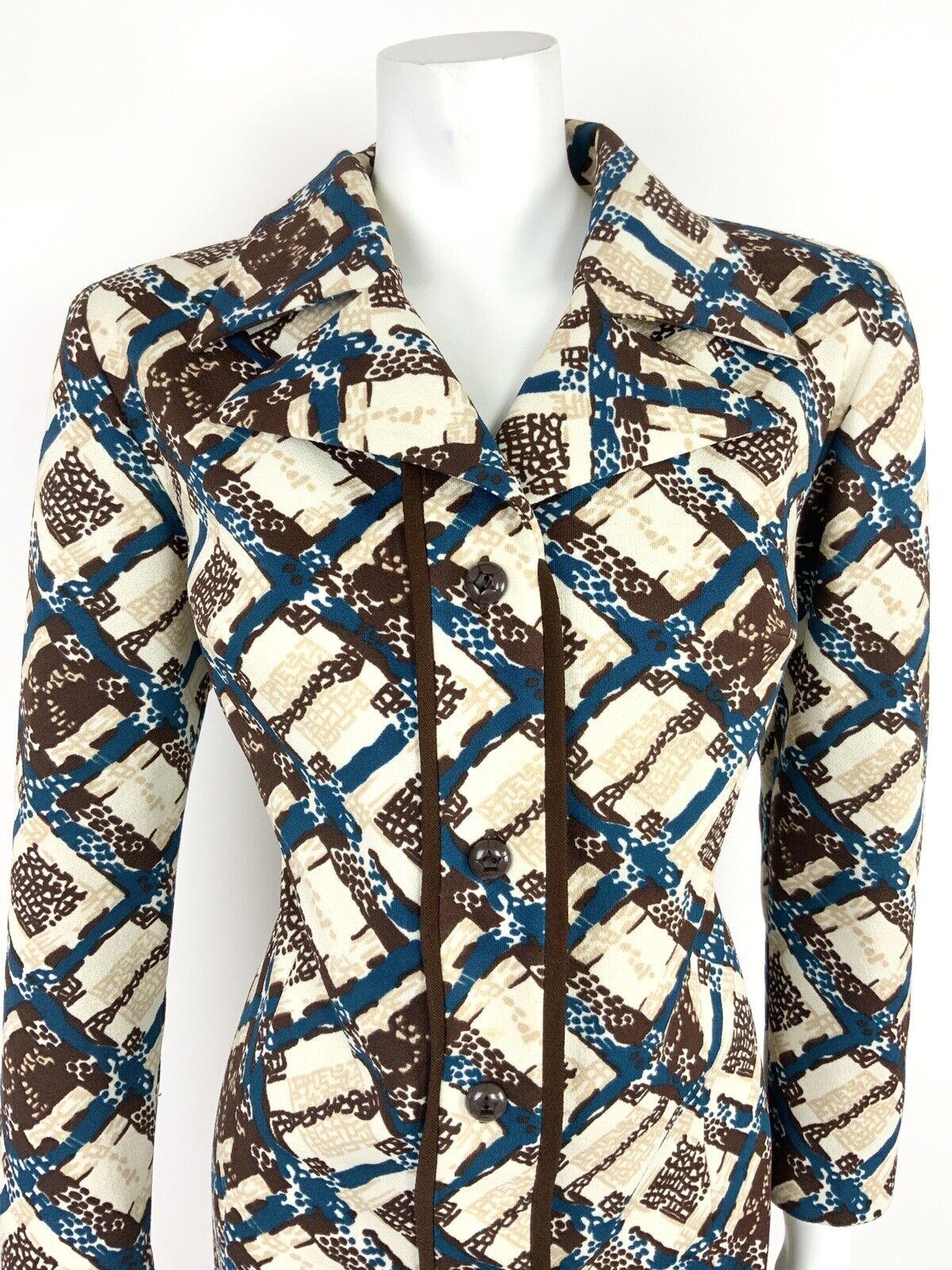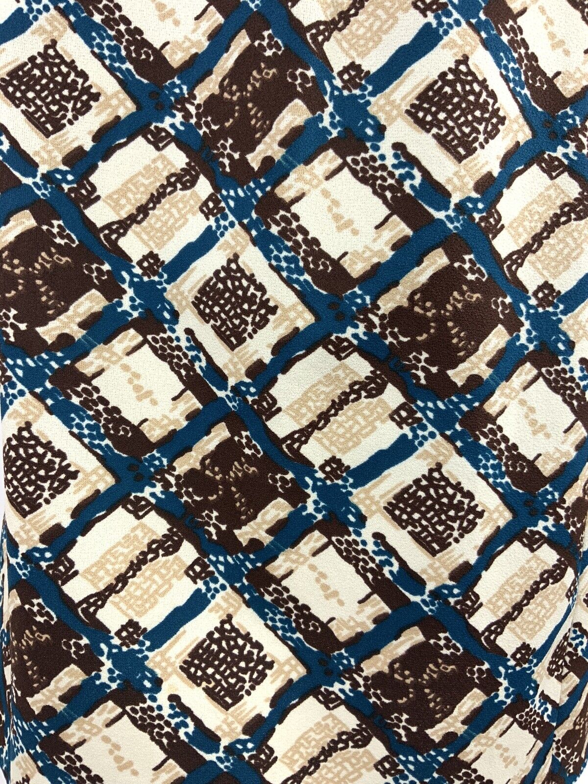 VINTAGE 60s 70s WHITE BROWN BLUE BEIGE GEOMETRIC PLAID SHIRT DRESS 14 16