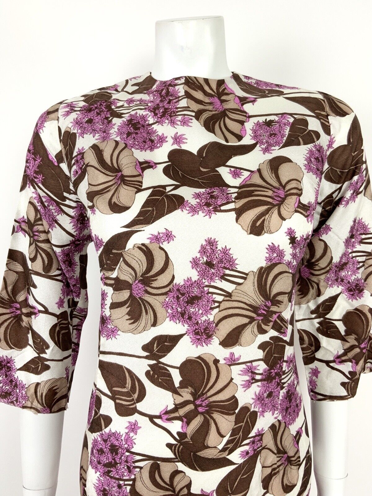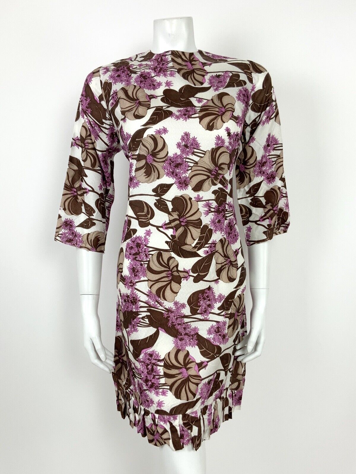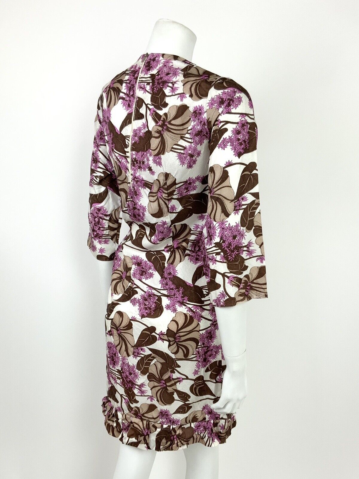 VINTAGE 60s 70s WHITE BROWN PINK FLORAL DITSY RUFFLE SHIFT DRESS 10 12
