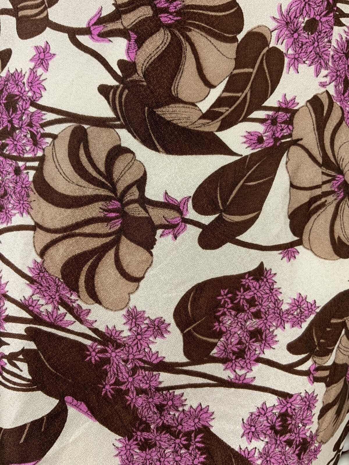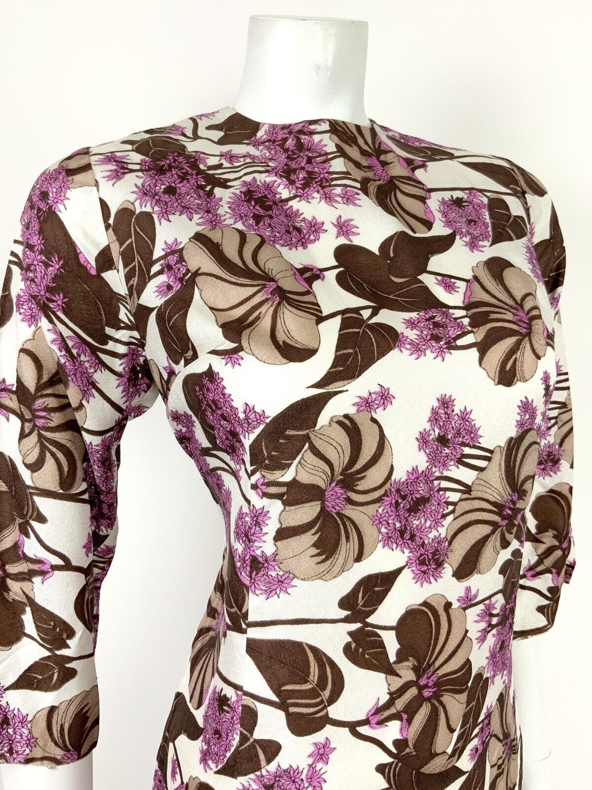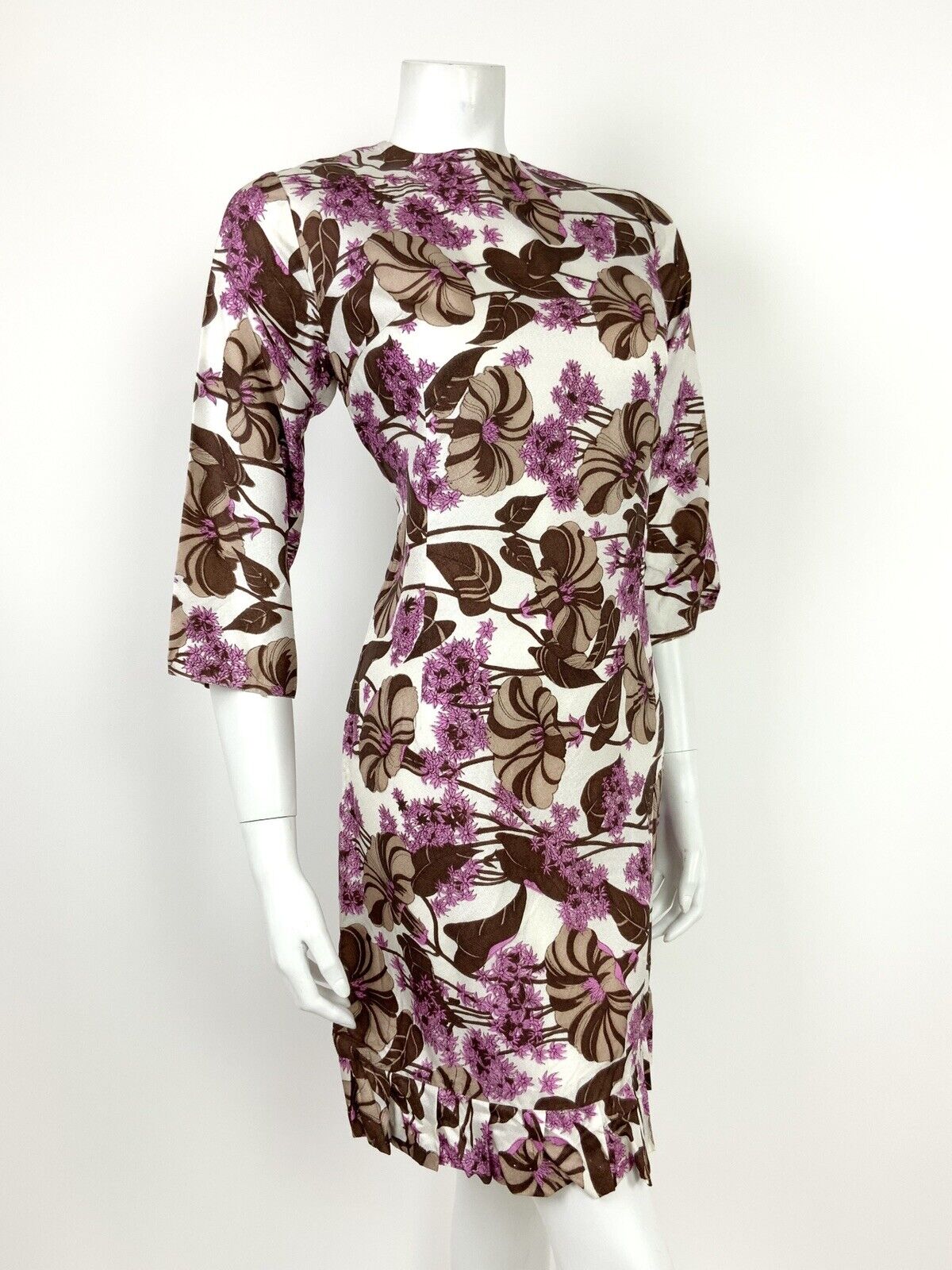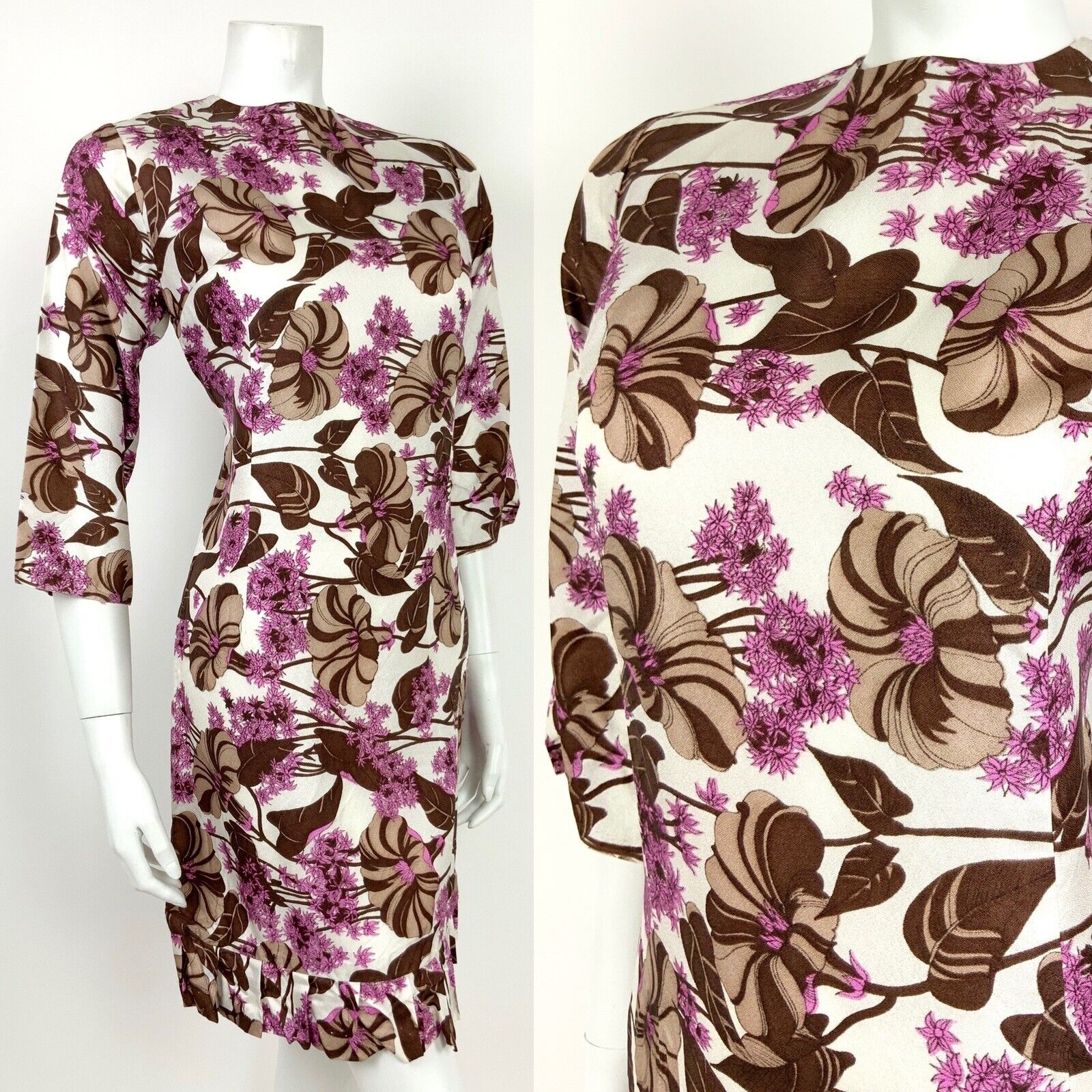 VINTAGE 60s 70s WHITE BROWN PINK FLORAL DITSY RUFFLE SHIFT DRESS 10 12