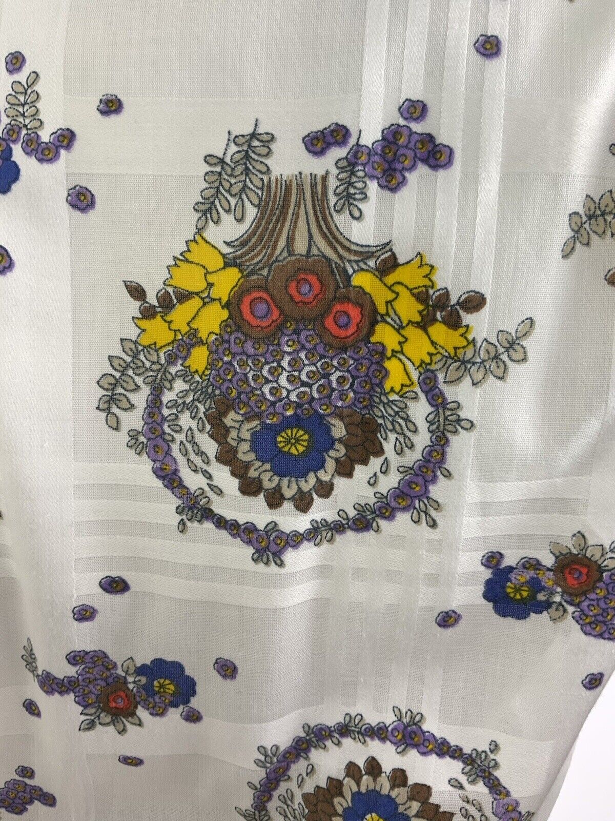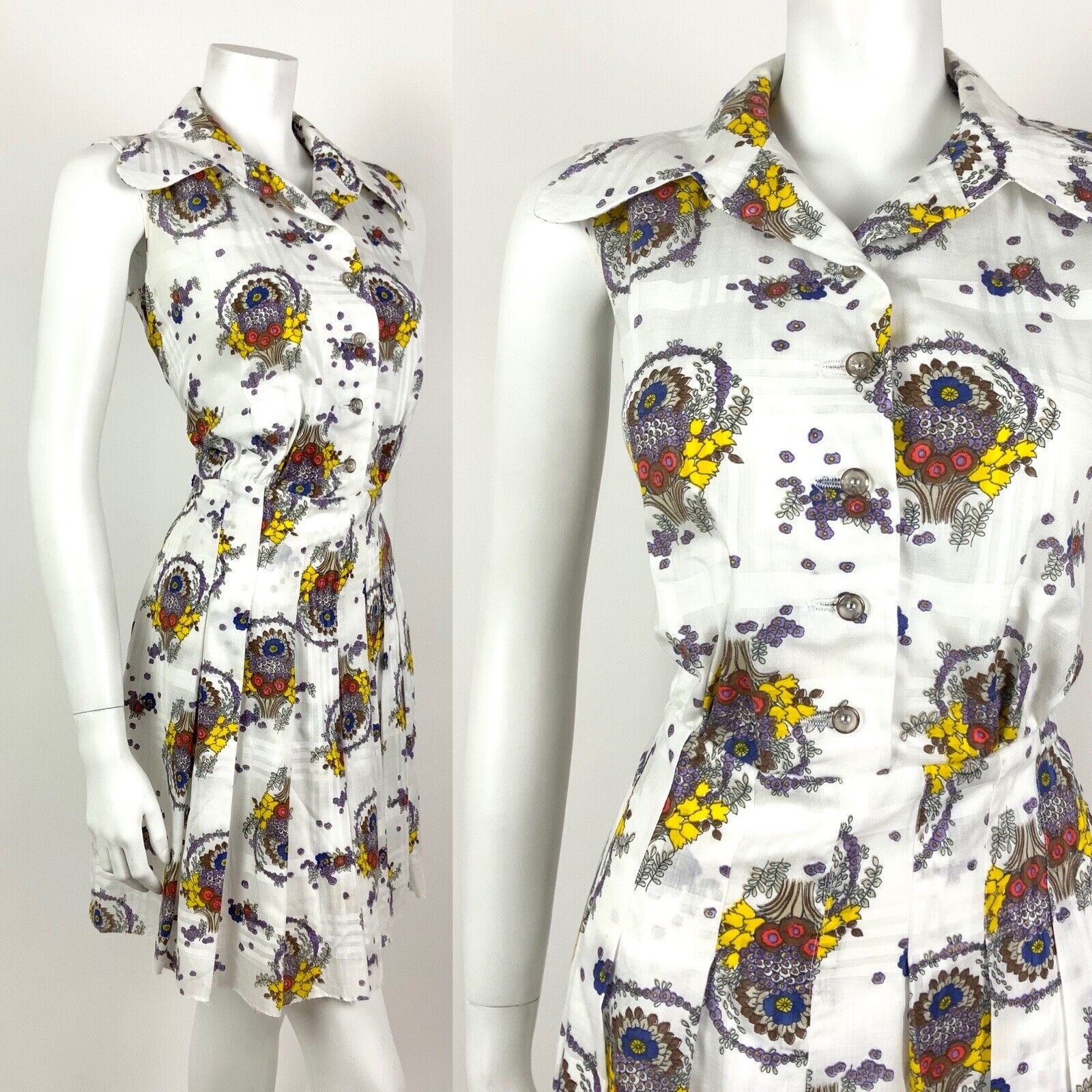 VINTAGE 60s 70s WHITE BROWN YELLOW PLAID FLORAL SPOON COLLAR SHIRT DRESS 12 14